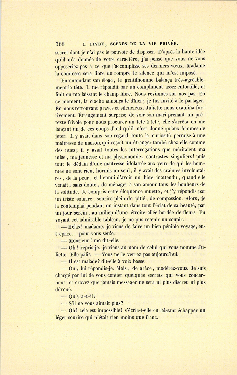 – Monsieur, en m’adressant d’abord à vous, lui dis-je, j’ai rempli un devoir. Je ne voulais pas m’acquitter de cette mission donnée par un inconnu près de madame la comtesse sans vous en prévenir ; mais il m’a confié une espèce de fidéicommis honorable, un {p. 368} secret dont je n’ai pas le pouvoir de disposer. D’après la haute idée qu’il m’a donnée de votre caractère, j’ai pensé que vous ne vous opposeriez pas à ce que j’accomplisse ses derniers vœux. Madame la comtesse sera libre de rompre le silence qui m’est imposé.