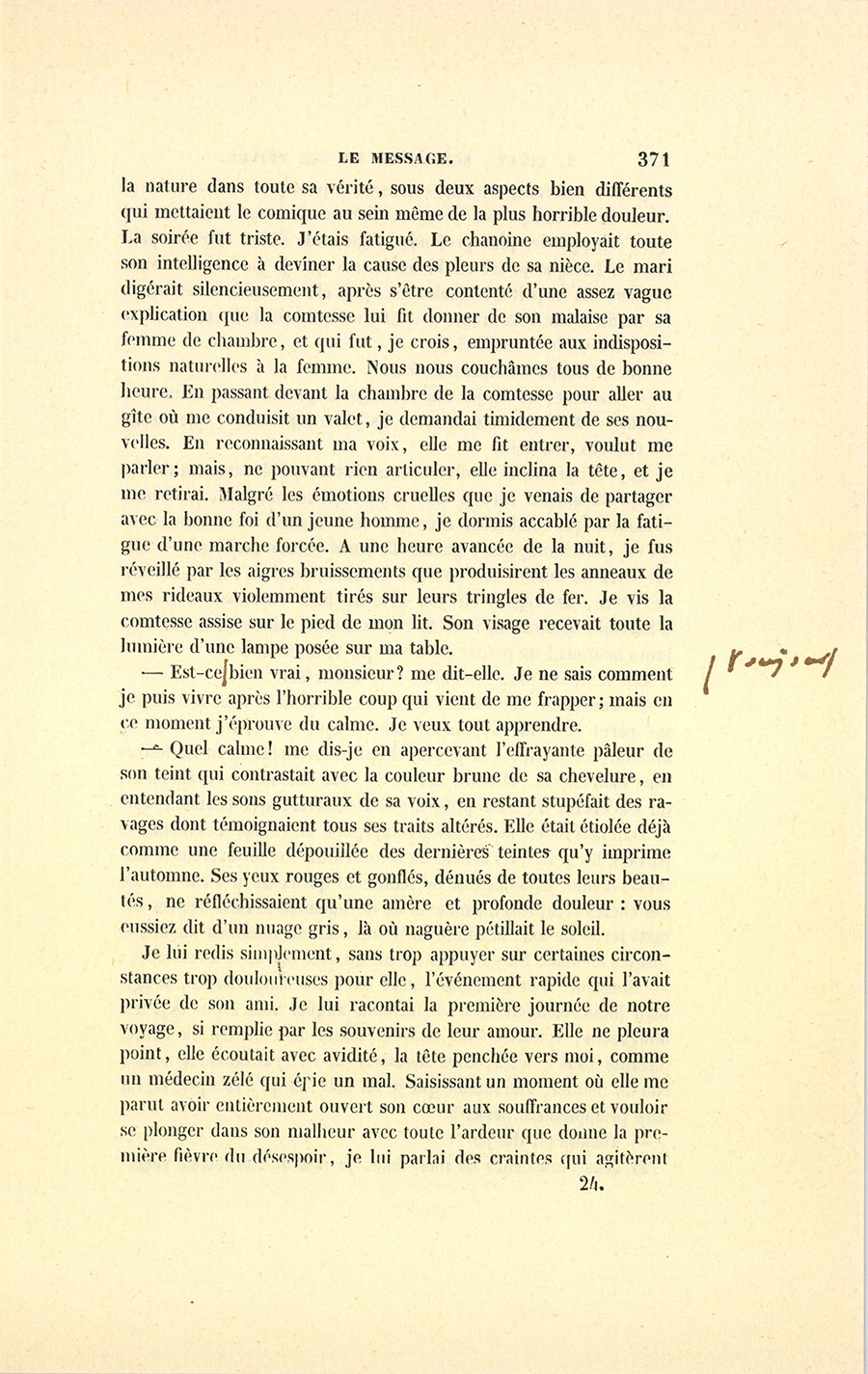 Enfin, aidé par la femme de chambre, je transportai Juliette dans sa chambre ; je recommandai soigneusement de veiller sur elle et de dire à tout le monde que la comtesse avait la migraine. Puis, nous redescendîmes, le chanoine et moi, dans la salle à manger. Il y avait déjà quelque temps que nous avions quitté le comte, je ne pensai guère à lui qu’au moment où je me trouvai sous le péristyle, son indifférence me surprit ; mais mon étonnement augmenta quand je le trouvai philosophiquement assis à table : il avait mangé presque tout le dîner, au grand plaisir de sa fille qui souriait de voir son père en flagrante désobéissance aux ordres de la comtesse. La singulière insouciance de ce mari me fut expliquée par la légère altercation qui s’éleva soudain entre le chanoine et lui. Le comte était soumis à une diète sévère que les médecins lui avaient imposée pour le guérir d’une maladie grave dont le nom m’échappe ; et, poussé par cette gloutonnerie féroce, assez familière aux convalescents, l’appétit de la bête l’avait emporté chez lui sur toutes les sensibilités de l’homme. En un moment j’avais vu {p. 371} la nature dans toute sa vérité, sous deux aspects bien différents qui mettaient le comique au sein même de la plus horrible douleur. La soirée fut triste. J’étais fatigué. Le chanoine employait toute son intelligence à deviner la cause des pleurs de sa nièce. Le mari digérait silencieusement, après s’être contenté d’une assez vague explication que la comtesse lui fit donner de son malaise par sa femme de chambre, et qui fut, je crois, empruntée aux indispositions naturelles à la femme. Nous nous couchâmes tous de bonne heure. En passant devant la chambre de la comtesse pour aller au gîte où me conduisit un valet, je demandai timidement de ses nouvelles. En reconnaissant ma voix, elle me fit entrer, voulut me parler ; mais, ne pouvant rien articuler, elle inclina la tête, et je me retirai. Malgré les émotions cruelles que je venais de partager avec la bonne foi d’un jeune homme, je dormis accablé par la fatigue d’une marche forcée. À une heure avancée de la nuit, je fus réveillé par les aigres bruissements que produisirent les anneaux de mes rideaux violemment tirés sur leurs tringles de fer. Je vis la comtesse assise sur le pied de mon lit. Son visage recevait toute la lumière d’une lampe posée sur ma table.