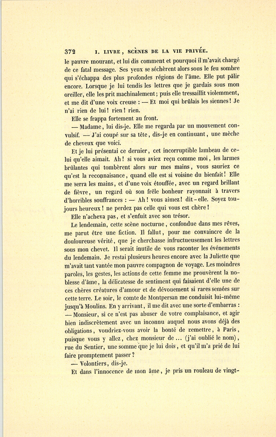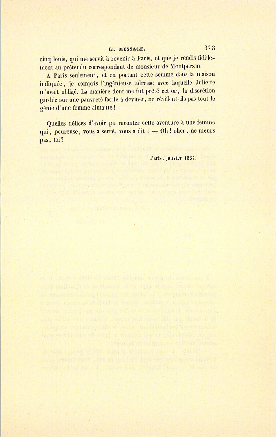 Et dans l’innocence de mon âme, je pris un rouleau de {p. 373} vingt-cinq louis, qui me servit à revenir à Paris, et que je rendis fidèlement au prétendu correspondant de monsieur de Montpersan.