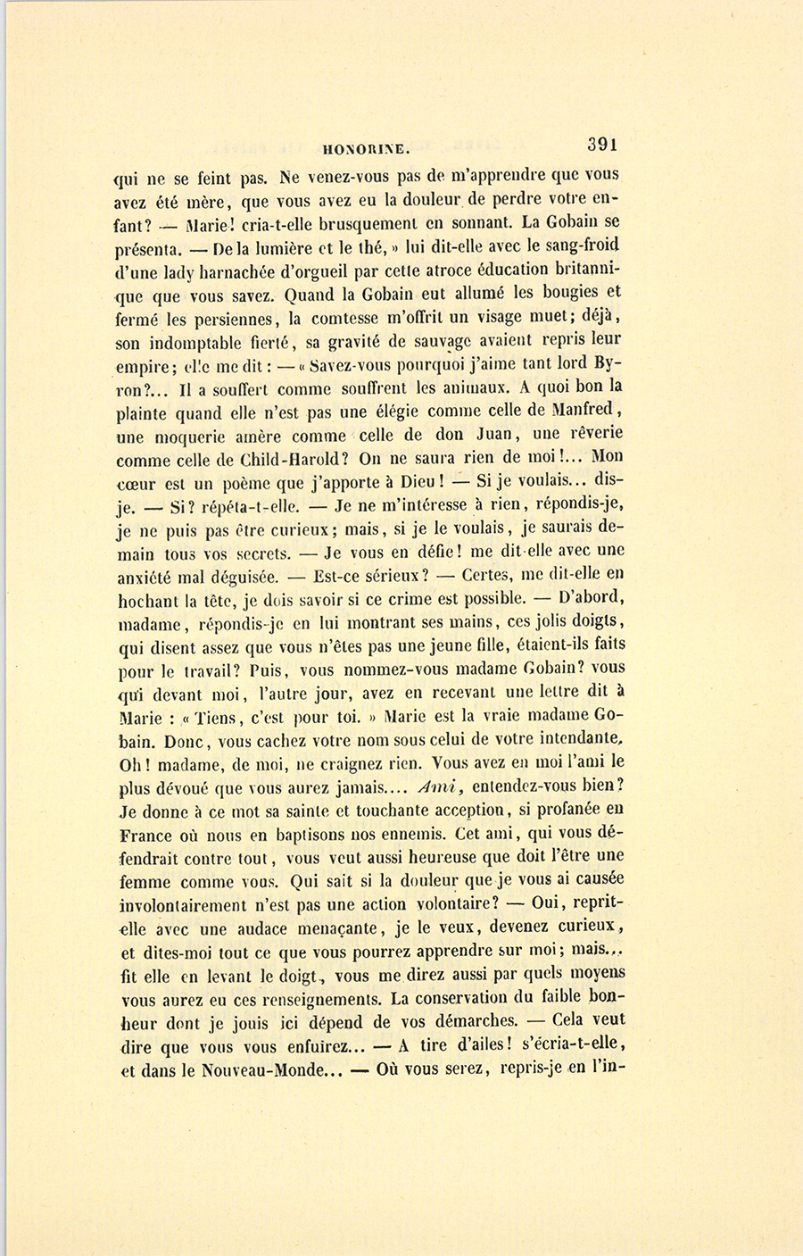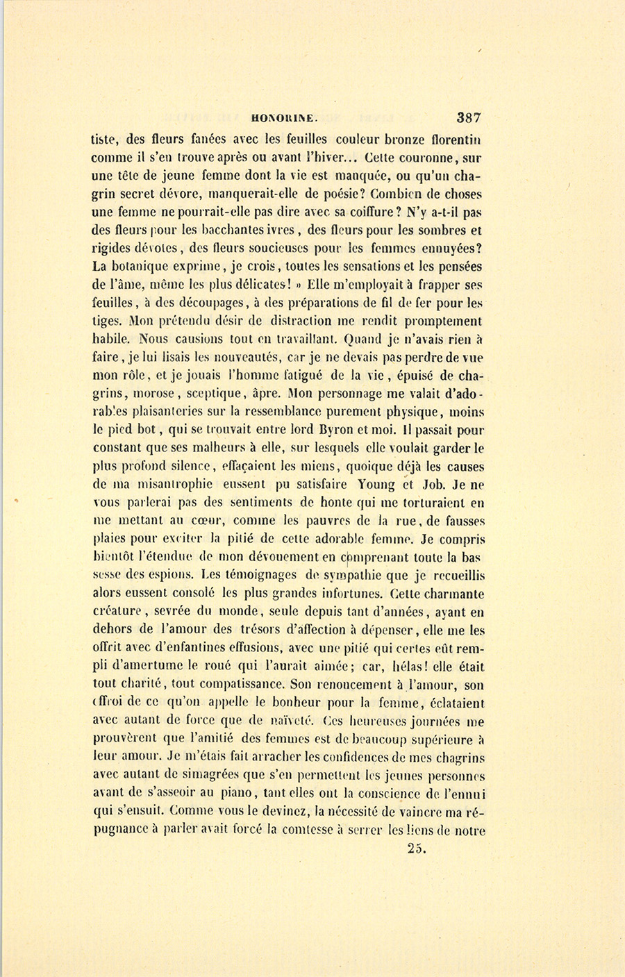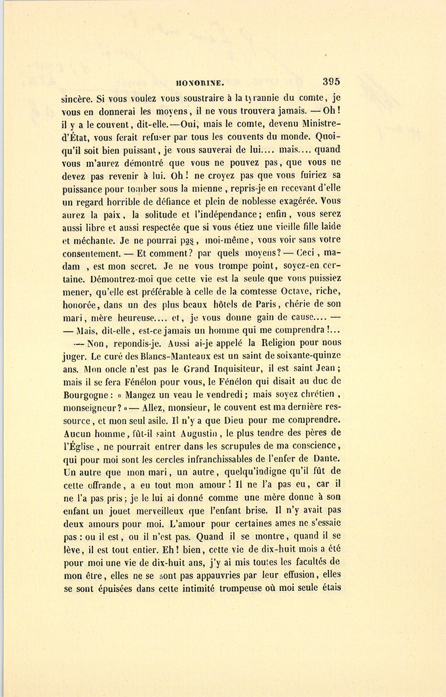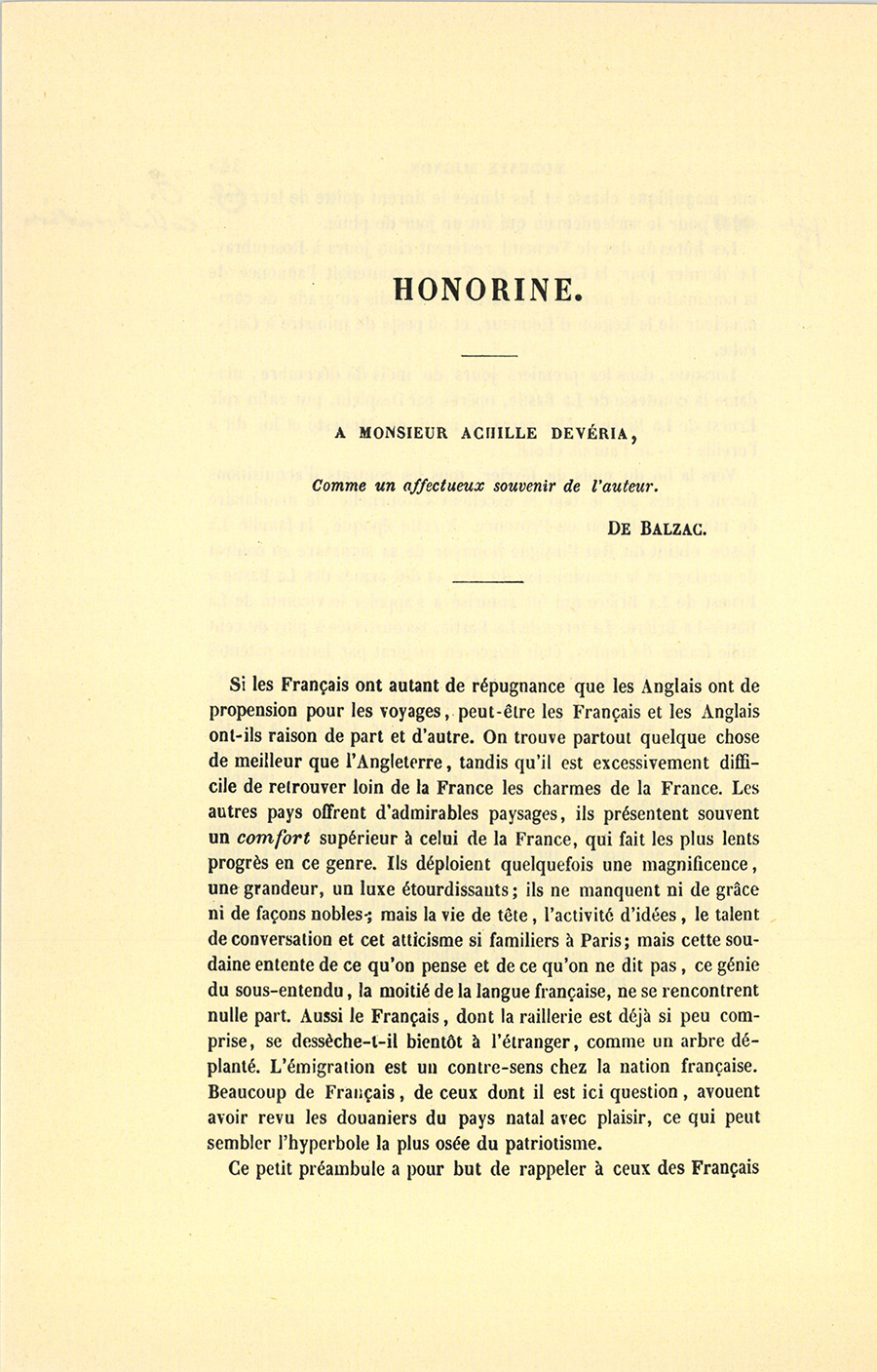 – La comtesse Honorine n’est pas la seule de son espèce, répondit l’ambassadeur à mademoiselle des Touches. Un homme, voire même un homme politique, un acerbe écrivain fut l’objet d’un amour de ce genre, et le coup de pistolet qui l’a tué n’a pas atteint que lui : celle qu’il aimait s’est comme cloîtrée.