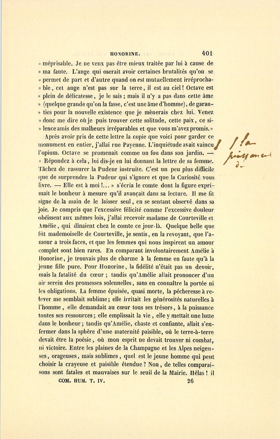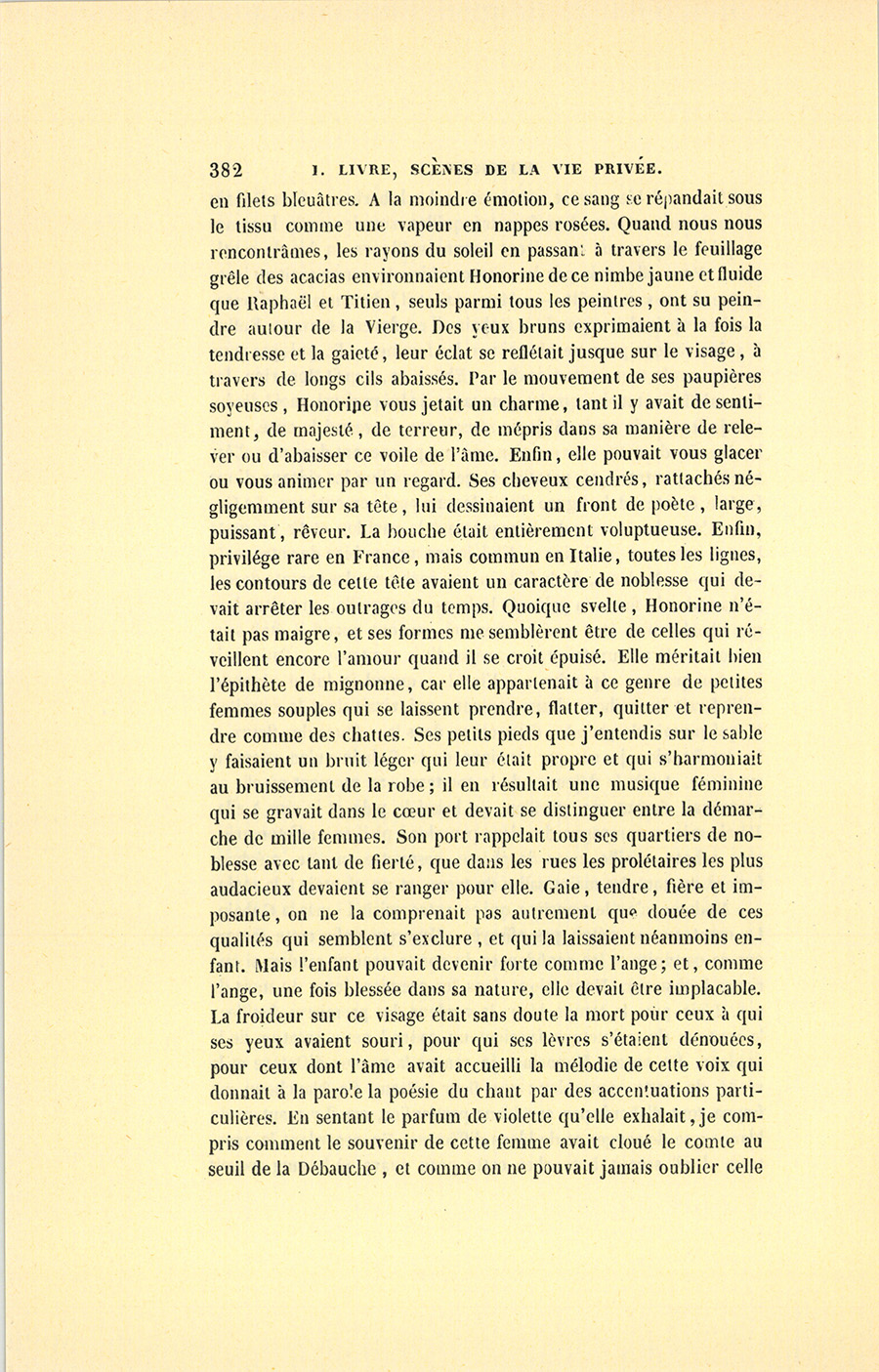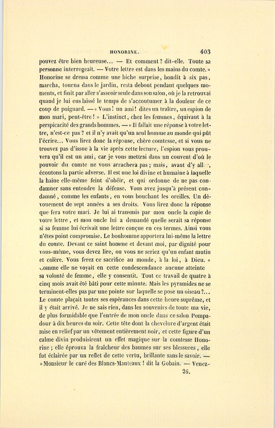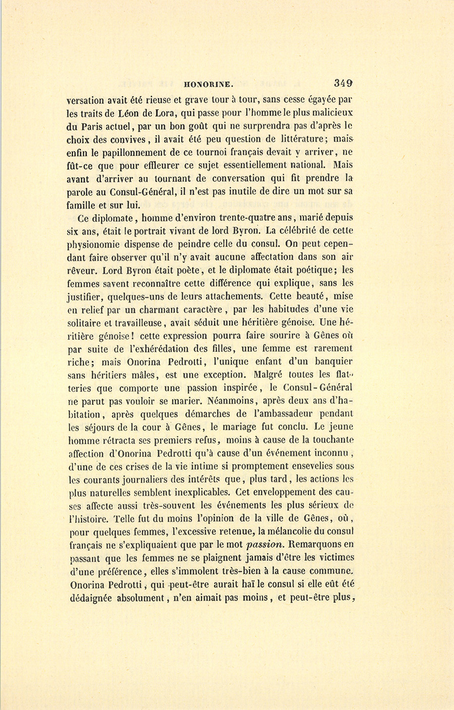 – La comtesse Honorine n’est pas la seule de son espèce, répondit l’ambassadeur à mademoiselle des Touches. Un homme, voire même un homme politique, un acerbe écrivain fut l’objet d’un amour de ce genre, et le coup de pistolet qui l’a tué n’a pas atteint que lui : celle qu’il aimait s’est comme cloîtrée.