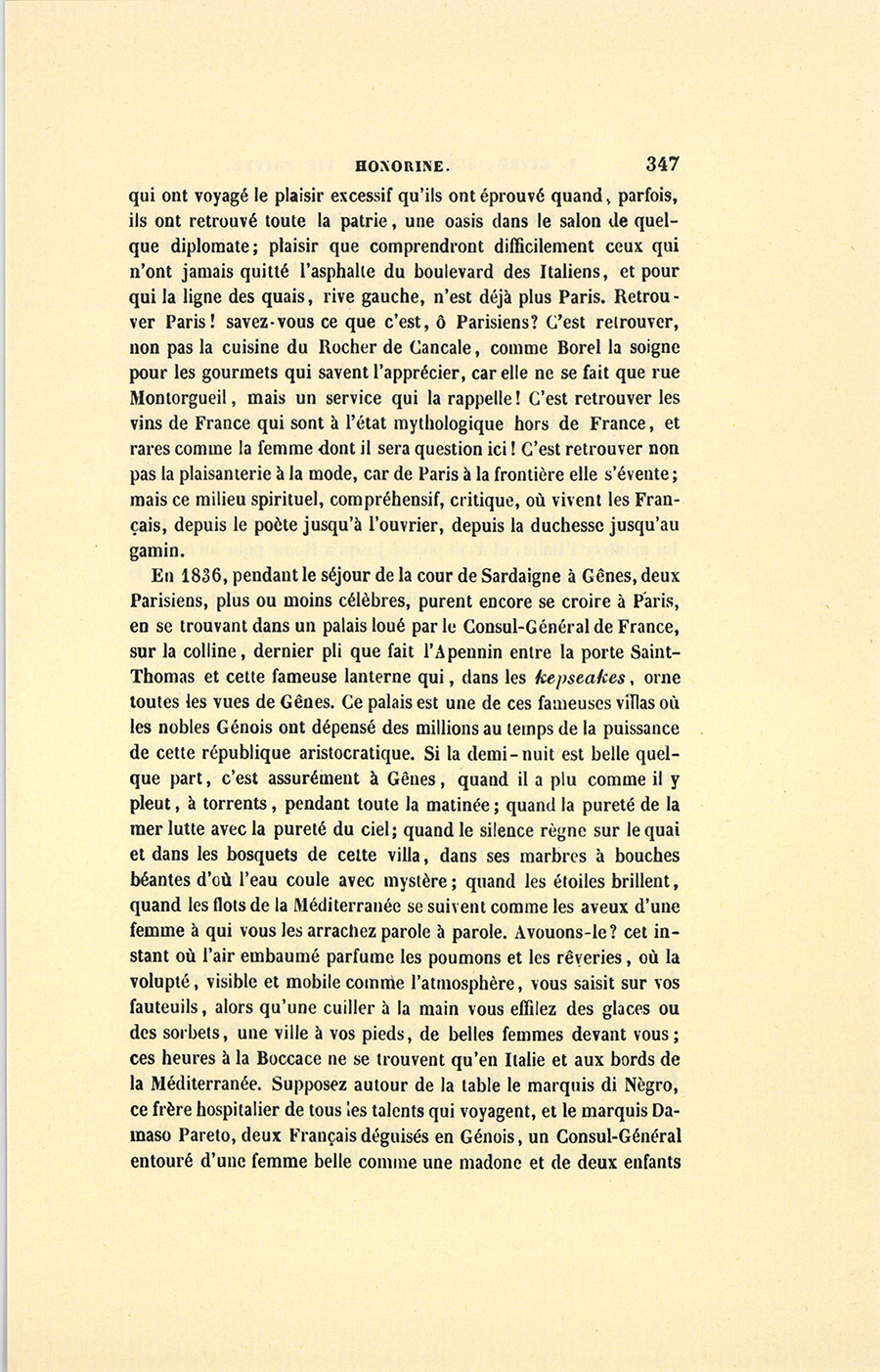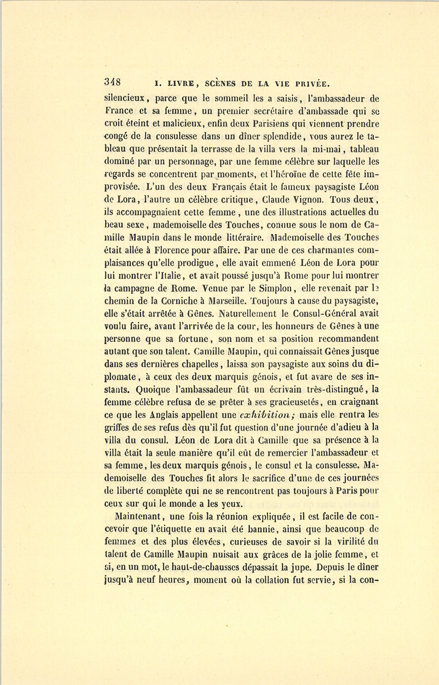 En 1836, pendant le séjour de la cour de Sardaigne à Gênes, deux Parisiens, plus ou moins célèbres, purent encore se croire à Paris, en se trouvant dans un palais loué par le Consul-Général de France, sur la colline, dernier pli que fait l’Apennin entre la porte Saint-Thomas et cette fameuse lanterne qui, dans les kepseakes, orne toutes les vues de Gênes. Ce palais est une de ces fameuses villas où les nobles Génois ont dépensé des millions au temps de la puissance de cette république aristocratique. Si la demi-nuit est belle quelque part, c’est assurément à Gênes, quand il a plu comme il y pleut, à torrents, pendant toute la matinée ; quand la pureté de la mer lutte avec la pureté du ciel ; quand le silence règne sur le quai et dans les bosquets de cette villa, dans ses marbres à bouches béantes d’où l’eau coule avec mystère ; quand les étoiles brillent, quand les flots de la Méditerranée se suivent comme les aveux d’une femme à qui vous les arrachez parole à parole. Avouons-le ? cet instant où l’air embaumé parfume les poumons et les rêveries, où la volupté, visible et mobile comme l’atmosphère, vous saisit sur vos fauteuils, alors qu’une cuiller à la main vous effilez des glaces ou des sorbets, une ville à vos pieds, de belles femmes devant vous ; ces heures à la Boccace ne se trouvent qu’en Italie et aux bords de la Méditerranée. Supposez autour de la table le marquis di Nègro, ce frère hospitalier de tous les talents qui voyagent, et le marquis Damaso Pareto, deux Français déguisés en Génois, un Consul-Général entouré d’une femme belle comme une madone et de deux enfants {p. 348} silencieux, parce que le sommeil les a saisis, l’ambassadeur de France et sa femme, un premier secrétaire d’ambassade qui se croit éteint et malicieux, enfin deux Parisiens qui viennent prendre congé de la consulesse dans un dîner splendide, vous aurez le tableau que présentait la terrasse de la villa vers la mi-mai, tableau dominé par un personnage, par une femme célèbre sur laquelle les regards se concentrent par moments, et l’héroïne de cette fête improvisée. L’un des deux Français était le fameux paysagiste Léon de Lora, l’autre un célèbre critique, Claude Vignon. Tous deux, ils accompagnaient cette femme, une des illustrations actuelles du beau sexe, mademoiselle des Touches, connue sous le nom de Camille Maupin dans le monde littéraire. Mademoiselle des Touches était allée à Florence pour affaire. Par une de ces charmantes complaisances qu’elle prodigue, elle avait emmené Léon de Lora pour lui montrer l’Italie, et avait poussé jusqu’à Rome pour lui montrer la campagne de Rome. Venue par le Simplon, elle revenait par le chemin de la Corniche à Marseille. Toujours à cause du paysagiste, elle s’était arrêtée à Gênes. Naturellement le Consul-Général avait voulu faire, avant l’arrivée de la cour, les honneurs de Gênes à une personne que sa fortune, son nom et sa position recommandent autant que son talent. Camille Maupin, qui connaissait Gênes jusque dans ses dernières chapelles, laissa son paysagiste aux soins du diplomate, à ceux des deux marquis génois, et fut avare de ses instants. Quoique l’ambassadeur fût un écrivain très-distingué, la femme célèbre refusa de se prêter à ses gracieusetés, en craignant ce que les Anglais appellent une exhibition ; mais elle rentra les griffes de ses refus dès qu’il fut question d’une journée d’adieu à la villa du consul. Léon de Lora dit à Camille que sa présence à la villa était la seule manière qu’il eût de remercier l’ambassadeur et sa femme, les deux marquis génois, le consul et la consulesse. Mademoiselle des Touches fit alors le sacrifice d’une de ces journées de liberté complète qui ne se rencontrent pas toujours à Paris pour ceux sur qui le monde a les yeux.