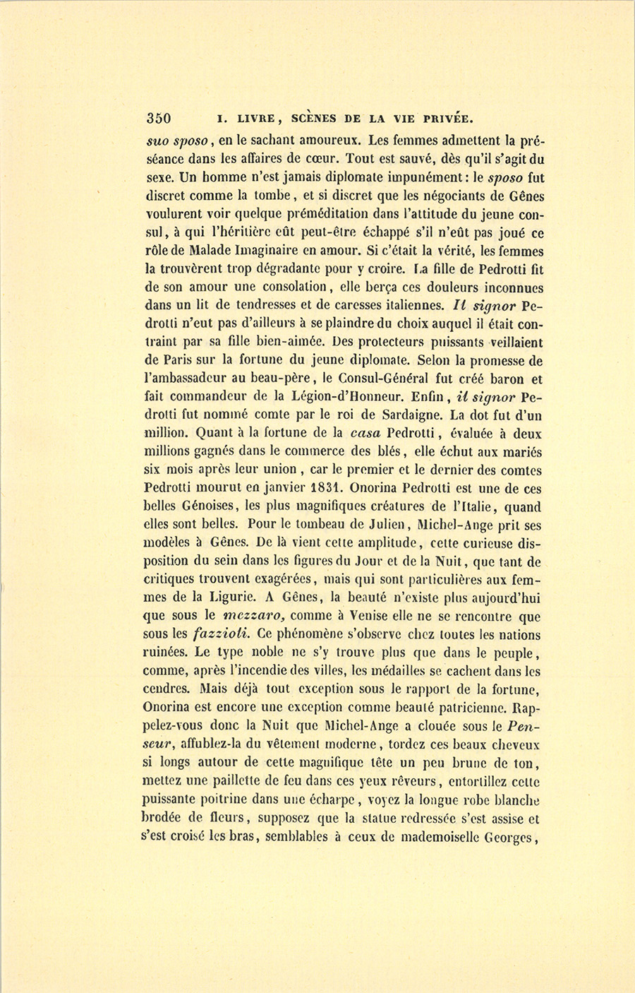 Ce diplomate, homme d’environ trente-quatre ans, marié depuis six ans, était le portrait vivant de lord Byron. La célébrité de cette physionomie dispense de peindre celle du consul. On peut cependant faire observer qu’il n’y avait aucune affectation dans son air rêveur. Lord Byron était poète, et le diplomate était poétique ; les femmes savent reconnaître cette différence qui explique, sans les justifier, quelques-uns de leurs attachements. Cette beauté, mise en relief par un charmant caractère, par les habitudes d’une vie solitaire et travailleuse, avait séduit une héritière génoise. Une héritière génoise ! cette expression pourra faire sourire à Gênes où par suite de l’exhérédation des filles, une femme est rarement riche, mais Onorina Pedrotti, l’unique enfant d’un banquier sans héritiers mâles, est une exception. Malgré toutes les flatteries que comporte une passion inspirée, le Consul-Général ne parut pas vouloir se marier. Néanmoins, après deux ans d’habitation, après quelques démarches de l’ambassadeur pendant les séjours de la cour à Gênes, le mariage fut conclu. Le jeune homme rétracta ses premiers refus, moins à cause de la touchante affection d’Onorina Pedrotti qu’à cause d’un événement inconnu, d’une de ces crises de la vie intime si promptement ensevelies sous les courants journaliers des intérêts que, plus tard, les actions les plus naturelles semblent inexplicables. Cet enveloppement des causes affecte aussi très-souvent les événements les plus sérieux de l’histoire. Telle fut du moins l’opinion de la ville de Gênes, où, pour quelques femmes, l’excessive retenue, la mélancolie du consul français ne s’expliquaient que par le mot passion. Remarquons en passant que les femmes ne se plaignent jamais d’être les victimes d’une préférence, elles s’immolent très-bien à la cause commune. Onorina Pedrotti, qui peut-être aurait haï le consul si elle eût été dédaignée absolument, n’en aimait pas moins, et peut-être plus, {p. 350} suo sposo, en le sachant amoureux. Les femmes admettent la préséance dans les affaires de cœur. Tout est sauvé, dès qu’il s’agit du sexe. Un homme n’est jamais diplomate impunément : le sposo fut discret comme la tombe, et si discret que les négociants de Gênes voulurent voir quelque préméditation dans l’attitude du jeune consul, à qui l’héritière eût peut-être échappé s’il n’eût pas joué ce rôle de Malade Imaginaire en amour. Si c’était la vérité, les femmes la trouvèrent trop dégradante pour y croire. La fille de Pedrotti fit de son amour une consolation, elle berça ces douleurs inconnues dans un lit de tendresses et de caresses italiennes. Il signor Pedrotti n’eut pas d’ailleurs à se plaindre du choix auquel il était contraint par sa fille bien-aimée. Des protecteurs puissants veillaient de Paris sur la fortune du jeune diplomate. Selon la promesse de l’ambassadeur au beau-père, le Consul-Général fut créé baron et fait commandeur de la Légion-d’Honneur. Enfin, il signor Pedrotti fut nommé comte par le roi de Sardaigne. La dot fut d’un million. Quant à la fortune de la casa Pedrotti, évaluée à deux millions gagnés dans le commerce des blés, elle échut aux mariés six mois après leur union, car le premier et le dernier des comtes Pedrotti mourut en janvier 1831. Onorina Pedrotti est une de ces belles Génoises, les plus magnifiques créatures de l’Italie, quand elles sont belles. Pour le tombeau de Julien, Michel-Ange prit ses modèles à Gênes. De là vient cette amplitude, cette curieuse disposition du sein dans les figures du Jour et de la Nuit, que tant de critiques trouvent exagérées, mais qui sont particulières aux femmes de la Ligurie. À Gênes, la beauté n’existe plus aujourd’hui que sous le mezzaro, comme à Venise elle ne se rencontre que sous les fazzioli. Ce phénomène s’observe chez toutes les nations ruinées. Le type noble ne s’y trouve plus que dans le peuple, comme, après l’incendie des villes, les médailles se cachent dans les cendres. Mais déjà tout exception sous le rapport de la fortune, Onorina est encore une exception comme beauté patricienne. Rappelez-vous donc la Nuit que Michel-Ange a clouée sous le Penseur, affublez-la du vêtement moderne, tordez ces beaux cheveux si longs autour de cette magnifique tête un peu brune de ton, mettez une paillette de feu dans ces yeux rêveurs, entortillez cette puissante poitrine dans une écharpe, voyez la longue robe blanche brodée de fleurs, supposez que la statue redressée s’est assise et s’est croisé les bras, semblables à ceux de mademoiselle Georges, {p. 351} et vous aurez sous les yeux la consulesse avec un enfant de six ans, beau comme le désir d’une mère, et une petite fille de quatre ans sur les genoux, belle comme un type d’enfant laborieusement cherché par David le sculpteur pour l’ornement d’une tombe. Ce beau ménage fut l’objet de l’attention secrète de Camille. Mademoiselle des Touches trouvait au Consul un air un peu trop distrait chez un homme parfaitement heureux. Quoique pendant cette journée la femme et le mari lui eussent offert le spectacle admirable du bonheur le plus entier, Camille se demandait pourquoi l’un des hommes les plus distingués qu’elle eût rencontrés, et qu’elle avait vu dans les salons à Paris, restait Consul-Général à Gênes, quand il possédait une fortune de cent et quelques mille francs de rentes ! Mais elle avait aussi reconnu, par beaucoup de ces riens que les femmes ramassent avec l’intelligence du sage arabe dans Zadig, l’affection la plus fidèle chez le mari. Certes, ces deux beaux êtres s’aimeraient sans mécompte jusqu’à la fin de leurs jours. Camille se disait donc tour à tour : « – Qu’y a-t-il ? – Il n’y a rien ! » selon les apparences trompeuses du maintien chez le Consul-G