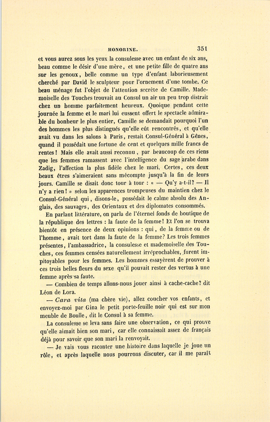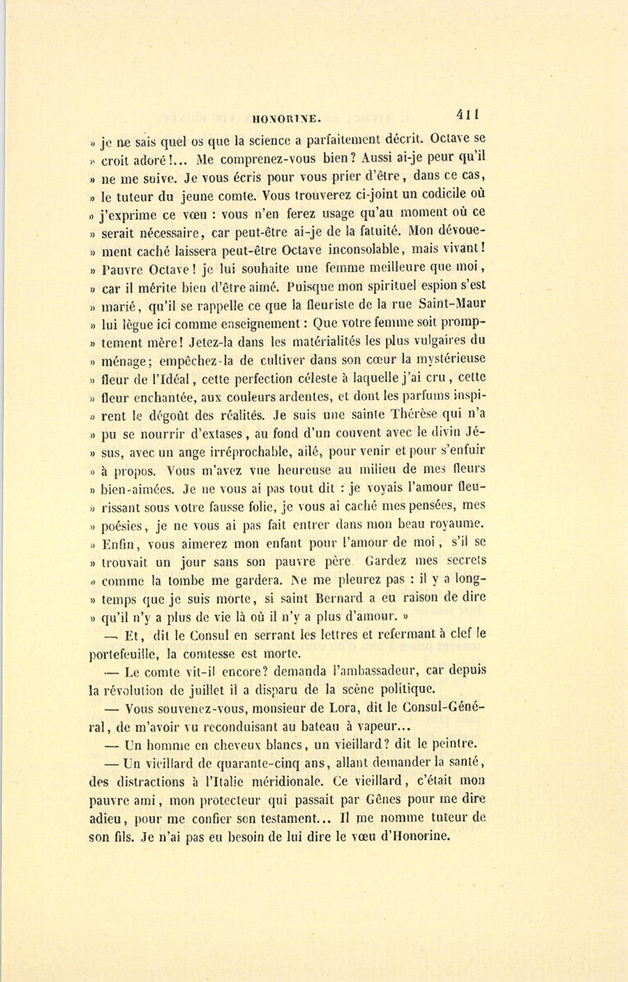 – Un vieillard de quarante-cinq ans, allant demander la santé, des distractions à l’Italie méridionale. Ce vieillard, c’était mon pauvre ami, mon protecteur qui passait par Gênes pour me dire adieu, pour me confier son testament… Il me nomme tuteur de son fils. Je n’ai pas eu besoin de lui dire le vœu d’Honorine.
