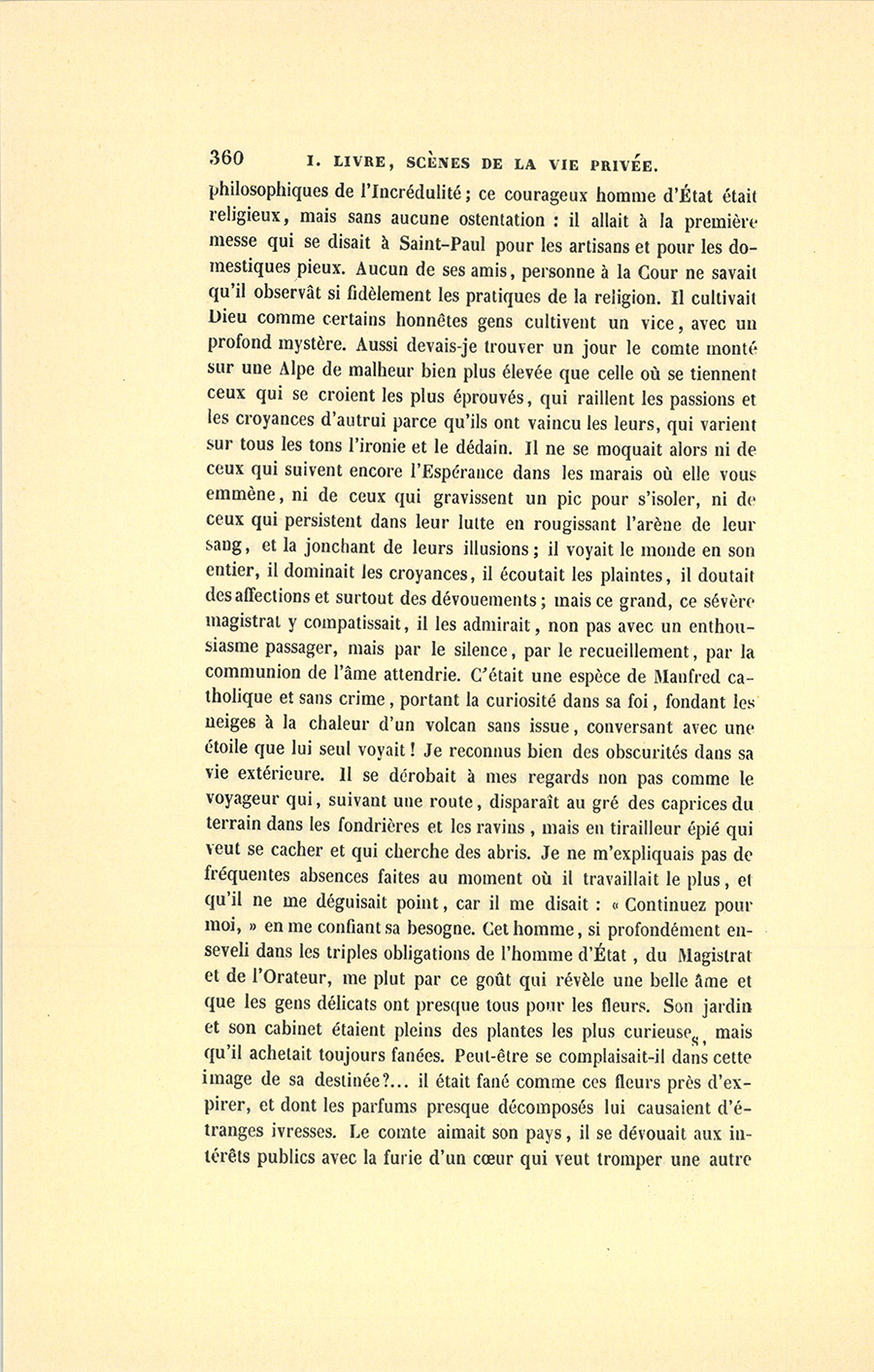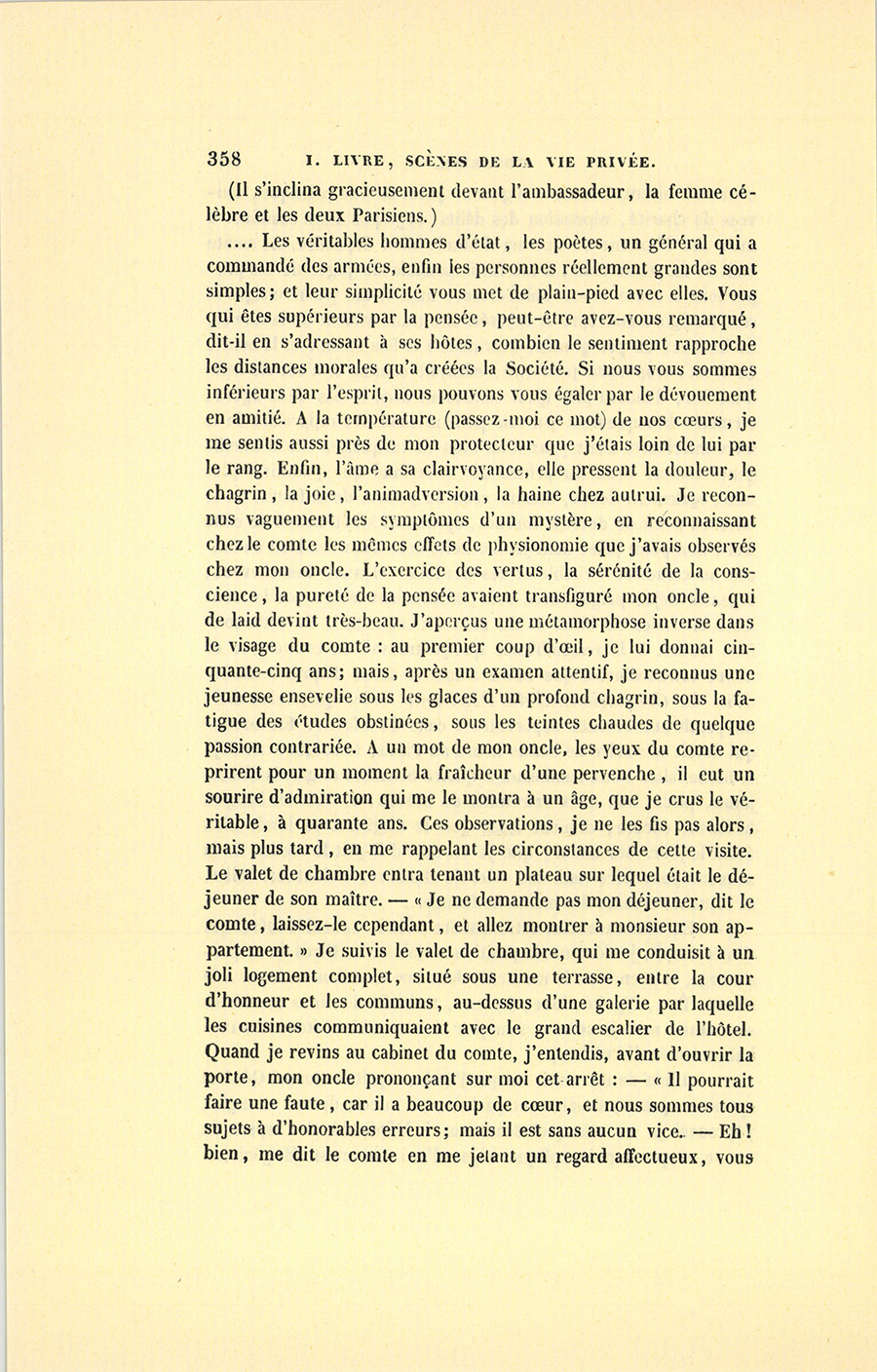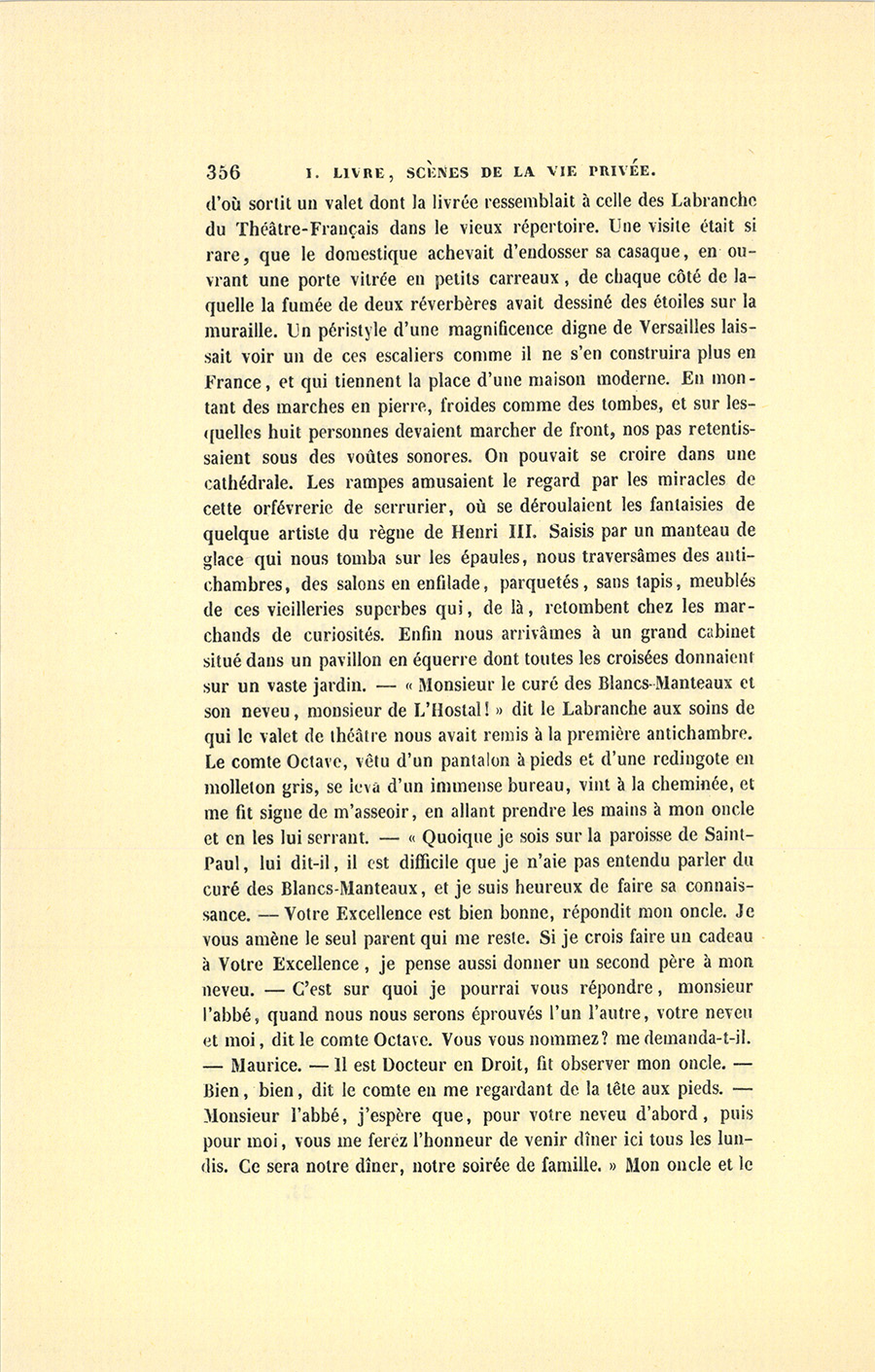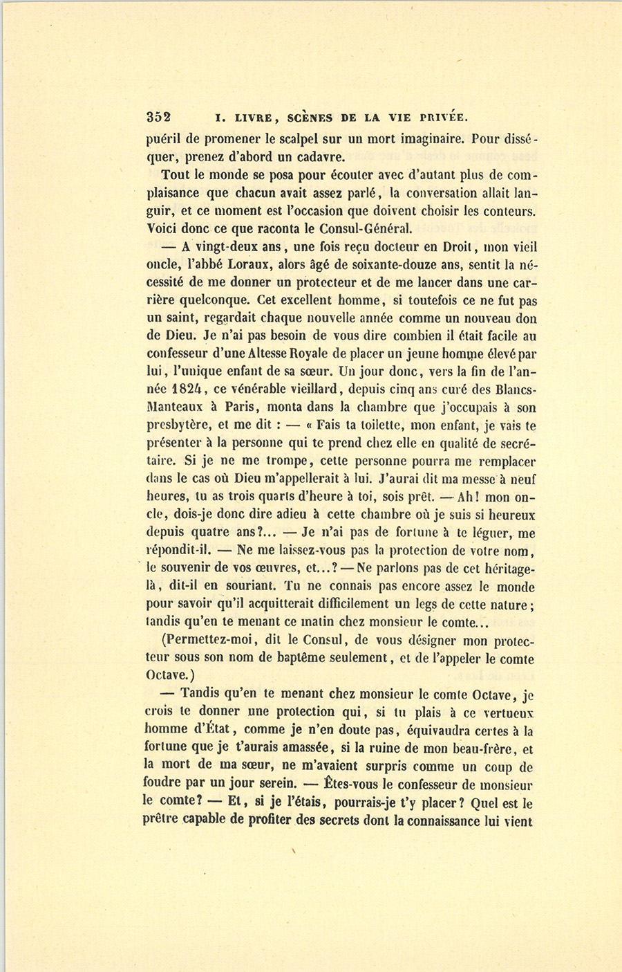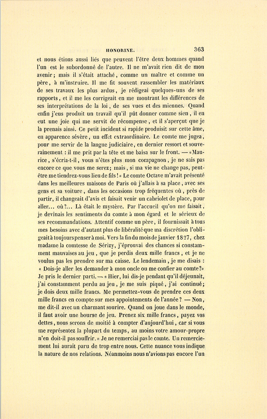 – À vingt-deux ans, une fois reçu docteur en Droit, mon vieil oncle, l’abbé Loraux, alors âgé de soixante-douze ans, sentit la nécessité de me donner un protecteur et de me lancer dans une carrière quelconque. [ill.] Cet excellent homme, si toutefois ce ne fut pas un saint, regardait chaque nouvelle année comme un nouveau don de Dieu. Je n’ai pas besoin de vous dire combien il était facile au confesseur d’une Altesse Royale de placer un jeune homme élevé par lui, l’unique enfant de sa sœur. Un jour donc, vers la fin de l’année 1824, ce vénérable vieillard, depuis cinq ans curé des Blancs-Manteaux à Paris, monta dans la chambre que j’occupais à son presbytère, et me dit : – « Fais ta toilette, mon enfant, je vais te présenter à la personne qui te prend chez elle en qualité de secrétaire. Si je ne me trompe, cette personne pourra me remplacer dans le cas où Dieu m’appellerait à lui. J’aurai dit ma messe à neuf heures, tu as trois quarts d’heure à toi, sois prêt. – Ah ! mon oncle, dois-je donc dire adieu à cette chambre où je suis si heureux depuis quatre ans ?… – Je n’ai pas de fortune à te léguer, me répondit-il. – Ne me laissez-vous pas la protection de votre nom, le souvenir de vos œuvres, et… ? – Ne parlons pas de cet héritage-là, dit-il en souriant. Tu ne connais pas encore assez le monde pour savoir qu’il acquitterait difficilement un legs de cette nature ; tandis qu’en te menant ce matin chez monsieur le comte…