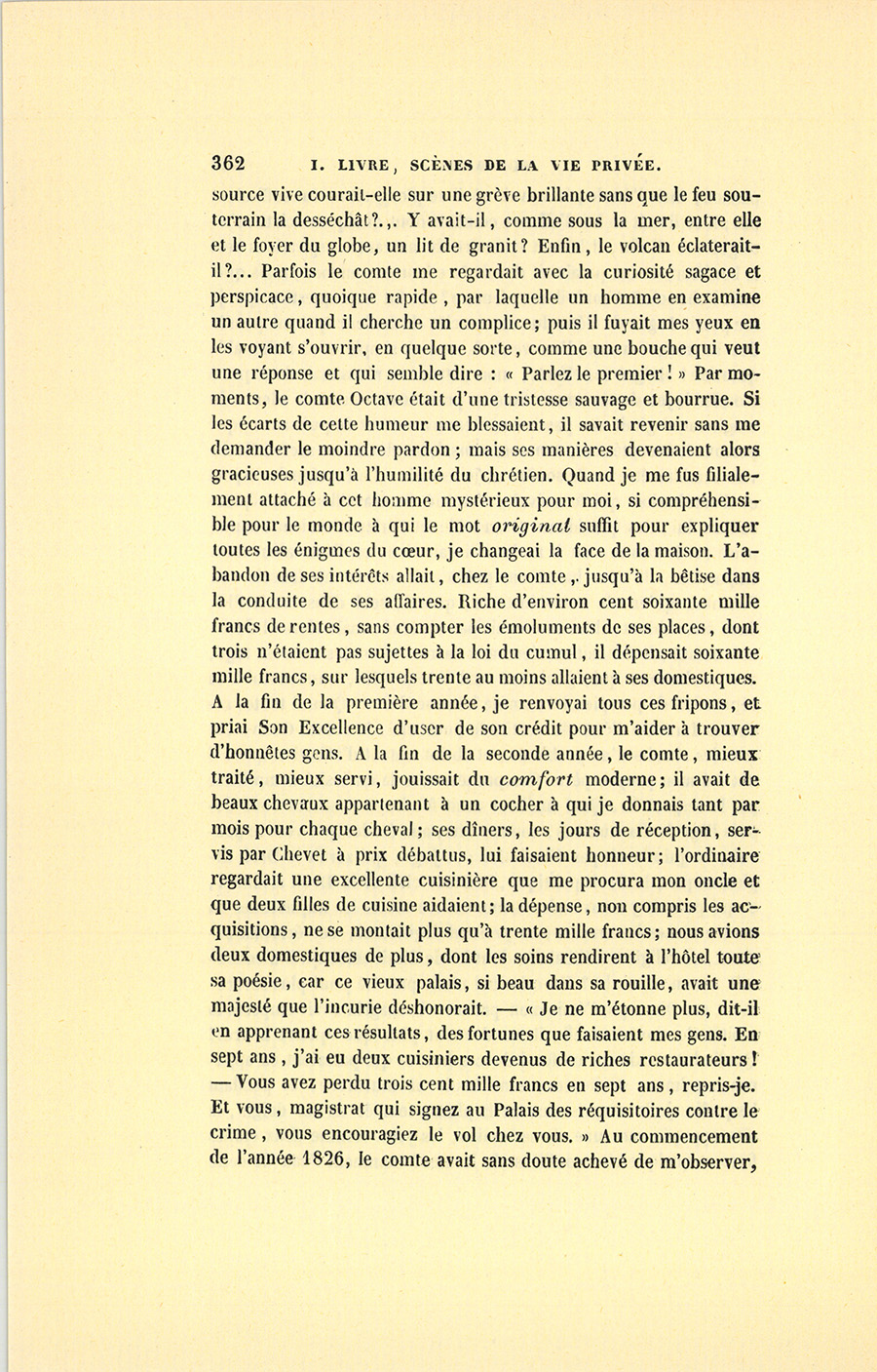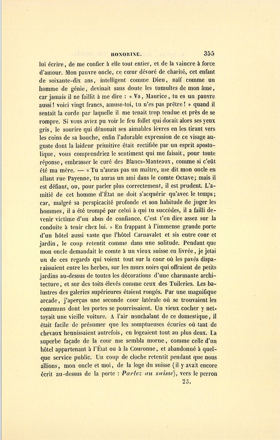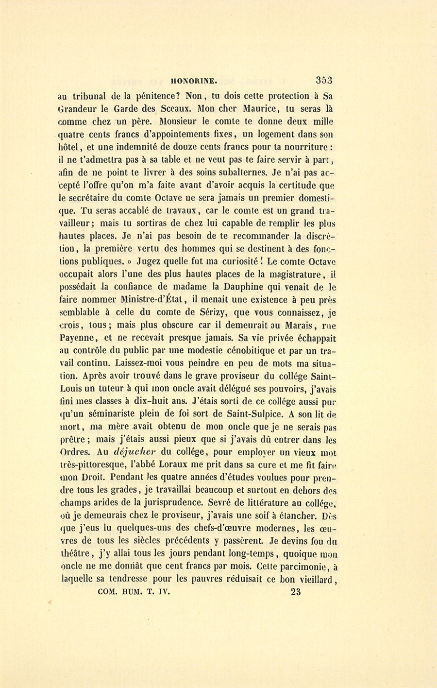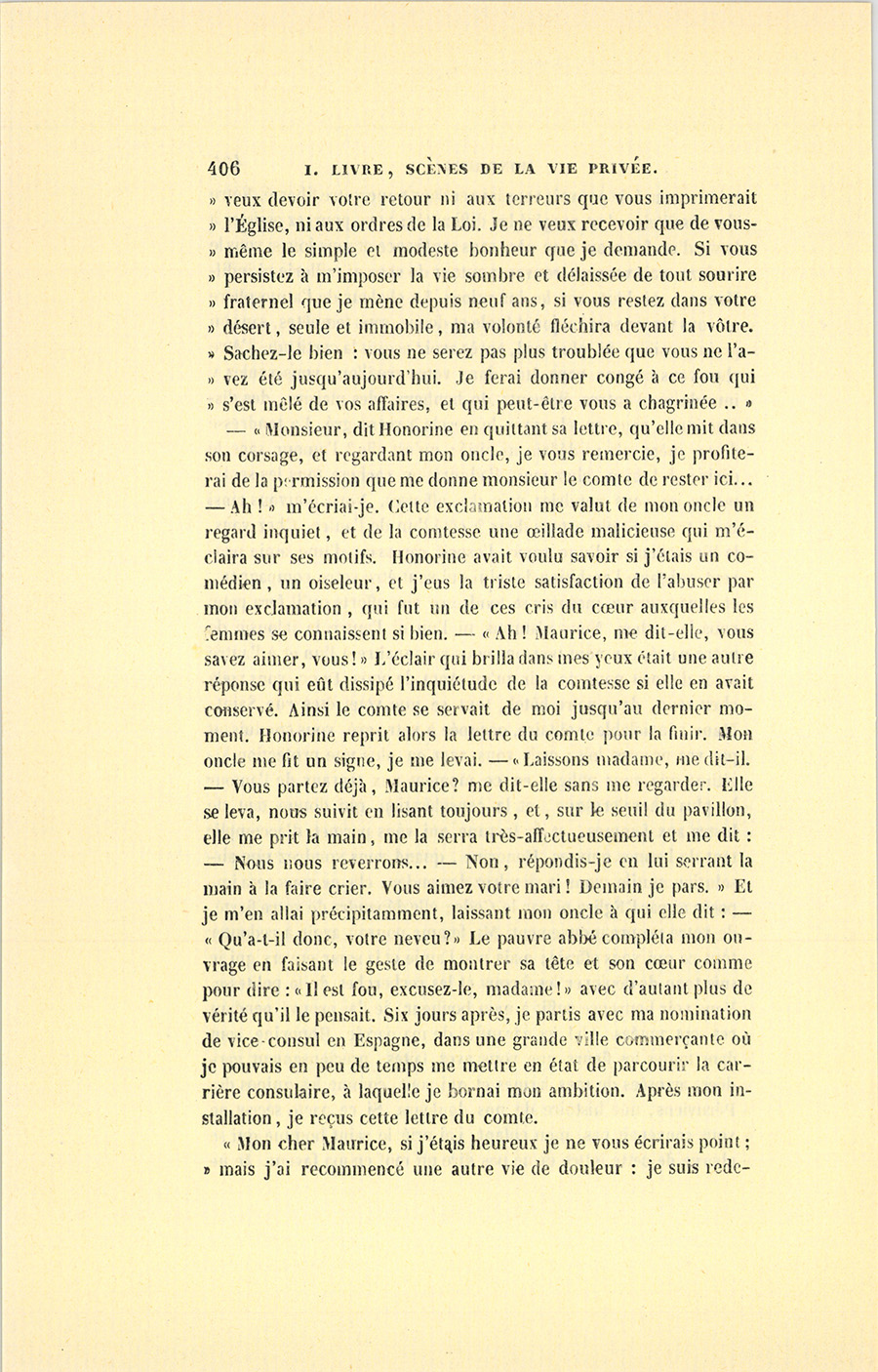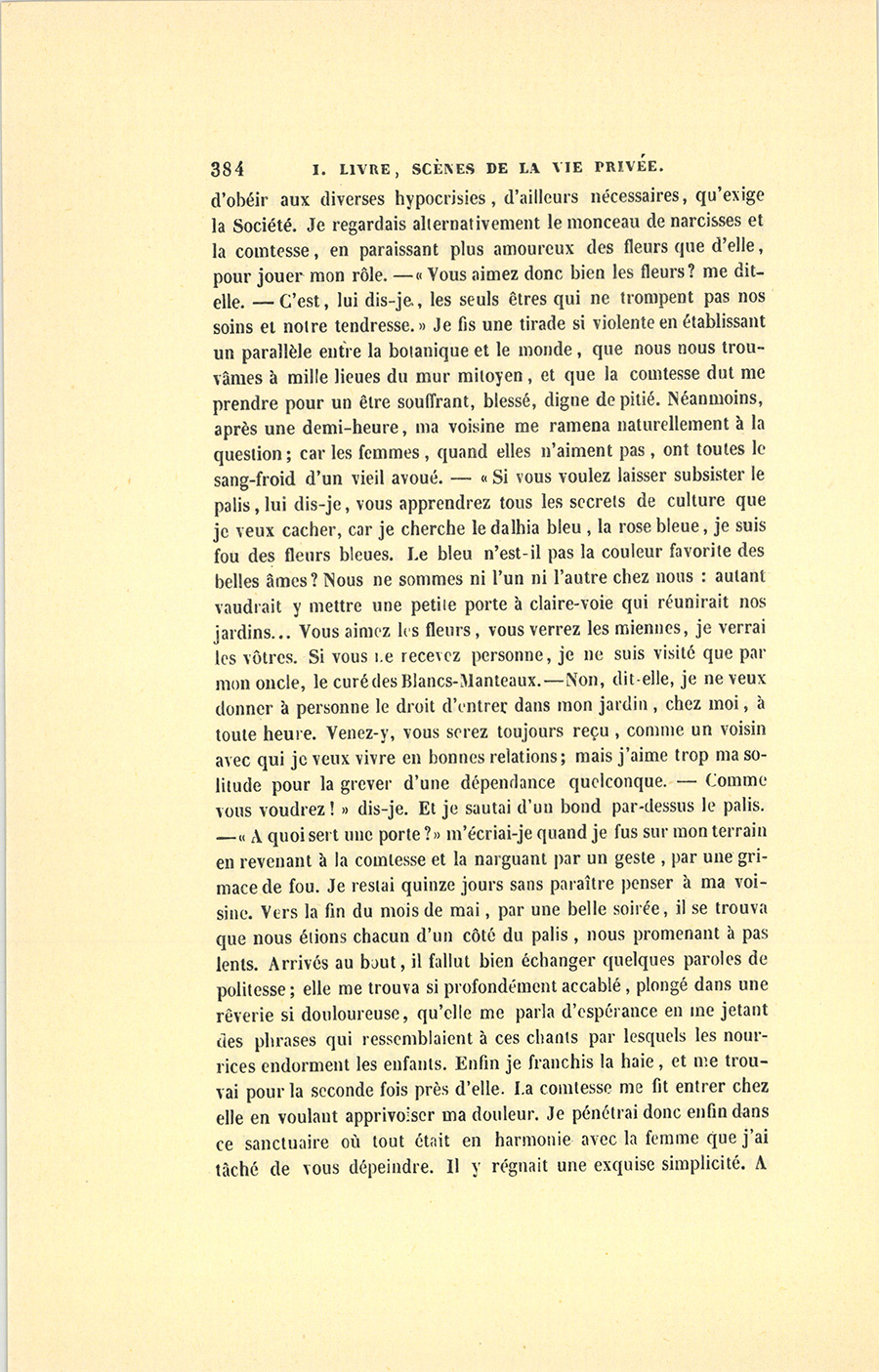 – À vingt-deux ans, une fois reçu docteur en Droit, mon vieil oncle, l’abbé Loraux, alors âgé de soixante-douze ans, sentit la nécessité de me donner un protecteur et de me lancer dans une carrière quelconque. [ill.] Cet excellent homme, si toutefois ce ne fut pas un saint, regardait chaque nouvelle année comme un nouveau don de Dieu. Je n’ai pas besoin de vous dire combien il était facile au confesseur d’une Altesse Royale de placer un jeune homme élevé par lui, l’unique enfant de sa sœur. Un jour donc, vers la fin de l’année 1824, ce vénérable vieillard, depuis cinq ans curé des Blancs-Manteaux à Paris, monta dans la chambre que j’occupais à son presbytère, et me dit : – « Fais ta toilette, mon enfant, je vais te présenter à la personne qui te prend chez elle en qualité de secrétaire. Si je ne me trompe, cette personne pourra me remplacer dans le cas où Dieu m’appellerait à lui. J’aurai dit ma messe à neuf heures, tu as trois quarts d’heure à toi, sois prêt. – Ah ! mon oncle, dois-je donc dire adieu à cette chambre où je suis si heureux depuis quatre ans ?… – Je n’ai pas de fortune à te léguer, me répondit-il. – Ne me laissez-vous pas la protection de votre nom, le souvenir de vos œuvres, et… ? – Ne parlons pas de cet héritage-là, dit-il en souriant. Tu ne connais pas encore assez le monde pour savoir qu’il acquitterait difficilement un legs de cette nature ; tandis qu’en te menant ce matin chez monsieur le comte…