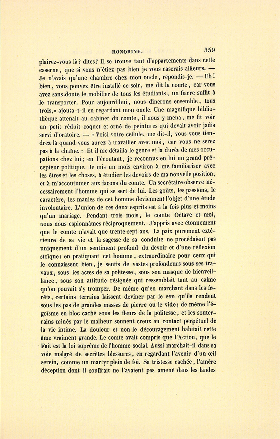 … Les véritables hommes d’état, les poètes, un général qui a commandé des armées, enfin les personnes réellement grandes sont simples ; et leur simplicité vous met de plain-pied avec elles. Vous qui êtes supérieurs par la pensée, peut-être avez-vous remarqué, dit-il en s’adressant à ses hôtes, combien le sentiment rapproche les distances morales qu’a créées la Société. Si nous vous sommes inférieurs par l’esprit, nous pouvons vous égaler par le dévouement en amitié. À la température (passez-moi ce mot) de nos cœurs, je me sentis aussi près de mon protecteur que j’étais loin de lui par le rang. Enfin, l’âme a sa clairvoyance, elle pressent la douleur, le chagrin, la joie, l’animadversion, la haine chez autrui. Je reconnus vaguement les symptômes d’un mystère, en reconnaissant chez le comte les mêmes effets de physionomie que j’avais observés chez mon oncle. L’exercice des vertus, la sérénité de la conscience, la pureté de la pensée avaient transfiguré mon oncle, qui de laid devint très-beau. J’aperçus une métamorphose inverse dans le visage du comte : au premier coup d’œil, je lui donnai cinquante-cinq ans ; mais, après un examen attentif, je reconnus une jeunesse ensevelie sous les glaces d’un profond chagrin, sous la fatigue des études obstinées, sous les teintes chaudes de quelque passion contrariée. À un mot de mon oncle, les yeux du comte reprirent pour un moment la fraîcheur d’une pervenche, il eut un sourire d’admiration qui me le montra à un âge, que je crus le véritable, à quarante ans. Ces observations, je ne les fis pas alors, mais plus tard, en me rappelant les circonstances de cette visite. Le valet de chambre entra tenant un plateau sur lequel était le déjeuner de son maître. – « Je ne demande pas mon déjeuner, dit le comte, laissez-le cependant, et allez montrer à monsieur son appartement. » Je suivis le valet de chambre, qui me conduisit à un joli logement complet, situé sous une terrasse, entre la cour d’honneur et les communs, au-dessus d’une galerie par laquelle les cuisines communiquaient avec le grand escalier de l’hôtel. Quand je revins au cabinet du comte, j’entendis, avant d’ouvrir la porte, mon oncle prononçant sur moi cet arrêt : – « Il pourrait faire une faute, car il a beaucoup de cœur, et nous sommes tous sujets à d’honorables erreurs ; mais il est sans aucun vice. – Eh ! bien, me dit le comte en me jetant un regard affectueux, vous {p. 359} plairez-vous là ? dites ? Il se trouve tant d’appartements dans cette caserne, que si vous n’étiez pas bien je vous caserais ailleurs. – Je n’avais qu’une chambre chez mon oncle, répondis-je. – Eh ! bien, vous pouvez être installé ce soir, me dit le comte, car vous avez sans doute le mobilier de tous les étudiants, un fiacre suffit à le transporter. Pour aujourd’hui, nous dînerons ensemble, tous trois », ajouta-t-il en regardant mon oncle. Une magnifique bibliothèque attenait au cabinet du comte, il nous y mena, me fit voir un petit réduit coquet et orné de peintures qui devait avoir jadis servi d’oratoire. – « Voici votre cellule, me dit-il, vous vous tiendrez là quand vous aurez à travailler avec moi, car vous ne serez pas à la chaîne. » Et il me détailla le genre et la durée de mes occupations chez lui ; en l’écoutant, je reconnus en lui un grand précepteur politique. Je mis un mois environ à me familiariser avec les êtres et les choses, à étudier les devoirs de ma nouvelle position, et à m’accoutumer aux façons du comte. Un secrétaire observe nécessairement l’homme qui se sert de lui. Les goûts, les passions, le caractère, les manies de cet homme deviennent l’objet d’une étude involontaire. L’union de ces deux esprits est à la fois plus et moins qu’un mariage. Pendant trois mois, le comte Octave et moi, nous nous espionnâmes réciproquement. J’appris avec étonnement que le comte n’avait que trente-sept ans. La paix purement extérieure de sa vie et la sagesse de sa conduite ne procédaient pas uniquement d’un sentiment profond du devoir et d’une réflexion stoïque ; en pratiquant cet homme, extraordinaire pour ceux qui le connaissent bien, je sentis de vastes profondeurs sous ses travaux, sous les actes de sa politesse, sous son masque de bienveillance, sous son attitude résignée qui ressemblait tant au calme qu’on pouvait s’y tromper. De même qu’en marchant dans les forêts, certains terrains laissent deviner par le son qu’ils rendent sous les pas de grandes masses de pierre ou le vide ; de même l’égoïsme en bloc caché sous les fleurs de la politesse, et les souterrains minés par le malheur sonnent creux au contact perpétuel de la vie intime. La douleur et non le découragement habitait cette âme vraiment grande. Le comte avait compris que l’Action, que le Fait est la loi suprême de l’homme social. Aussi marchait-il dans sa voie malgré de secrètes blessures, en regardant l’avenir d’un œil serein, comme un martyr plein de foi. Sa tristesse cachée, l’amère déception dont il souffrait ne l’avaient pas amené dans les landes {p. 360} philosophiques de l’Incrédulité ; ce courageux homme d’État était religieux, mais sans aucune ostentation : il allait à la première messe qui se disait à Saint-Paul pour les artisans et pour les domestiques pieux. Aucun de ses amis, personne à la Cour ne savait qu’il observât si fidèlement les pratiques de la religion. Il cultivait Dieu comme certains honnêtes gens cultivent un vice, avec un profond mystère. Aussi devais-je trouver un jour le comte monté sur une Alpe de malheur bien plus élevée que celle où se tiennent ceux qui se croient les plus éprouvés, qui raillent les passions et les croyances d’autrui parce qu’ils ont vaincu les leurs, qui varient sur tous les tons l’ironie et le dédain. Il ne se 
