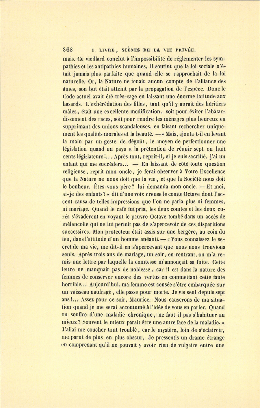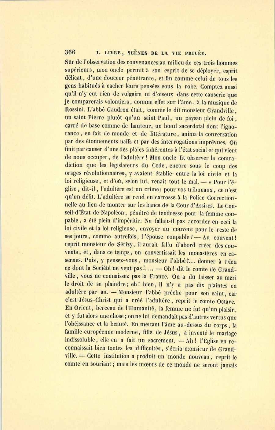 – Par un certain lundi, reprit-il, le hasard voulut que monsieur le président de Grandville et monsieur de Sérizy, alors Vice-Président du Conseil-d’État, fussent venus tenir une séance chez le comte Octave. Ils formaient, à eux trois, une commission de laquelle j’étais le secrétaire. Le comte m’avait déjà fait nommer auditeur au Conseil-d’État. Tous les éléments nécessaires à l’examen de la question politique secrètement soumise à ces messieurs se trouvaient sur l’une des longues tables de notre bibliothèque. Messieurs de Grandville et de Sérizy s’en étaient remis au comte Octave pour le dépouillement préparatoire des documents relatifs à leur travail. Afin d’éviter le transport des pièces chez monsieur de Sérizy, président de la commission, il était convenu qu’on se réunirait d’abord rue Payenne. Le cabinet des Tuileries attachait une grande importance à ce travail, qui pesa sur moi principalement et auquel je dus, dans le cours de cette année, ma nomination de Maître des Requêtes. Quoique les comtes de Grandville et de Sérizy, dont les habitudes ressemblaient fort à celles de mon patron, ne dînassent jamais hors de chez eux, nous fûmes surpris discutant encore à une heure si avancée que le valet de chambre me demanda pour me dire : – « Messieurs les curés de Saint-Paul et des Blancs-Manteaux sont au salon depuis deux heures. » Il était neuf heures ! – « Vous voilà, messieurs, obligés de faire un dîner de curés, dit en riant le comte Octave à ses collègues. Je ne sais pas si Grandville surmontera sa répugnance pour la soutane. – C’est selon les curés. – Oh ! l’un est mon oncle, et l’autre est l’abbé Gaudron, lui répondis-je. Soyez sans crainte, l’abbé Fontanon n’est plus vicaire à Saint-Paul… – Eh ! bien, dînons, répondit le Président Grandville. Un dévot m’effraie ; mais je ne sais personne de gai comme un homme vraiment pieux ! » Et nous nous rendîmes au salon. Le dîner fut charmant. Les hommes réellement instruits, les politiques à qui les affaires donnent et une expérience consommée et l’habitude de la parole, sont d’adorables conteurs, quand ils savent conter. Il n’est pas de milieu pour eux, ou ils sont lourds, ou ils sont sublimes. À ce charmant jeu, le prince de Metternich est aussi fort que Charles Nodier. Taillée à facettes comme le diamant, la plaisanterie des hommes d’État est nette, étincelante et pleine de sens. {p. 366} Sûr de l’observation des convenances au milieu de ces trois hommes supérieurs, mon oncle permit à son esprit de se déployer, esprit délicat, d’une douceur pénétrante, et fin comme celui de tous les gens habitués à cacher leurs pensées sous la robe. Comptez aussi qu’il n’y eut rien de vulgaire ni d’oiseux dans cette causerie que je comparerais volontiers, comme effet sur l’âme, à la musique de Rossini. L’abbé Gaudron était, comme le dit monsieur Grandville, un saint Pierre plutôt qu’un saint Paul, un paysan plein de foi, carré de base comme de hauteur, un bœuf sacerdotal dont l’ignorance, en fait de monde et de littérature, anima la conversation par des étonnements naïfs et par des interrogations imprévues. On finit par causer d’une des plaies inhérentes à l’état social et qui vient de nous occuper, de l’adultère ! Mon oncle fit observer la contradiction que les législateurs du Code, encore sous le coup des orages révolutionnaires, y avaient établie entre la loi civile et la loi religieuse, et d’où, selon lui, venait tout le mal. – « Pour l’église, dit-il, l’adultère est un crime ; pour vos tribunaux, ce n’est qu’un délit. L’adultère se rend en carrosse à la Police Correctionnelle au lieu de monter sur les bancs de la Cour d’Assises. Le Conseil-d’État de Napoléon, pénétré de tendresse pour la femme coupable, a été plein d’impéritie. Ne fallait-il pas accorder en ceci la loi civile et la loi religieuse, envoyer au couvent pour le reste de ses jours, comme autrefois, l’épouse coupable ? – Au couvent ! reprit monsieur de Sérizy, il aurait fallu d’abord créer des couvents, et, dans ce temps, on convertissait les monastères en casernes. Puis, y pensez-vous, monsieur l’abbé ?… donner à Dieu ce dont la Société ne veut pas !… – Oh ! dit le comte de Grandville, vous ne connaissez pas la France. On a dû laisser au mari le droit de se plaindre ; eh ! bien, il n’y a pas dix plaintes en adultère par an. – Monsieur l’abbé prêche pour son saint, car c’est Jésus-Christ qui a créé l’adultère, reprit le comte Octave. En Orient, berceau de l’Humanité, la femme ne fut qu’un plaisir, et y fut alors une chose ; on ne lui demandait pas d’autres vertus que l’obéissance et la beauté. En mettant l’âme au-dessus du corps, la famille européenne moderne, fille de Jésus, a inventé le mariage indissoluble, elle en a fait un sacrement. – Ah ! l’Église en reconnaissait bien toutes les difficultés, s’écria monsieur de Grandville. – Cette institution a produit un monde nouveau, reprit le comte en souriant ; mais les mœurs de ce monde ne seront jamais {p. 367} celles des climats où la femme est nubile à sept ans et plus que vieille à vingt-cinq. L’Église catholique a oublié les nécessités d’une moitié du globe. Parlons donc uniquement de l’Europe ? La femme nous est-elle inférieure ou supérieure ? Telle est la vraie question par rapport à nous. Si la femme nous est inférieure, en l’élevant aussi haut que l’a fait l’Église, il fallait de terribles punitions à l’adultère. Aussi, jadis, a-t-on procédé ainsi. Le cloître ou la mort, voilà toute l’ancienne législation. Mais depuis, les mœurs ont modifié les lois, comme toujours. Le trône a servi de couche à l’adultère, et les progrès de ce joli crime ont marqué l’affaiblissement des 