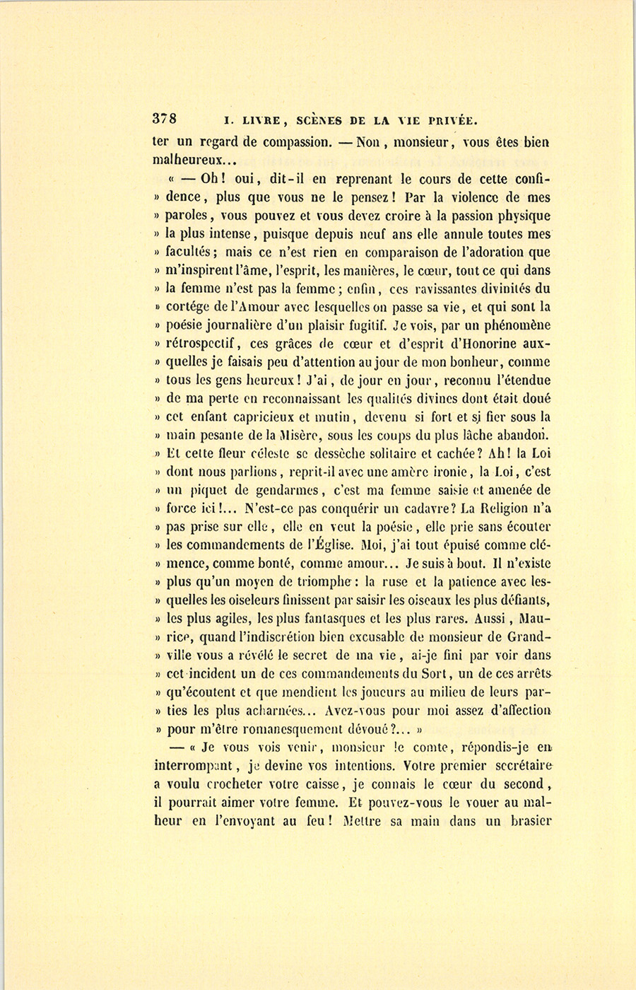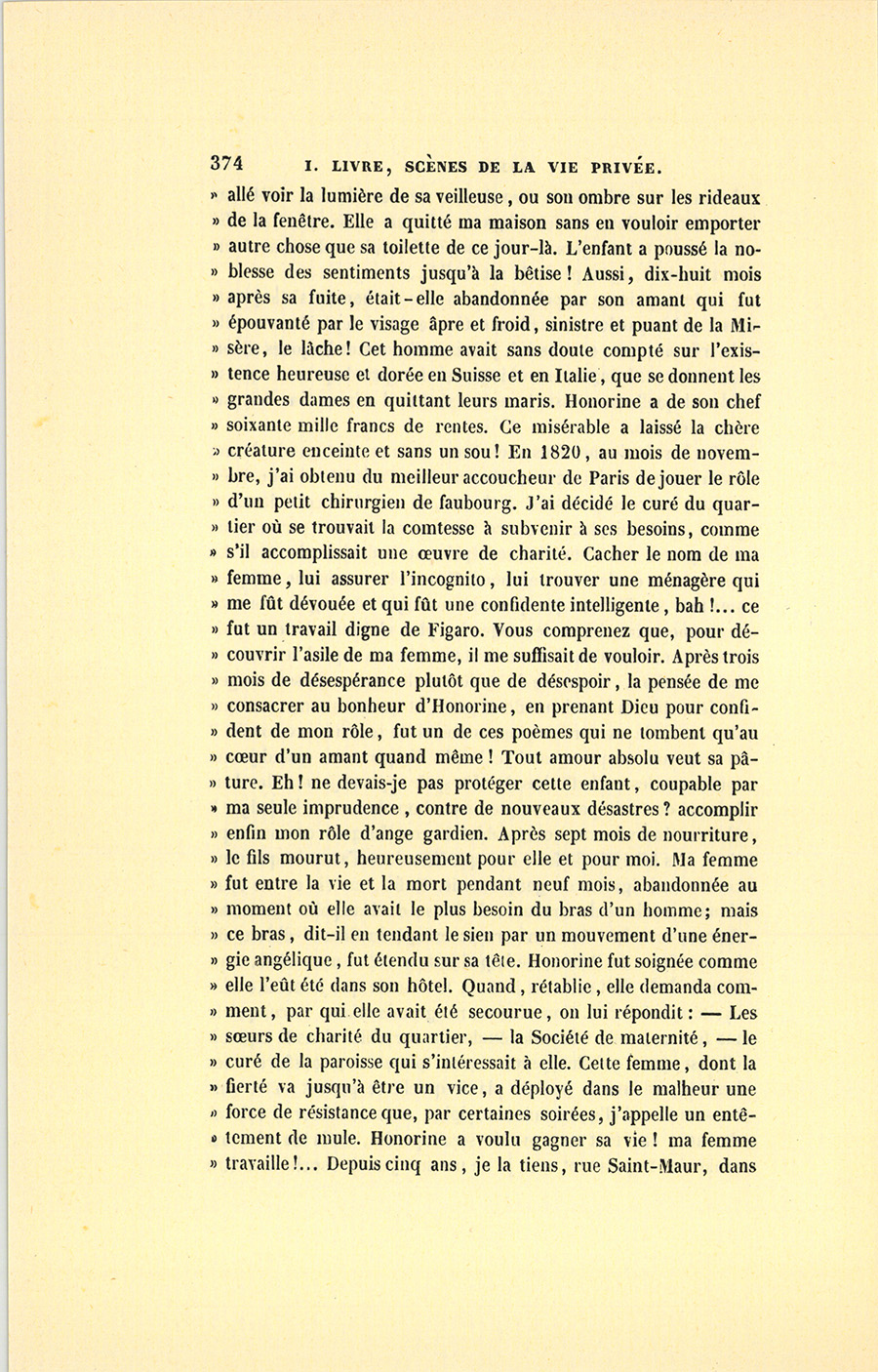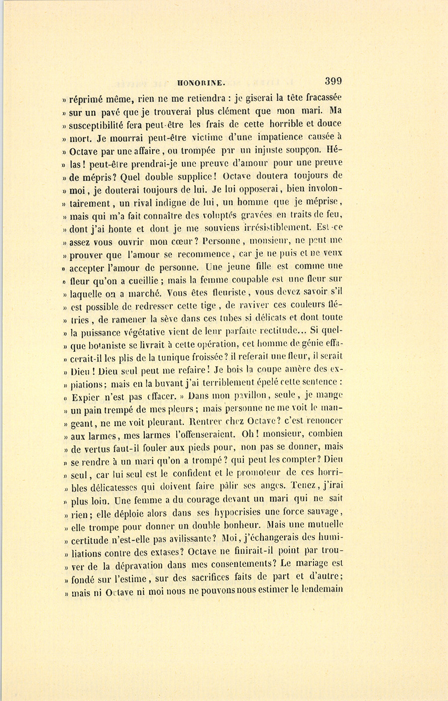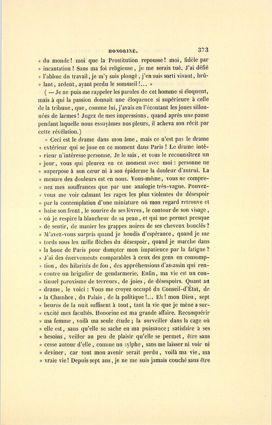 « Ceci est le drame dans mon âme, mais ce n’est pas le drame extérieur qui se joue en ce moment dans Paris ! Le drame intérieur n’intéresse personne. Je le sais, et vous le reconnaîtrez un jour, vous qui pleurez en ce moment avec moi : personne ne superpose à son cœur ni à son épiderme la douleur d’autrui. La mesure des douleurs est en nous. Vous-même, vous ne comprenez mes souffrances que par une analogie très-vague. Pouvez-vous me voir calmant les rages les plus violentes du désespoir par la contemplation d’une miniature où mon regard retrouve et baise son front, le sourire de ses lèvres, le contour de son visage, où je respire la blancheur de sa peau, et qui me permet presque de sentir, de manier les grappes noires de ses cheveux bouclés ? M’avez-vous surpris quand je bondis d’espérance, quand je me tords sous les mille flèches du désespoir, quand je marche dans la boue de Paris pour dompter mon impatience par la fatigue ? J’ai des énervements comparables à ceux des gens en consomption, des hilarités de fou, des appréhensions d’assassin qui rencontre un brigadier de gendarmerie. Enfin, ma vie est un continuel paroxisme de terreurs, de joies, de désespoirs. Quant au drame, le voici : Vous me croyez occupé du Conseil-d’État, de la Chambre, du Palais, de la politique !… Eh ! mon Dieu, sept heures de la nuit suffisent à tout, tant la vie que je mène a surexcité mes facultés. Honorine est ma grande affaire. Reconquérir ma femme, voilà ma seule étude ; la surveiller dans la cage où elle est, sans qu’elle se sache en ma puissance ; satisfaire à ses besoins, veiller au peu de plaisir qu’elle se permet, être sans cesse autour d’elle, comme un sylphe, sans me laisser ni voir ni deviner, car tout mon avenir serait perdu, voilà ma vie, ma vraie vie ! Depuis sept ans, je ne me suis jamais couché sans être {p. 374} allé voir la lumière de sa veilleuse, ou son ombre sur les rideaux de la fenêtre. Elle a quitté ma maison sans en vouloir emporter autre chose que sa toilette de ce jour-là. L’enfant a poussé la noblesse des sentiments jusqu’à la bêtise ! Aussi, dix-huit mois après sa fuite, était-elle abandonnée par son amant qui fut épouvanté par le visage âpre et froid, sinistre et puant de la Misère, le lâche ! Cet homme avait sans doute compté sur l’existence heureuse et dorée en Suisse et en Italie, que se donnent les grandes dames en quittant leurs maris. Honorine a de son chef soixante mille francs de rentes. Ce misérable a laissé la chère créature enceinte et sans un sou ! En 1820, au mois de novembre, j’ai obtenu du meilleur accoucheur de Paris de jouer le rôle d’un petit chirurgien de faubourg. J’ai décidé le curé du quartier où se trouvait la comtesse à subvenir à ses besoins, comme s’il accomplissait une œuvre de charité. Cacher le nom de ma femme, lui assurer l’incognito, lui trouver une ménagère qui me fût dévouée et qui fût une confidente intelligente, bah !… ce fut un travail digne de Figaro. Vous comprenez que, pour découvrir l’asile de ma femme, il me suffisait de vouloir. Après trois mois de désespérance plutôt que de désespoir, la pensée de me consacrer au bonheur d’Honorine, en prenant Dieu pour confident de mon rôle, fut un de ces poèmes qui ne tombent qu’au cœur d’un amant quand même ! Tout amour absolu veut sa pâture. Eh ! ne devais-je pas protéger cette enfant, coupable par ma seule imprudence, contre de nouveaux désastres ? accomplir enfin mon rôle d’ange gardien. Après sept mois de nourriture, le fils mourut, heureusement pour elle et pour moi. Ma femme fut entre la vie et la mort pendant neuf mois, abandonnée au moment où elle avait le plus besoin du bras d’un homme ; mais ce bras, dit-il en tendant le sien par un mouvement d’une énergie angélique, fut étendu sur sa tête. Honorine fut soignée comme elle l’eût été dans son hôtel. Quand, rétablie, elle demanda comment, par qui elle avait été secourue, on lui répondit : – Les sœurs de charité du quartier, – la Société de maternité, – le curé de la paroisse qui s’intéressait à elle. Cette femme, dont la fierté va jusqu’à être un vice, a déployé dans le malheur une force de résistance que, par certaines soirées, j’appelle un entêtement de mule. Honorine a voulu gagner sa vie ! ma femme travaille !… Depuis cinq ans, je la tiens, rue Saint-Maur, dans {p. 375} un charmant pavillon où elle fabrique des fleurs et des modes. Elle croit vendre les produits de son élégant travail à un marchand qui les lui paie assez cher pour que la journée lui vaille vingt francs, et n’a pas eu depuis six ans un seul soupçon. Elle paie toutes les choses de la vie à peu près le tiers de ce qu’elles valent, en sorte qu’avec six mille francs par an, elle vit comme si elle avait quinze mille francs. Elle a le goût des fleurs, et donne cent écus à un jardinier qui me coûte à moi douze cents francs de gages, et qui me présente des mémoires de deux mille francs tous les trois mois. J’ai promis à cet homme un marais et une maison de maraîcher contiguë à la loge du concierge de la rue Saint-Maur. Cette propriété m’appartient sous le nom d’un commis-greffier de la Cour. Une seule indiscrétion ferait tout perdre au jardinier. Honorine a son pavillon, un jardin, une serre superbe, pour cinq cents francs de loyer par an. Elle vit là, sous le nom de sa femme de charge, madame Gobain, cette vieille d’une discrétion à toute épreuve que j’ai trouvée, et de qui elle s’est fait aimer. Mais ce zèle est, comme celui du jardinier, entretenu par la promesse d’une récompense au jour du succès. Le concierge et sa femme me coûtent horriblement cher par les mêmes raisons. Enfin, depuis trois ans, Honorine est heureuse, elle croit devoir à son travail le luxe de ses fleurs, sa toilette et son bien-être. Oh 