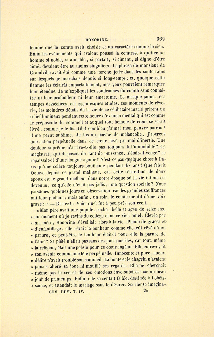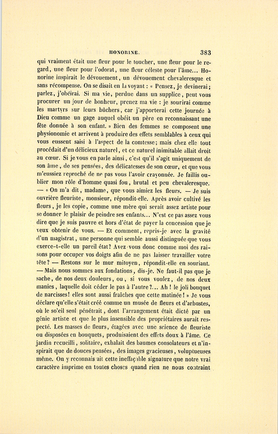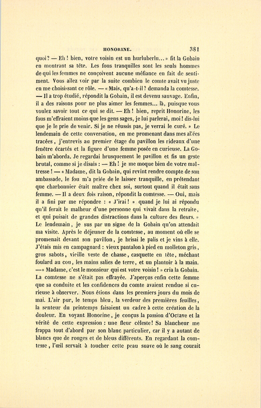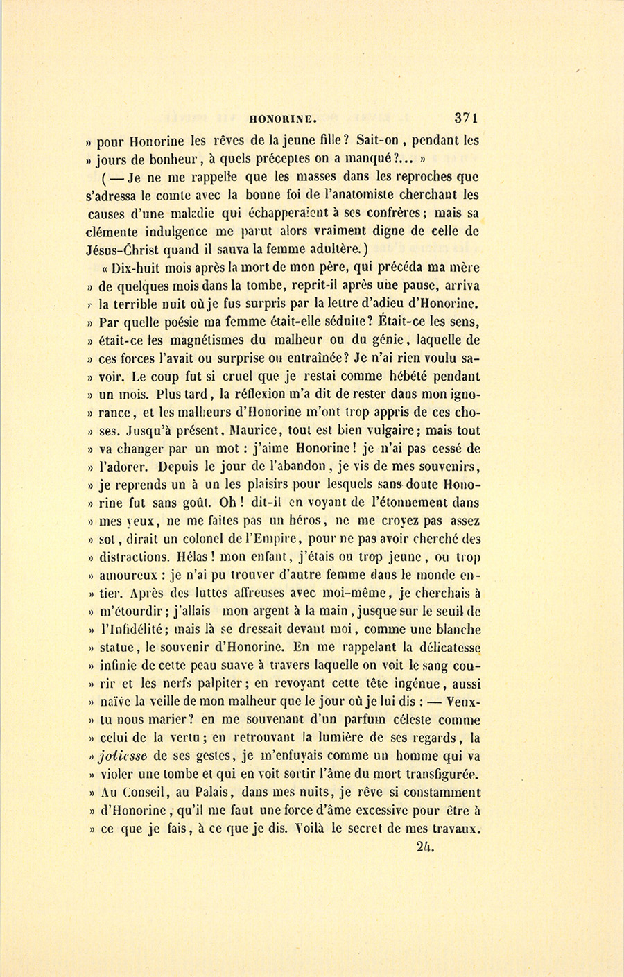 « Ceci est le drame dans mon âme, mais ce n’est pas le drame extérieur qui se joue en ce moment dans Paris ! Le drame intérieur n’intéresse personne. Je le sais, et vous le reconnaîtrez un jour, vous qui pleurez en ce moment avec moi : personne ne superpose à son cœur ni à son épiderme la douleur d’autrui. La mesure des douleurs est en nous. Vous-même, vous ne comprenez mes souffrances que par une analogie très-vague. Pouvez-vous me voir calmant les rages les plus violentes du désespoir par la contemplation d’une miniature où mon regard retrouve et baise son front, le sourire de ses lèvres, le contour de son visage, où je respire la blancheur de sa peau, et qui me permet presque de sentir, de manier les grappes noires de ses cheveux bouclés ? M’avez-vous surpris quand je bondis d’espérance, quand je me tords sous les mille flèches du désespoir, quand je marche dans la boue de Paris pour dompter mon impatience par la fatigue ? J’ai des énervements comparables à ceux des gens en consomption, des hilarités de fou, des appréhensions d’assassin qui rencontre un brigadier de gendarmerie. Enfin, ma vie est un continuel paroxisme de terreurs, de joies, de désespoirs. Quant au drame, le voici : Vous me croyez occupé du Conseil-d’État, de la Chambre, du Palais, de la politique !… Eh ! mon Dieu, sept heures de la nuit suffisent à tout, tant la vie que je mène a surexcité mes facultés. Honorine est ma grande affaire. Reconquérir ma femme, voilà ma seule étude ; la surveiller dans la cage où elle est, sans qu’elle se sache en ma puissance ; satisfaire à ses besoins, veiller au peu de plaisir qu’elle se permet, être sans cesse autour d’elle, comme un sylphe, sans me laisser ni voir ni deviner, car tout mon avenir serait perdu, voilà ma vie, ma vraie vie ! Depuis sept ans, je ne me suis jamais couché sans être {p. 374} allé voir la lumière de sa veilleuse, ou son ombre sur les rideaux de la fenêtre. Elle a quitté ma maison sans en vouloir emporter autre chose que sa toilette de ce jour-là. L’enfant a poussé la noblesse des sentiments jusqu’à la bêtise ! Aussi, dix-huit mois après sa fuite, était-elle abandonnée par son amant qui fut épouvanté par le visage âpre et froid, sinistre et puant de la Misère, le lâche ! Cet homme avait sans doute compté sur l’existence heureuse et dorée en Suisse et en Italie, que se donnent les grandes dames en quittant leurs maris. Honorine a de son chef soixante mille francs de rentes. Ce misérable a laissé la chère créature enceinte et sans un sou ! En 1820, au mois de novembre, j’ai obtenu du meilleur accoucheur de Paris de jouer le rôle d’un petit chirurgien de faubourg. J’ai décidé le curé du quartier où se trouvait la comtesse à subvenir à ses besoins, comme s’il accomplissait une œuvre de charité. Cacher le nom de ma femme, lui assurer l’incognito, lui trouver une ménagère qui me fût dévouée et qui fût une confidente intelligente, bah !… ce fut un travail digne de Figaro. Vous comprenez que, pour découvrir l’asile de ma femme, il me suffisait de vouloir. Après trois mois de désespérance plutôt que de désespoir, la pensée de me consacrer au bonheur d’Honorine, en prenant Dieu pour confident de mon rôle, fut un de ces poèmes qui ne tombent qu’au cœur d’un amant quand même ! Tout amour absolu veut sa pâture. Eh ! ne devais-je pas protéger cette enfant, coupable par ma seule imprudence, contre de nouveaux désastres ? accomplir enfin mon rôle d’ange gardien. Après sept mois de nourriture, le fils mourut, heureusement pour elle et pour moi. Ma femme fut entre la vie et la mort pendant neuf mois, abandonnée au moment où elle avait le plus besoin du bras d’un homme ; mais ce bras, dit-il en tendant le sien par un mouvement d’une énergie angélique, fut étendu sur sa tête. Honorine fut soignée comme elle l’eût été dans son hôtel. Quand, rétablie, elle demanda comment, par qui elle avait été secourue, on lui répondit : – Les sœurs de charité du quartier, – la Société de maternité, – le curé de la paroisse qui s’intéressait à elle. Cette femme, dont la fierté va jusqu’à être un vice, a déployé dans le malheur une force de résistance que, par certaines soirées, j’appelle un entêtement de mule. Honorine a voulu gagner sa vie ! ma femme travaille !… Depuis cinq ans, je la tiens, rue Saint-Maur, dans {p. 375} un charmant pavillon où elle fabrique des fleurs et des modes. Elle croit vendre les produits de son élégant travail à un marchand qui les lui paie assez cher pour que la journée lui vaille vingt francs, et n’a pas eu depuis six ans un seul soupçon. Elle paie toutes les choses de la vie à peu près le tiers de ce qu’elles valent, en sorte qu’avec six mille francs par an, elle vit comme si elle avait quinze mille francs. Elle a le goût des fleurs, et donne cent écus à un jardinier qui me coûte à moi douze cents francs de gages, et qui me présente des mémoires de deux mille francs tous les trois mois. J’ai promis à cet homme un marais et une maison de maraîcher contiguë à la loge du concierge de la rue Saint-Maur. Cette propriété m’appartient sous le nom d’un commis-greffier de la Cour. Une seule indiscrétion ferait tout perdre au jardinier. Honorine a son pavillon, un jardin, une serre superbe, pour cinq cents francs de loyer par an. Elle vit là, sous le nom de sa femme de charge, madame Gobain, cette vieille d’une discrétion à toute épreuve que j’ai trouvée, et de qui elle s’est fait aimer. Mais ce zèle est, comme celui du jardinier, entretenu par la promesse d’une récompense au jour du succès. Le concierge et sa femme me coûtent horriblement cher par les mêmes raisons. Enfin, depuis trois ans, Honorine est heureuse, elle croit devoir à son travail le luxe de ses fleurs, sa toilette et son bien-être. Oh 