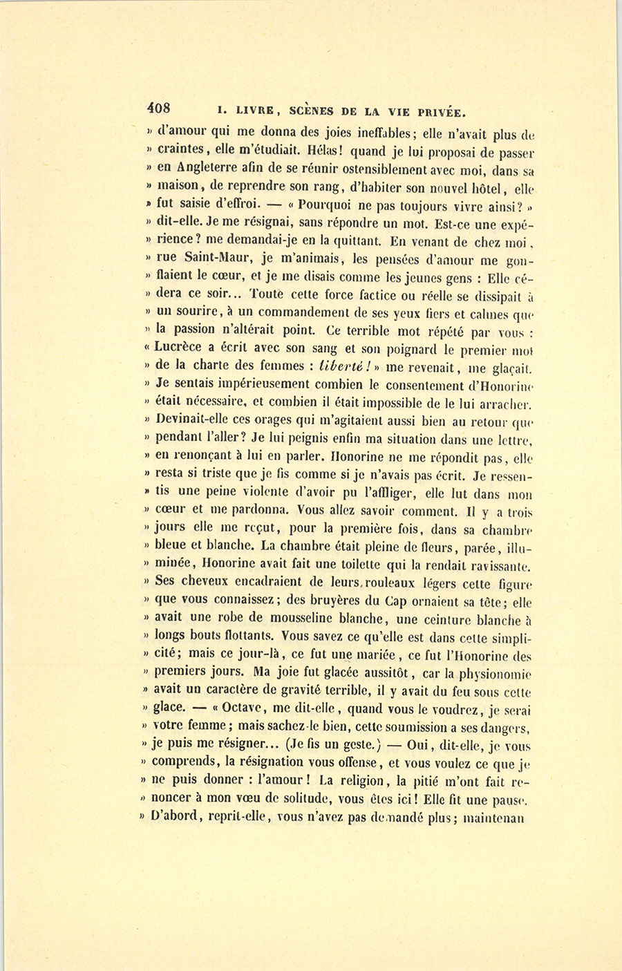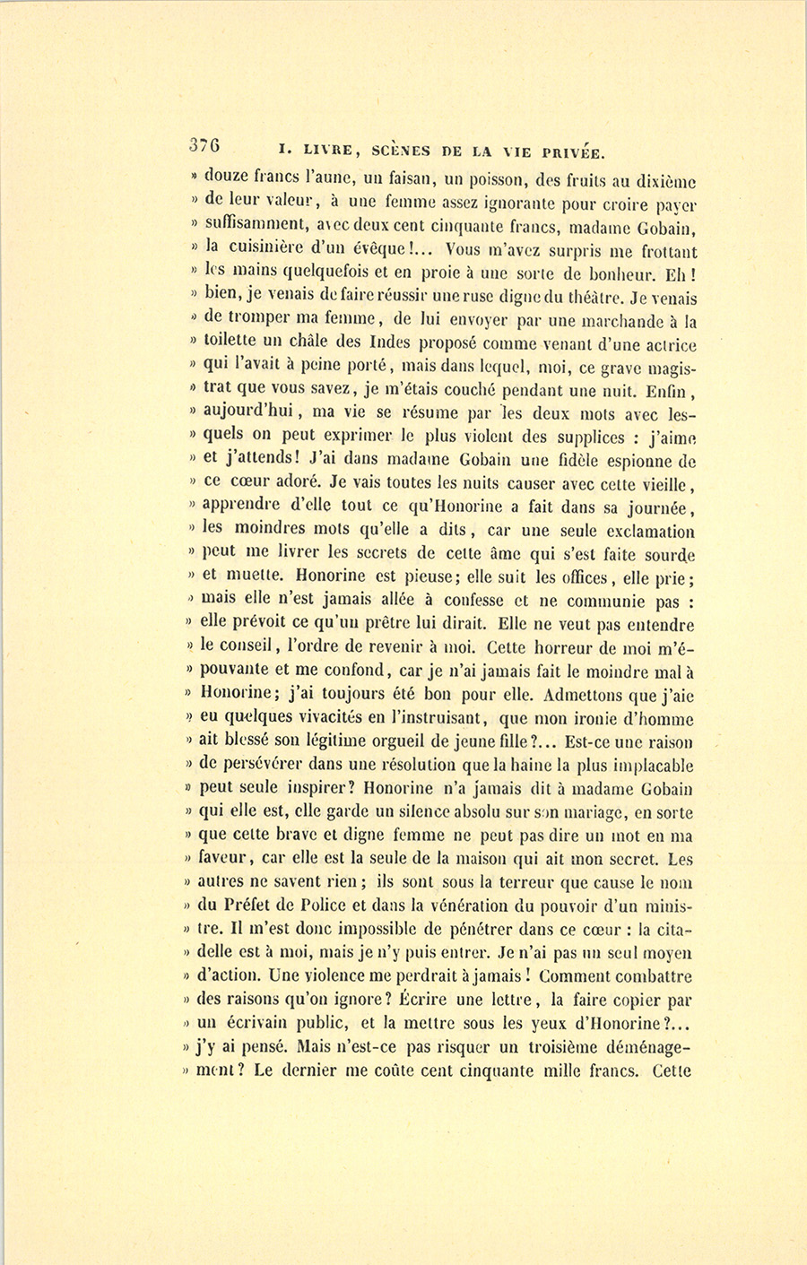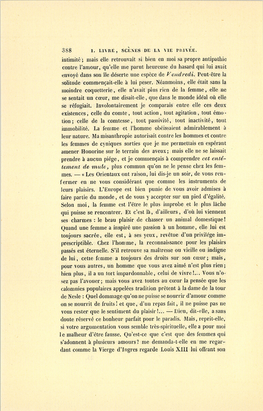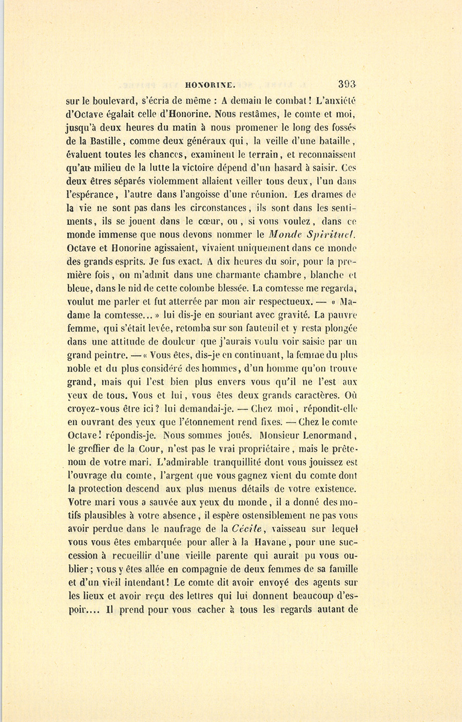 « Ceci est le drame dans mon âme, mais ce n’est pas le drame extérieur qui se joue en ce moment dans Paris ! Le drame intérieur n’intéresse personne. Je le sais, et vous le reconnaîtrez un jour, vous qui pleurez en ce moment avec moi : personne ne superpose à son cœur ni à son épiderme la douleur d’autrui. La mesure des douleurs est en nous. Vous-même, vous ne comprenez mes souffrances que par une analogie très-vague. Pouvez-vous me voir calmant les rages les plus violentes du désespoir par la contemplation d’une miniature où mon regard retrouve et baise son front, le sourire de ses lèvres, le contour de son visage, où je respire la blancheur de sa peau, et qui me permet presque de sentir, de manier les grappes noires de ses cheveux bouclés ? M’avez-vous surpris quand je bondis d’espérance, quand je me tords sous les mille flèches du désespoir, quand je marche dans la boue de Paris pour dompter mon impatience par la fatigue ? J’ai des énervements comparables à ceux des gens en consomption, des hilarités de fou, des appréhensions d’assassin qui rencontre un brigadier de gendarmerie. Enfin, ma vie est un continuel paroxisme de terreurs, de joies, de désespoirs. Quant au drame, le voici : Vous me croyez occupé du Conseil-d’État, de la Chambre, du Palais, de la politique !… Eh ! mon Dieu, sept heures de la nuit suffisent à tout, tant la vie que je mène a surexcité mes facultés. Honorine est ma grande affaire. Reconquérir ma femme, voilà ma seule étude ; la surveiller dans la cage où elle est, sans qu’elle se sache en ma puissance ; satisfaire à ses besoins, veiller au peu de plaisir qu’elle se permet, être sans cesse autour d’elle, comme un sylphe, sans me laisser ni voir ni deviner, car tout mon avenir serait perdu, voilà ma vie, ma vraie vie ! Depuis sept ans, je ne me suis jamais couché sans être {p. 374} allé voir la lumière de sa veilleuse, ou son ombre sur les rideaux de la fenêtre. Elle a quitté ma maison sans en vouloir emporter autre chose que sa toilette de ce jour-là. L’enfant a poussé la noblesse des sentiments jusqu’à la bêtise ! Aussi, dix-huit mois après sa fuite, était-elle abandonnée par son amant qui fut épouvanté par le visage âpre et froid, sinistre et puant de la Misère, le lâche ! Cet homme avait sans doute compté sur l’existence heureuse et dorée en Suisse et en Italie, que se donnent les grandes dames en quittant leurs maris. Honorine a de son chef soixante mille francs de rentes. Ce misérable a laissé la chère créature enceinte et sans un sou ! En 1820, au mois de novembre, j’ai obtenu du meilleur accoucheur de Paris de jouer le rôle d’un petit chirurgien de faubourg. J’ai décidé le curé du quartier où se trouvait la comtesse à subvenir à ses besoins, comme s’il accomplissait une œuvre de charité. Cacher le nom de ma femme, lui assurer l’incognito, lui trouver une ménagère qui me fût dévouée et qui fût une confidente intelligente, bah !… ce fut un travail digne de Figaro. Vous comprenez que, pour découvrir l’asile de ma femme, il me suffisait de vouloir. Après trois mois de désespérance plutôt que de désespoir, la pensée de me consacrer au bonheur d’Honorine, en prenant Dieu pour confident de mon rôle, fut un de ces poèmes qui ne tombent qu’au cœur d’un amant quand même ! Tout amour absolu veut sa pâture. Eh ! ne devais-je pas protéger cette enfant, coupable par ma seule imprudence, contre de nouveaux désastres ? accomplir enfin mon rôle d’ange gardien. Après sept mois de nourriture, le fils mourut, heureusement pour elle et pour moi. Ma femme fut entre la vie et la mort pendant neuf mois, abandonnée au moment où elle avait le plus besoin du bras d’un homme ; mais ce bras, dit-il en tendant le sien par un mouvement d’une énergie angélique, fut étendu sur sa tête. Honorine fut soignée comme elle l’eût été dans son hôtel. Quand, rétablie, elle demanda comment, par qui elle avait été secourue, on lui répondit : – Les sœurs de charité du quartier, – la Société de maternité, – le curé de la paroisse qui s’intéressait à elle. Cette femme, dont la fierté va jusqu’à être un vice, a déployé dans le malheur une force de résistance que, par certaines soirées, j’appelle un entêtement de mule. Honorine a voulu gagner sa vie ! ma femme travaille !… Depuis cinq ans, je la tiens, rue Saint-Maur, dans {p. 375} un charmant pavillon où elle fabrique des fleurs et des modes. Elle croit vendre les produits de son élégant travail à un marchand qui les lui paie assez cher pour que la journée lui vaille vingt francs, et n’a pas eu depuis six ans un seul soupçon. Elle paie toutes les choses de la vie à peu près le tiers de ce qu’elles valent, en sorte qu’avec six mille francs par an, elle vit comme si elle avait quinze mille francs. Elle a le goût des fleurs, et donne cent écus à un jardinier qui me coûte à moi douze cents francs de gages, et qui me présente des mémoires de deux mille francs tous les trois mois. J’ai promis à cet homme un marais et une maison de maraîcher contiguë à la loge du concierge de la rue Saint-Maur. Cette propriété m’appartient sous le nom d’un commis-greffier de la Cour. Une seule indiscrétion ferait tout perdre au jardinier. Honorine a son pavillon, un jardin, une serre superbe, pour cinq cents francs de loyer par an. Elle vit là, sous le nom de sa femme de charge, madame Gobain, cette vieille d’une discrétion à toute épreuve que j’ai trouvée, et de qui elle s’est fait aimer. Mais ce zèle est, comme celui du jardinier, entretenu par la promesse d’une récompense au jour du succès. Le concierge et sa femme me coûtent horriblement cher par les mêmes raisons. Enfin, depuis trois ans, Honorine est heureuse, elle croit devoir à son travail le luxe de ses fleurs, sa toilette et son bien-être. Oh 