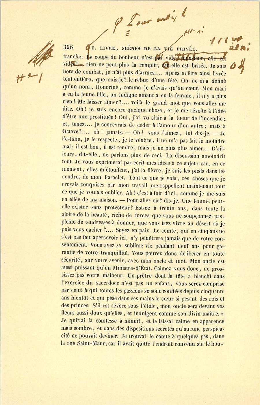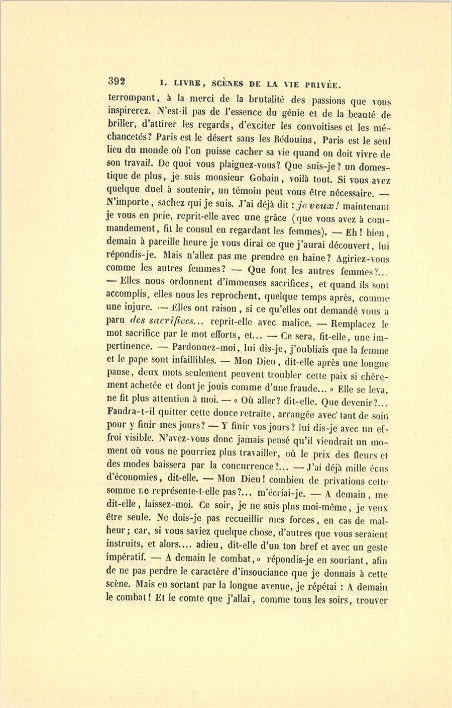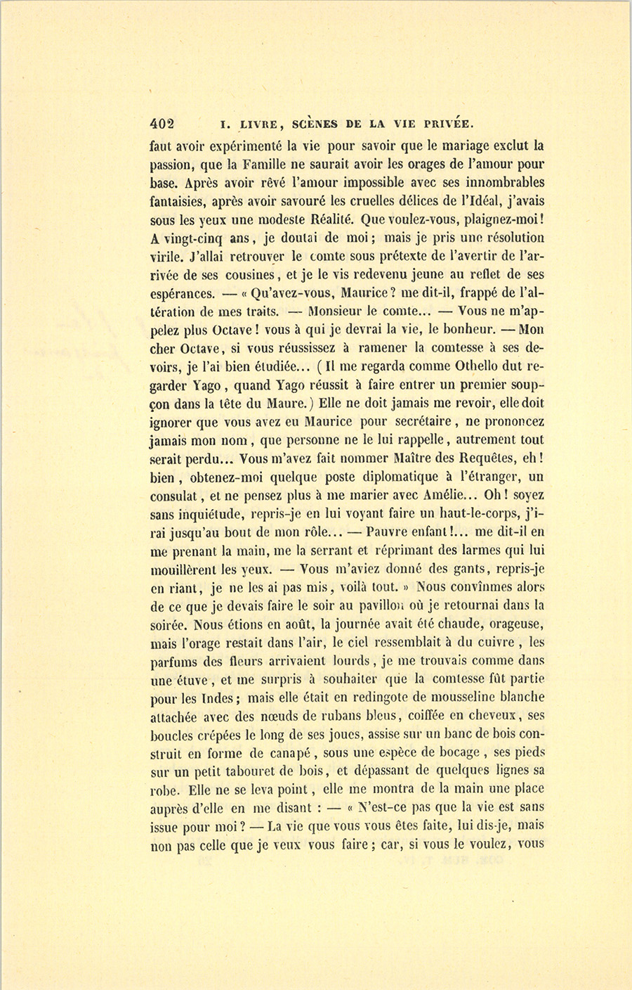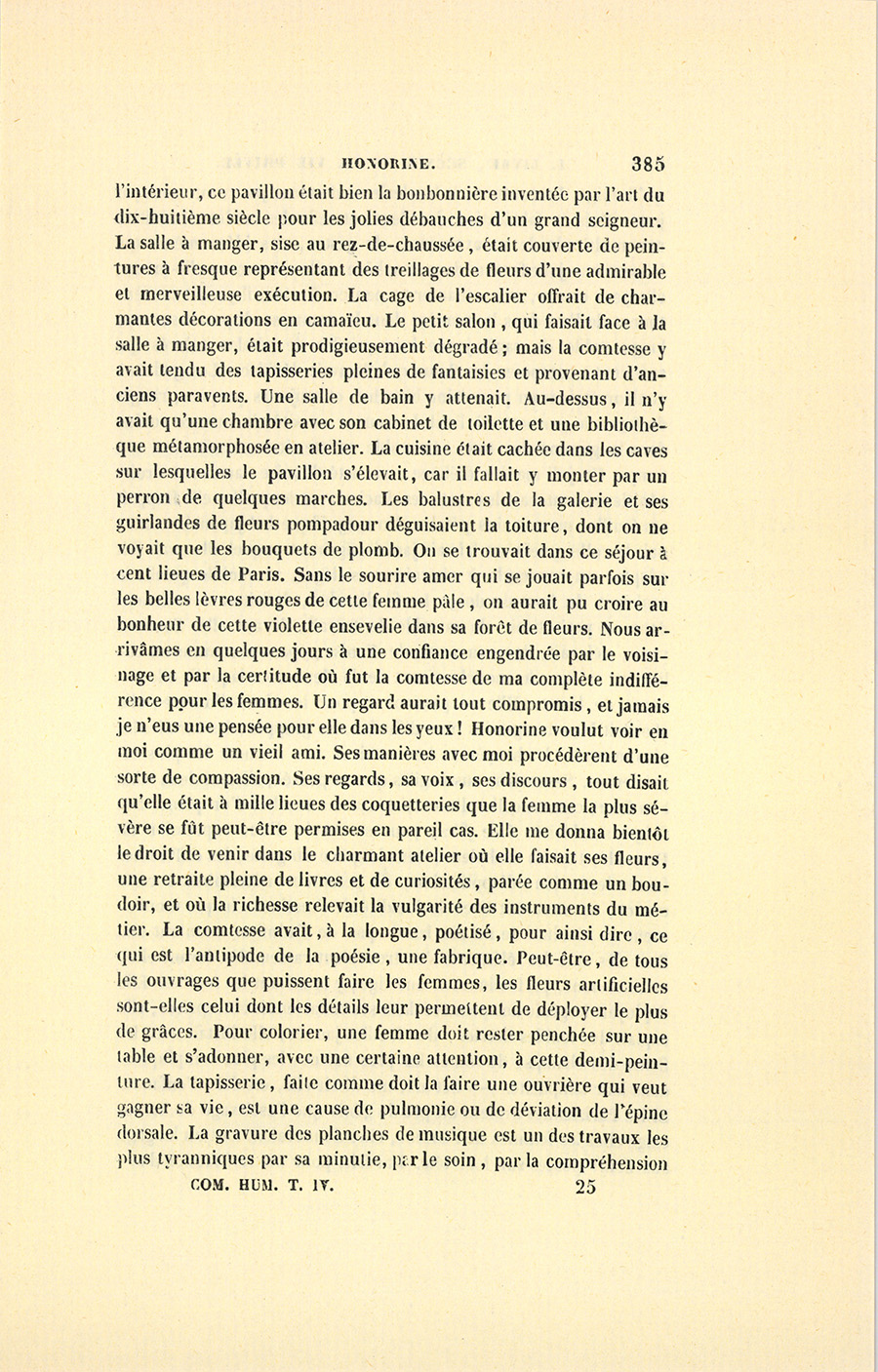 « Ceci est le drame dans mon âme, mais ce n’est pas le drame extérieur qui se joue en ce moment dans Paris ! Le drame intérieur n’intéresse personne. Je le sais, et vous le reconnaîtrez un jour, vous qui pleurez en ce moment avec moi : personne ne superpose à son cœur ni à son épiderme la douleur d’autrui. La mesure des douleurs est en nous. Vous-même, vous ne comprenez mes souffrances que par une analogie très-vague. Pouvez-vous me voir calmant les rages les plus violentes du désespoir par la contemplation d’une miniature où mon regard retrouve et baise son front, le sourire de ses lèvres, le contour de son visage, où je respire la blancheur de sa peau, et qui me permet presque de sentir, de manier les grappes noires de ses cheveux bouclés ? M’avez-vous surpris quand je bondis d’espérance, quand je me tords sous les mille flèches du désespoir, quand je marche dans la boue de Paris pour dompter mon impatience par la fatigue ? J’ai des énervements comparables à ceux des gens en consomption, des hilarités de fou, des appréhensions d’assassin qui rencontre un brigadier de gendarmerie. Enfin, ma vie est un continuel paroxisme de terreurs, de joies, de désespoirs. Quant au drame, le voici : Vous me croyez occupé du Conseil-d’État, de la Chambre, du Palais, de la politique !… Eh ! mon Dieu, sept heures de la nuit suffisent à tout, tant la vie que je mène a surexcité mes facultés. Honorine est ma grande affaire. Reconquérir ma femme, voilà ma seule étude ; la surveiller dans la cage où elle est, sans qu’elle se sache en ma puissance ; satisfaire à ses besoins, veiller au peu de plaisir qu’elle se permet, être sans cesse autour d’elle, comme un sylphe, sans me laisser ni voir ni deviner, car tout mon avenir serait perdu, voilà ma vie, ma vraie vie ! Depuis sept ans, je ne me suis jamais couché sans être {p. 374} allé voir la lumière de sa veilleuse, ou son ombre sur les rideaux de la fenêtre. Elle a quitté ma maison sans en vouloir emporter autre chose que sa toilette de ce jour-là. L’enfant a poussé la noblesse des sentiments jusqu’à la bêtise ! Aussi, dix-huit mois après sa fuite, était-elle abandonnée par son amant qui fut épouvanté par le visage âpre et froid, sinistre et puant de la Misère, le lâche ! Cet homme avait sans doute compté sur l’existence heureuse et dorée en Suisse et en Italie, que se donnent les grandes dames en quittant leurs maris. Honorine a de son chef soixante mille francs de rentes. Ce misérable a laissé la chère créature enceinte et sans un sou ! En 1820, au mois de novembre, j’ai obtenu du meilleur accoucheur de Paris de jouer le rôle d’un petit chirurgien de faubourg. J’ai décidé le curé du quartier où se trouvait la comtesse à subvenir à ses besoins, comme s’il accomplissait une œuvre de charité. Cacher le nom de ma femme, lui assurer l’incognito, lui trouver une ménagère qui me fût dévouée et qui fût une confidente intelligente, bah !… ce fut un travail digne de Figaro. Vous comprenez que, pour découvrir l’asile de ma femme, il me suffisait de vouloir. Après trois mois de désespérance plutôt que de désespoir, la pensée de me consacrer au bonheur d’Honorine, en prenant Dieu pour confident de mon rôle, fut un de ces poèmes qui ne tombent qu’au cœur d’un amant quand même ! Tout amour absolu veut sa pâture. Eh ! ne devais-je pas protéger cette enfant, coupable par ma seule imprudence, contre de nouveaux désastres ? accomplir enfin mon rôle d’ange gardien. Après sept mois de nourriture, le fils mourut, heureusement pour elle et pour moi. Ma femme fut entre la vie et la mort pendant neuf mois, abandonnée au moment où elle avait le plus besoin du bras d’un homme ; mais ce bras, dit-il en tendant le sien par un mouvement d’une énergie angélique, fut étendu sur sa tête. Honorine fut soignée comme elle l’eût été dans son hôtel. Quand, rétablie, elle demanda comment, par qui elle avait été secourue, on lui répondit : – Les sœurs de charité du quartier, – la Société de maternité, – le curé de la paroisse qui s’intéressait à elle. Cette femme, dont la fierté va jusqu’à être un vice, a déployé dans le malheur une force de résistance que, par certaines soirées, j’appelle un entêtement de mule. Honorine a voulu gagner sa vie ! ma femme travaille !… Depuis cinq ans, je la tiens, rue Saint-Maur, dans {p. 375} un charmant pavillon où elle fabrique des fleurs et des modes. Elle croit vendre les produits de son élégant travail à un marchand qui les lui paie assez cher pour que la journée lui vaille vingt francs, et n’a pas eu depuis six ans un seul soupçon. Elle paie toutes les choses de la vie à peu près le tiers de ce qu’elles valent, en sorte qu’avec six mille francs par an, elle vit comme si elle avait quinze mille francs. Elle a le goût des fleurs, et donne cent écus à un jardinier qui me coûte à moi douze cents francs de gages, et qui me présente des mémoires de deux mille francs tous les trois mois. J’ai promis à cet homme un marais et une maison de maraîcher contiguë à la loge du concierge de la rue Saint-Maur. Cette propriété m’appartient sous le nom d’un commis-greffier de la Cour. Une seule indiscrétion ferait tout perdre au jardinier. Honorine a son pavillon, un jardin, une serre superbe, pour cinq cents francs de loyer par an. Elle vit là, sous le nom de sa femme de charge, madame Gobain, cette vieille d’une discrétion à toute épreuve que j’ai trouvée, et de qui elle s’est fait aimer. Mais ce zèle est, comme celui du jardinier, entretenu par la promesse d’une récompense au jour du succès. Le concierge et sa femme me coûtent horriblement cher par les mêmes raisons. Enfin, depuis trois ans, Honorine est heureuse, elle croit devoir à son travail le luxe de ses fleurs, sa toilette et son bien-être. Oh 