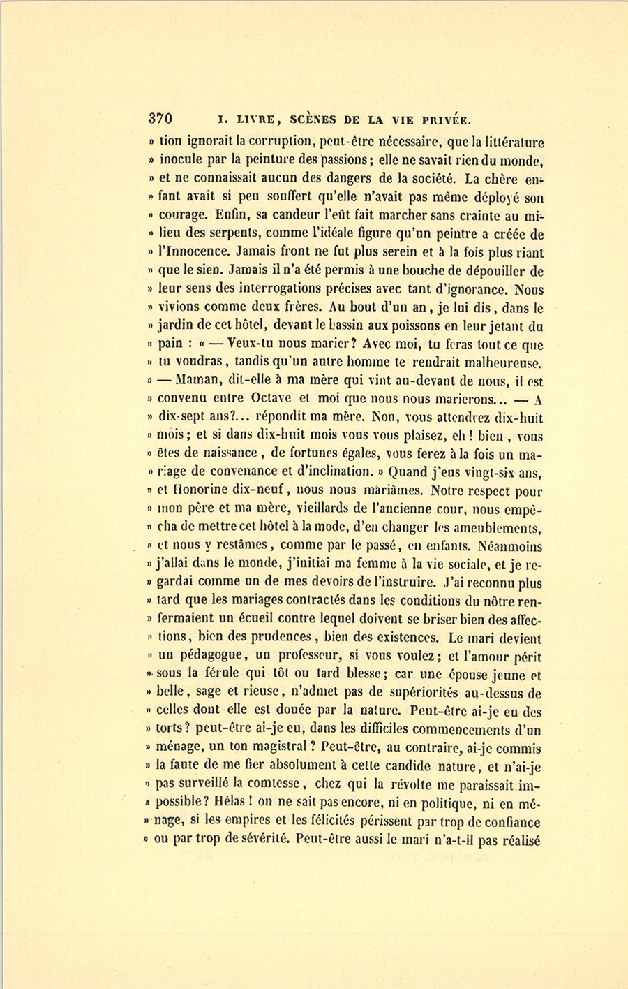 « Mon père avait une pupille, riche, belle et âgée de seize ans, au moment où je revins du collége dans ce vieil hôtel. Élevée par ma mère, Honorine s’éveillait alors à la vie. Pleine de grâces et d’enfantillage, elle rêvait le bonheur comme elle eût rêvé d’une parure, et peut-être le bonheur était-il pour elle la parure de l’âme ? Sa piété n’allait pas sans des joies puériles, car tout, même la religion, était une poésie pour ce cœur ingénu. Elle entrevoyait son avenir comme une fête perpétuelle. Innocente et pure, aucun délire n’avait troublé son sommeil. La honte et le chagrin n’avaient jamais altéré sa joue ni mouillé ses regards. Elle ne cherchait même pas le secret de ses émotions involontaires par un beau jour de printemps. Enfin, elle se sentait faible, destinée à l’obéissance, et attendait le mariage sans le désirer. Sa rieuse {p. 370} imagination ignorait la corruption, peut-être nécessaire, que la littérature inocule par la peinture des passions ; elle ne savait rien du monde, et ne connaissait aucun des dangers de la société. La chère enfant avait si peu souffert qu’elle n’avait pas même déployé son courage. Enfin, sa candeur l’eût fait marcher sans crainte au milieu des serpents, comme l’idéale figure qu’un peintre a créée de l’Innocence. Jamais front ne fut plus serein et à la fois plus riant que le sien. Jamais il n’a été permis à une bouche de dépouiller de leur sens des interrogations précises avec tant d’ignorance. Nous vivions comme deux frères. Au bout d’un an, je lui dis, dans le jardin de cet hôtel, devant le bassin aux poissons en leur jetant du pain : « – Veux-tu nous marier ? Avec moi, tu feras tout ce que tu voudras, tandis qu’un autre homme te rendrait malheureuse. » – Maman, dit-elle à ma mère qui vint au-devant de nous, il est convenu entre Octave et moi que nous nous marierons… – À dix-sept ans ?… répondit ma mère. Non, vous attendrez dix-huit mois ; et si dans dix-huit mois vous vous plaisez, eh ! bien, vous êtes de naissance, de fortunes égales, vous ferez à la fois un mariage de convenance et d’inclination. » Quand j’eus vingt-six ans, et Honorine dix-neuf, nous nous mariâmes. Notre respect pour mon père et ma mère, vieillards de l’ancienne cour, nous empêcha de mettre cet hôtel à la mode, d’en changer les ameublements, et nous y restâmes, comme par le passé, en enfants. Néanmoins j’allai dans le monde, j’initiai ma femme à la vie sociale, et je regardai comme un de mes devoirs de l’instruire. J’ai reconnu plus tard que les mariages contractés dans les conditions du nôtre renfermaient un écueil contre lequel doivent se briser bien des affections, bien des prudences, bien des existences. Le mari devient un pédagogue, un professeur, si vous voulez ; et l’amour périt sous la férule qui tôt ou tard blesse ; car une épouse jeune et belle, sage et rieuse, n’admet pas de supériorités au-dessus de celles dont elle est douée par la nature. Peut-être ai-je eu des torts ? peut-être ai-je eu, dans les difficiles commencements d’un ménage, un ton magistral ? Peut-être, au contraire, ai-je commis la faute de me fier absolument à cette candide nature, et n’ai-je pas surveillé la comtesse, chez qui la révolte me paraissait impossible ? Hélas ! on ne sait pas encore, ni en politique, ni en ménage, si les empires et les félicités périssent par trop de confiance ou par trop de sévérité. Peut-être aussi le mari n’a-t-il pas réalisé {p. 371} pour Honorine les rêves de la jeune fille ? Sait-on, pendant les jours de bonheur, à quels préceptes on a manqué ?… »