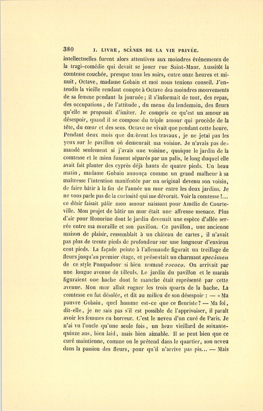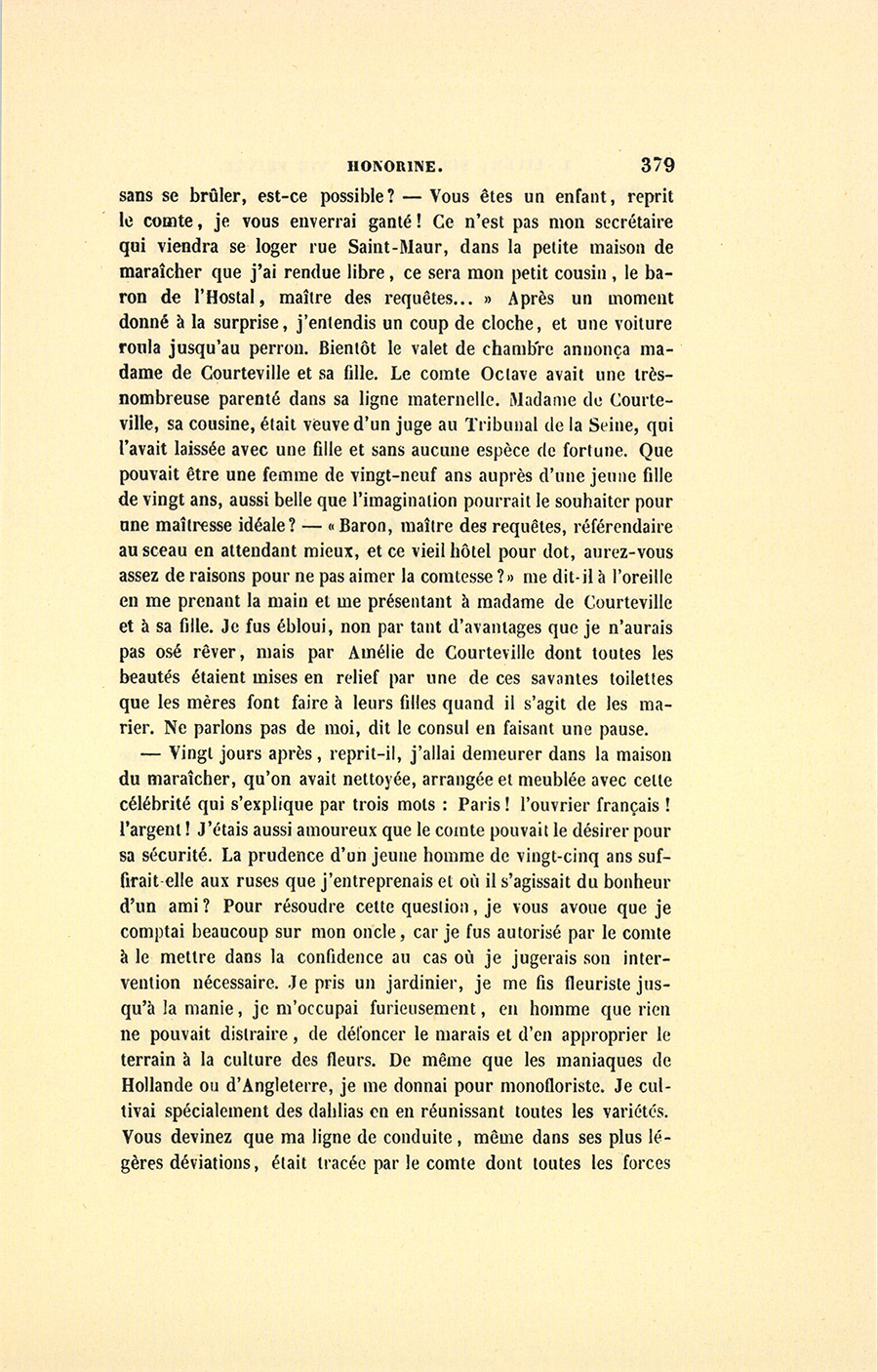 – Vingt jours après, reprit-il, j’allai demeurer dans la maison du maraîcher, qu’on avait nettoyée, arrangée et meublée avec cette célébrité qui s’explique par trois mots : Paris ! l’ouvrier français ! l’argent ! J’étais aussi amoureux que le comte pouvait le désirer pour sa sécurité. La prudence d’un jeune homme de vingt-cinq ans suffirait-elle aux ruses que j’entreprenais et où il s’agissait du bonheur d’un ami ? Pour résoudre cette question, je vous avoue que je comptai beaucoup sur mon oncle, car je fus autorisé par le comte à le mettre dans la confidence au cas où je jugerais son intervention nécessaire. Je pris un jardinier, je me fis fleuriste jusqu’à la manie, je m’occupai furieusement, en homme que rien ne pouvait distraire, de défoncer le marais et d’en approprier le terrain à la culture des fleurs. De même que les maniaques de Hollande ou d’Angleterre, je me donnai pour monofloriste. Je cultivai spécialement des dahlias en en réunissant toutes les variétés. Vous devinez que ma ligne de conduite, même dans ses plus légères déviations, était tracée par le comte dont toutes les forces {p. 380} intellectuelles furent alors attentives aux moindres événements de la tragi-comédie qui devait se jouer rue Saint-Maur. Aussitôt la comtesse couchée, presque tous les soirs, entre onze heures et minuit, Octave, madame Gobain et moi nous tenions conseil. J’entendis la vieille rendant compte à Octave des moindres mouvements de sa femme pendant la journée ; il s’informait de tout, des repas, des occupations, de l’attitude, du menu du lendemain, des fleurs qu’elle se proposait d’imiter. Je compris ce qu’est un amour au désespoir, quand il se compose du triple amour qui procède de la tête, du cœur et des sens. Octave ne vivait que pendant cette heure. Pendant deux mois que durèrent les travaux, je ne jetai pas les yeux sur le pavillon où demeurait ma voisine. Je n’avais pas demandé seulement si j’avais une voisine, quoique le jardin de la comtesse et le mien fussent séparés par un palis, le long duquel elle avait fait planter des cyprès déjà hauts de quatre pieds. Un beau matin, madame Gobain annonça comme un grand malheur à sa maîtresse l’intention manifestée par un original devenu son voisin, de faire bâtir à la fin de l’année un mur entre les deux jardins. Je ne vous parle pas de la curiosité qui me dévorait. Voir la comtesse !… ce désir faisait pâlir mon amour naissant pour Amélie de Courteville. Mon projet de bâtir un mur était une affreuse menace. Plus d’air pour Honorine dont le jardin devenait une espèce d’allée serrée entre ma muraille et son pavillon. Ce pavillon, une ancienne maison de plaisir, ressemblait à un château de cartes, il n’avait pas plus de trente pieds de profondeur sur une longueur d’environ cent pieds. La façade peinte à l’allemande figurait un treillage de fleurs jusqu’au premier étage, et présentait un charmant specimen de ce style Pompadour si bien nommé rococo. On arrivait par une longue avenue de tilleuls. Le jardin du pavillon et le marais figuraient une hache dont le manche était représenté par cette avenue. Mon mur allait rogner les trois quarts de la hache. La comtesse en fut désolée, et dit au milieu de son désespoir : – « Ma pauvre Gobain, quel homme est-ce que ce fleuriste ? – Ma foi, dit-elle, je ne sais pas s’il est possible de l’apprivoiser, il paraît avoir les femmes en horreur. C’est le neveu d’un curé de Paris. Je n’ai vu l’oncle qu’une seule fois, un beau vieillard de soixante-quinze ans, bien laid, mais bien aimable. Il se peut bien que ce curé maintienne, comme on le prétend dans le quartier, son neveu dans la passion des fleurs, pour qu’il n’arrive pas pis… – Mais {p. 381} quoi ? – Eh ! bien, votre voisin est un hurluberlu… » fit la Gobain en montrant sa tête. Les fous tranquilles sont les seuls hommes de qui les femmes ne conçoivent aucune méfiance en fait de sentiment. Vous allez voir par la suite combien le comte avait vu juste en me choisissant ce rôle. – « Mais, qu’a-t-il ? demanda la comtesse. – Il a trop étudié, répondit la Gobain, il est devenu sauvage. Enfin, il a des raisons pour ne plus aimer les femmes… là, puisque vous voulez savoir tout ce qui se dit. – Eh ! bien, reprit Honorine, les fous m’effraient moins que les gens sages, je lui parlerai, moi ! dis-lui que je le prie de venir. Si je ne réussis pas, je verrai le curé. » Le lendemain de cette conversation, en me promenant dans mes allées tracées, j’entrevis au premier étage du pavillon les rideaux d’une fenêtre écartés et la figure d’une femme posée en curieuse. La Gobain m’aborda. Je regardai brusquement le pavillon et fis un geste brutal, comme si je disais : – Eh ! je me moque bien de votre maîtresse ! – « Madame, dit la Gobain, qui revint rendre compte de son ambassade, le fou m’a priée de le laisser tranquille, en prétendant que charbonnier était maître chez soi, surtout quand il était sans femme. – Il a deux fois raison, répondit la comtesse. – Oui, mais il a fini par me répondre : « J’irai ! » quand je lui ai répondu qu’il ferait le malheur d’une personne qui vivait dans la retraite, et qui puisait de grandes distractions dans la culture des fleurs. » Le lendemain, je sus par un signe de la Gobain qu’on attendait ma visite. Après le déjeuner de la comtesse, au moment où elle se promenait devant son pavillon, je brisai le palis et je vins à elle. J’étais mis en campagnard : vieux pantalon à pied en molleton gris, gros sabots, vieille veste de chasse, casquette en tête, méchant foulard au cou, les mains salies de terre, et un plantoir à la main. – « Madame, c’est le monsieur qui est votre voisin ! » cria la Gobain. La comtesse ne s’était pas effrayée. J’aperçus 