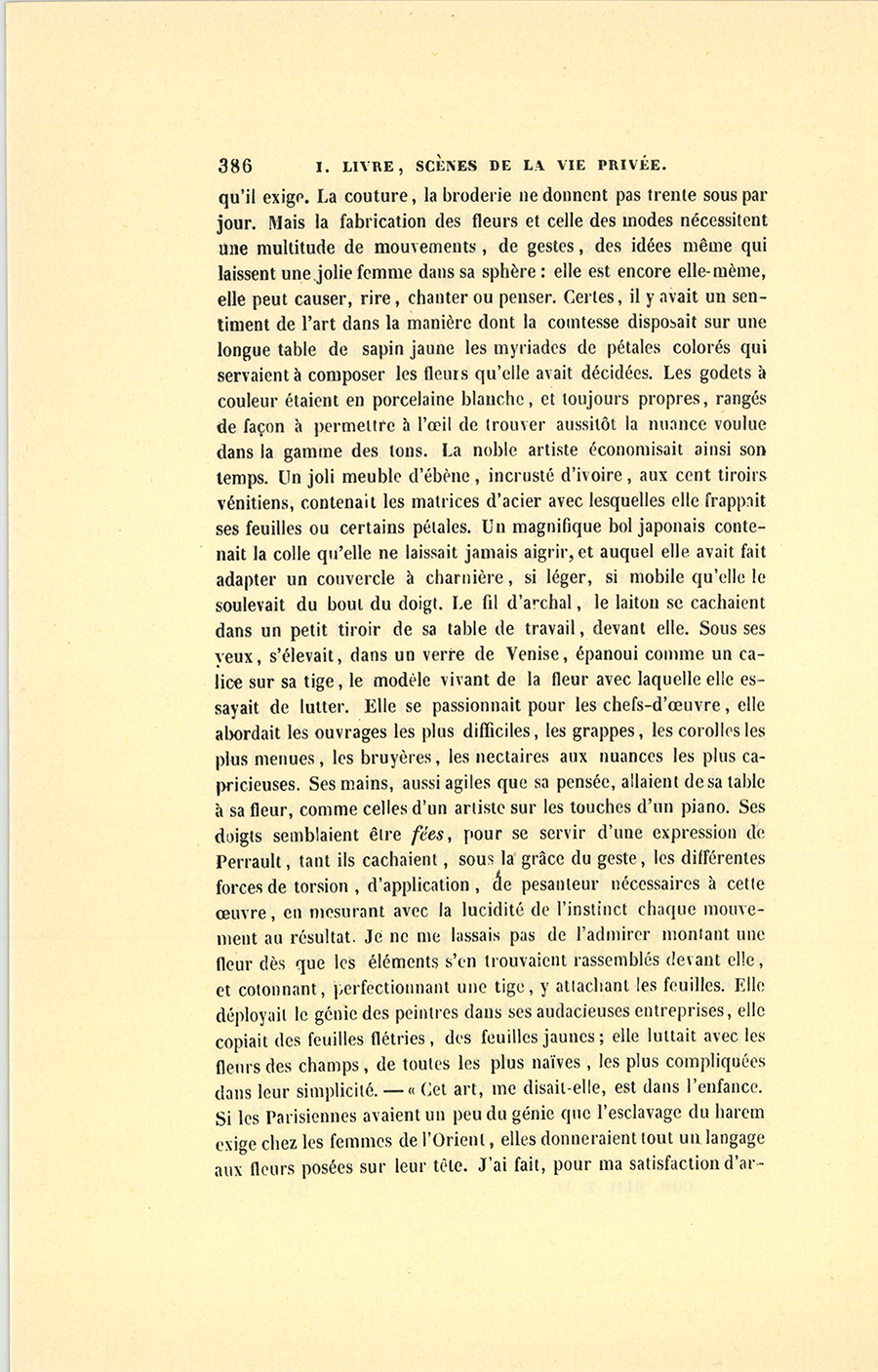 Maintenant, une fois la réunion expliquée, il est facile de concevoir que l’étiquette en avait été bannie, ainsi que beaucoup de femmes et des plus élevées, curieuses de savoir si la virilité du talent de Camille Maupin nuisait aux grâces de la jolie femme, et si, en un mot, le haut-de-chausses dépassait la jupe. Depuis le dîner jusqu’à neuf heures, moment où la collation fut servie, si la {p. 349} conversation avait été rieuse et grave tour à tour, sans cesse égayée par les traits de Léon de Lora, qui passe pour l’homme le plus malicieux du Paris actuel, par un bon goût qui ne surprendra pas d’après le choix des convives, il avait été peu question de littérature ; mais enfin le papillonnement de ce tournoi français devait y arriver, ne fût-ce que pour effleurer ce sujet essentiellement national. Mais avant d’arriver au tournant de conversation qui fit prendre la parole au Consul-Général, il n’est pas inutile de dire un mot sur sa famille et sur lui.