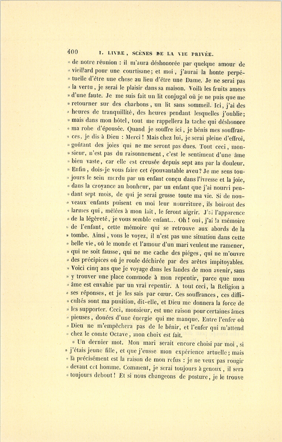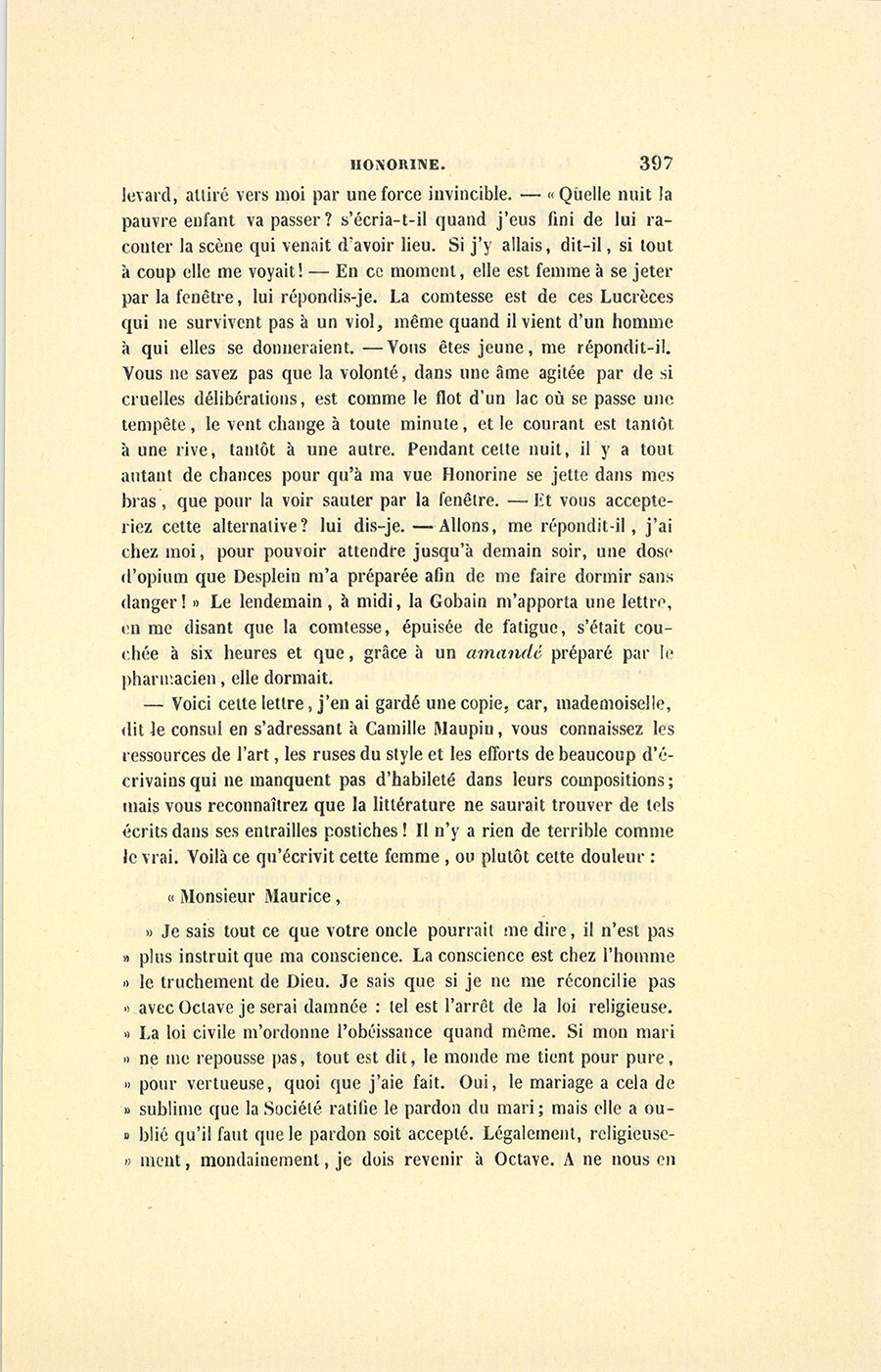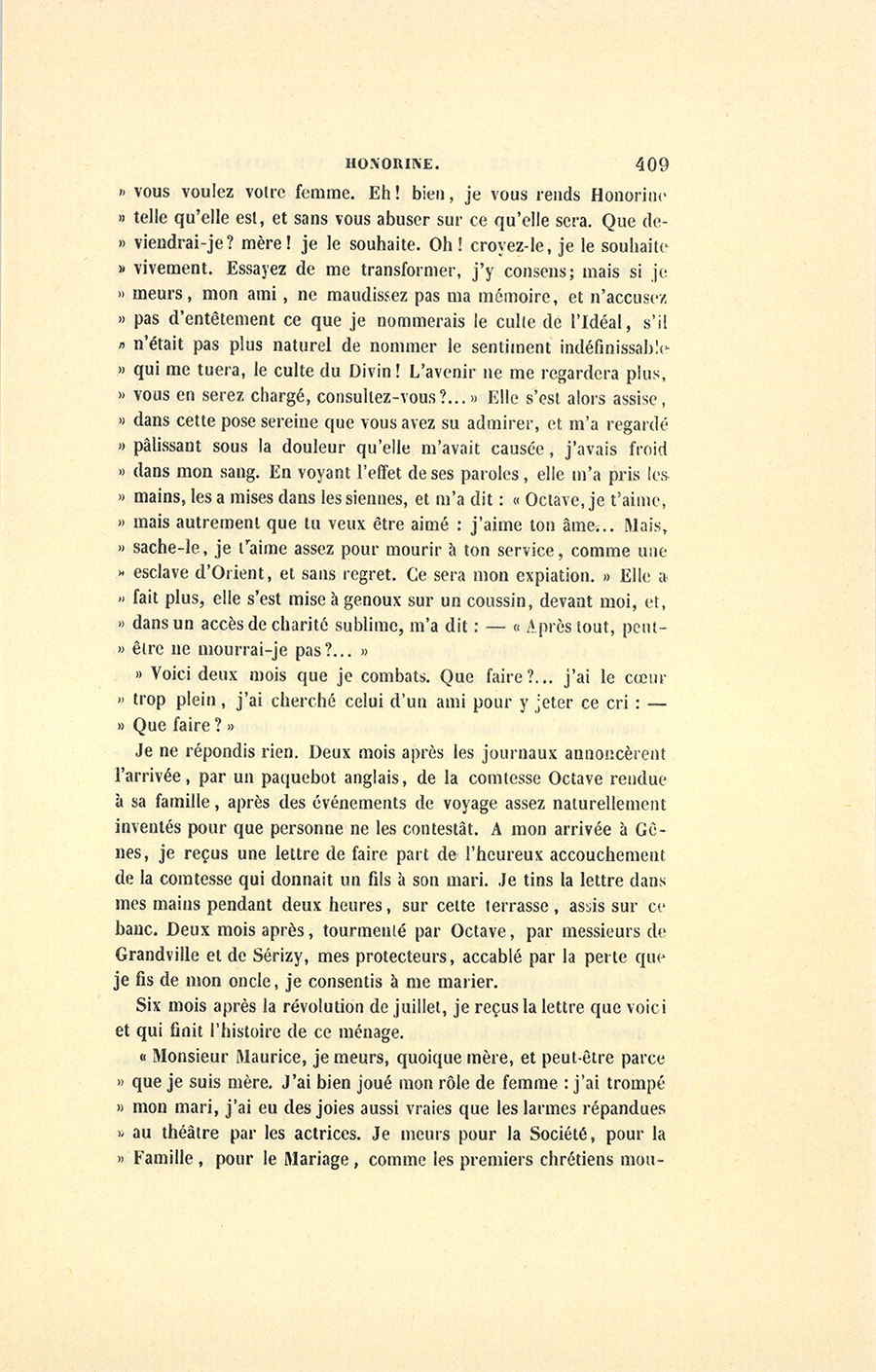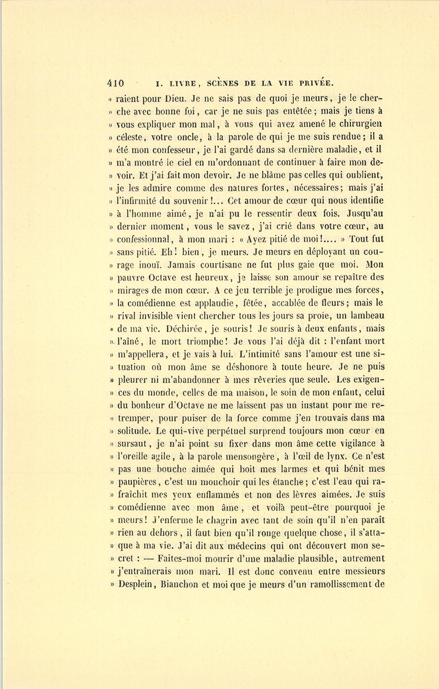 « Monsieur Maurice, je meurs, quoique mère, et peut-être parce que je suis mère. J’ai bien joué mon rôle de femme : j’ai trompé mon mari, j’ai eu des joies aussi vraies que les larmes répandues au théâtre par les actrices. Je meurs pour la Société, pour la Famille, pour le Mariage, comme les premiers chrétiens {p. 410} mouraient pour Dieu. Je ne sais pas de quoi je meurs, je le cherche avec bonne foi, car je ne suis pas entêtée ; mais je tiens à vous expliquer mon mal, à vous qui avez amené le chirurgien céleste, votre oncle, à la parole de qui je me suis rendue ; il a été mon confesseur, je l’ai gardé dans sa dernière maladie, et il m’a montré le ciel en m’ordonnant de continuer à faire mon devoir. Et j’ai fait mon devoir. Je ne blâme pas celles qui oublient, je les admire comme des natures fortes, nécessaires ; mais j’ai l’infirmité du souvenir !… Cet amour de cœur qui nous identifie à l’homme aimé, je n’ai pu le ressentir deux fois. Jusqu’au dernier moment, vous le savez, j’ai crié dans votre cœur, au confessionnal, à mon mari : « Ayez pitié de moi !… » Tout fut sans pitié. Eh ! bien, je meurs. Je meurs en déployant un courage inouï. Jamais courtisane ne fut plus gaie que moi. Mon pauvre Octave est heureux, je laisse son amour se repaître des mirages de mon cœur. À ce jeu terrible je prodigue mes forces, la comédienne est applaudie, fêtée, accablée de fleurs ; mais le rival invisible vient chercher tous les jours sa proie, un lambeau de ma vie. Déchirée, je souris ! Je souris à deux enfants, mais l’aîné, le mort triomphe ! Je vous l’ai déjà dit : l’enfant mort m’appellera, et je vais à lui. L’intimité sans l’amour est une situation où mon âme se déshonore à toute heure. Je ne puis pleurer ni m’abandonner à mes rêveries que seule. Les exigences du monde, celles de ma maison, le soin de mon enfant, celui du bonheur d’Octave ne me laissent pas un instant pour me retremper, pour puiser de la force comme j’en trouvais dans ma solitude. Le qui-vive perpétuel surprend toujours mon cœur en sursaut, je n’ai point su fixer dans mon âme cette vigilance à l’oreille agile, à la parole mensongère, à l’œil de lynx. Ce n’est pas une bouche aimée qui boit mes larmes et qui bénit mes paupières, c’est un mouchoir qui les étanche ; c’est l’eau qui rafraîchit mes yeux enflammés et non des lèvres aimées. Je suis comédienne avec mon âme, et voilà peut-être pourquoi je meurs ! J’enferme le chagrin avec tant de soin qu’il n’en paraît rien au dehors, il faut bien qu’il ronge quelque chose, il s’attaque à ma vie. J’ai dit aux médecins qui ont découvert mon secret : – Faites-moi mourir d’une maladie plausible, autrement j’entraînerais mon mari. Il est donc convenu entre messieurs Desplein, Bianchon et moi que je meurs d’un ramollissement de {p. 411} je ne sais quel os que la science a parfaitement décrit. Octave se croit adoré !… Me comprenez-vous bien ? Aussi ai-je peur qu’il ne me suive. Je vous écris pour vous prier d’être, dans ce cas, le tuteur du jeune comte. Vous trouverez ci-joint un codicile où j’exprime ce vœu : vous n’en ferez usage qu’au moment où ce serait nécessaire, car peut-être ai-je de la fatuité. Mon dévouement caché laissera peut-être Octave inconsolable, mais vivant ! Pauvre Octave ! je lui souhaite une femme meilleure que moi, car il mérite bien d’être aimé. Puisque mon spirituel espion s’est marié, qu’il se rappelle ce que la fleuriste de la rue Saint-Maur lui lègue ici comme enseignement : Que votre femme soit promptement mère ! Jetez-la dans les matérialités les plus vulgaires du ménage ; empêchez-la de cultiver dans son cœur la mystérieuse fleur de l’Idéal, cette perfection céleste à laquelle j’ai cru, cette fleur enchantée, aux couleurs ardentes, et dont les parfums inspirent le dégoût des réalités. Je suis une sainte Thérèse qui n’a pu se nourrir d’extases, au fond d’un couvent avec le divin Jésus, avec un ange irréprochable, ailé, pour venir et pour s’enfuir à propos. Vous m’avez vue heureuse au milieu de mes fleurs bien-aimées. Je ne vous ai pas tout dit : je voyais l’amour fleurissant sous votre fausse folie, je vous ai caché mes pensées, mes poésies, je ne vous ai pas fait entrer dans mon beau royaume. Enfin, vous aimerez mon enfant pour l’amour de moi, s’il se trouvait un jour sans son pauvre père. Gardez mes secrets comme la tombe me gardera. Ne me pleurez pas : il y a longtemps que je suis morte, si saint Bernard a eu raison de dire qu’il n’y a plus de vie là où il n’y a plus d’amour. »
