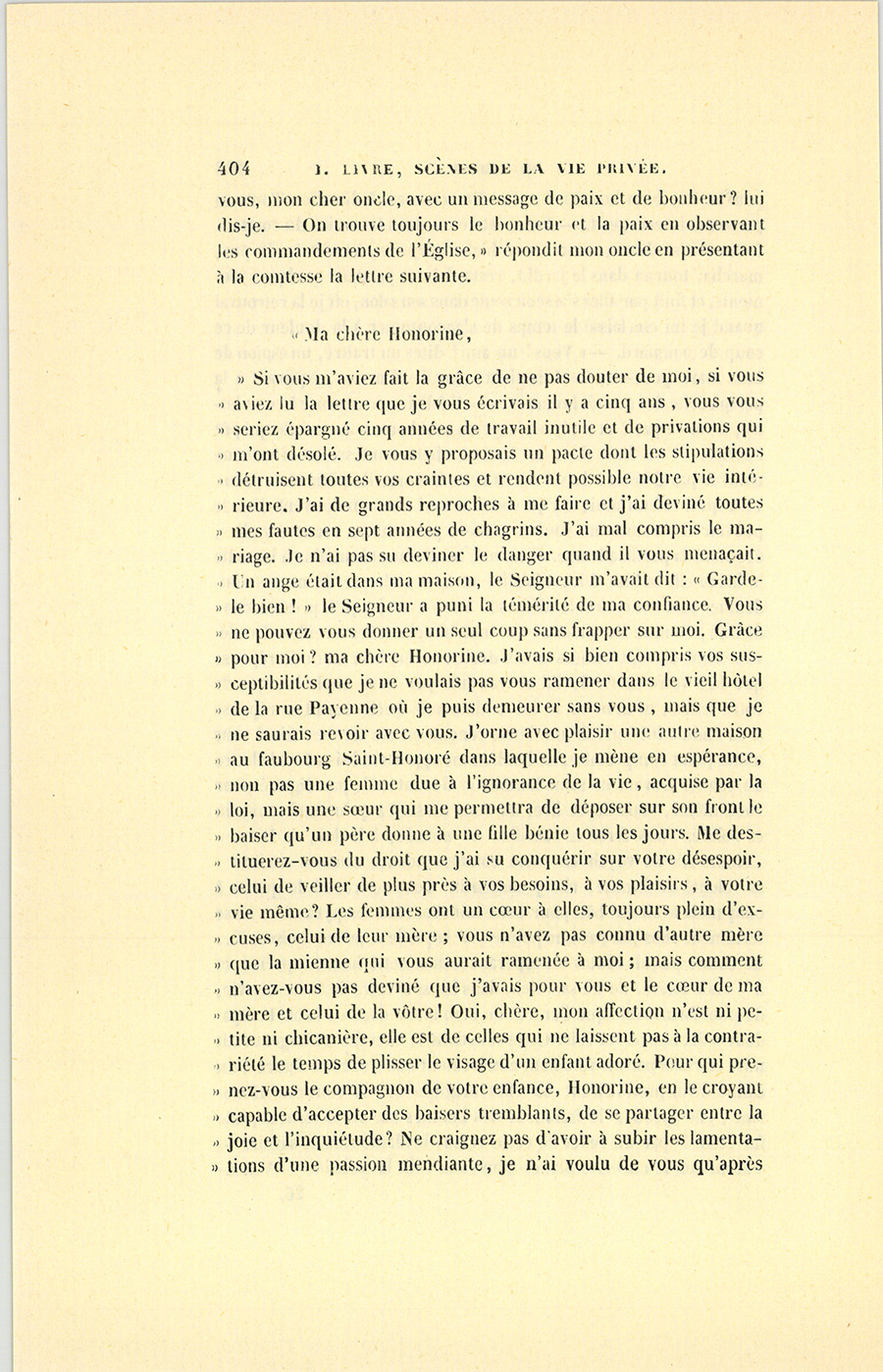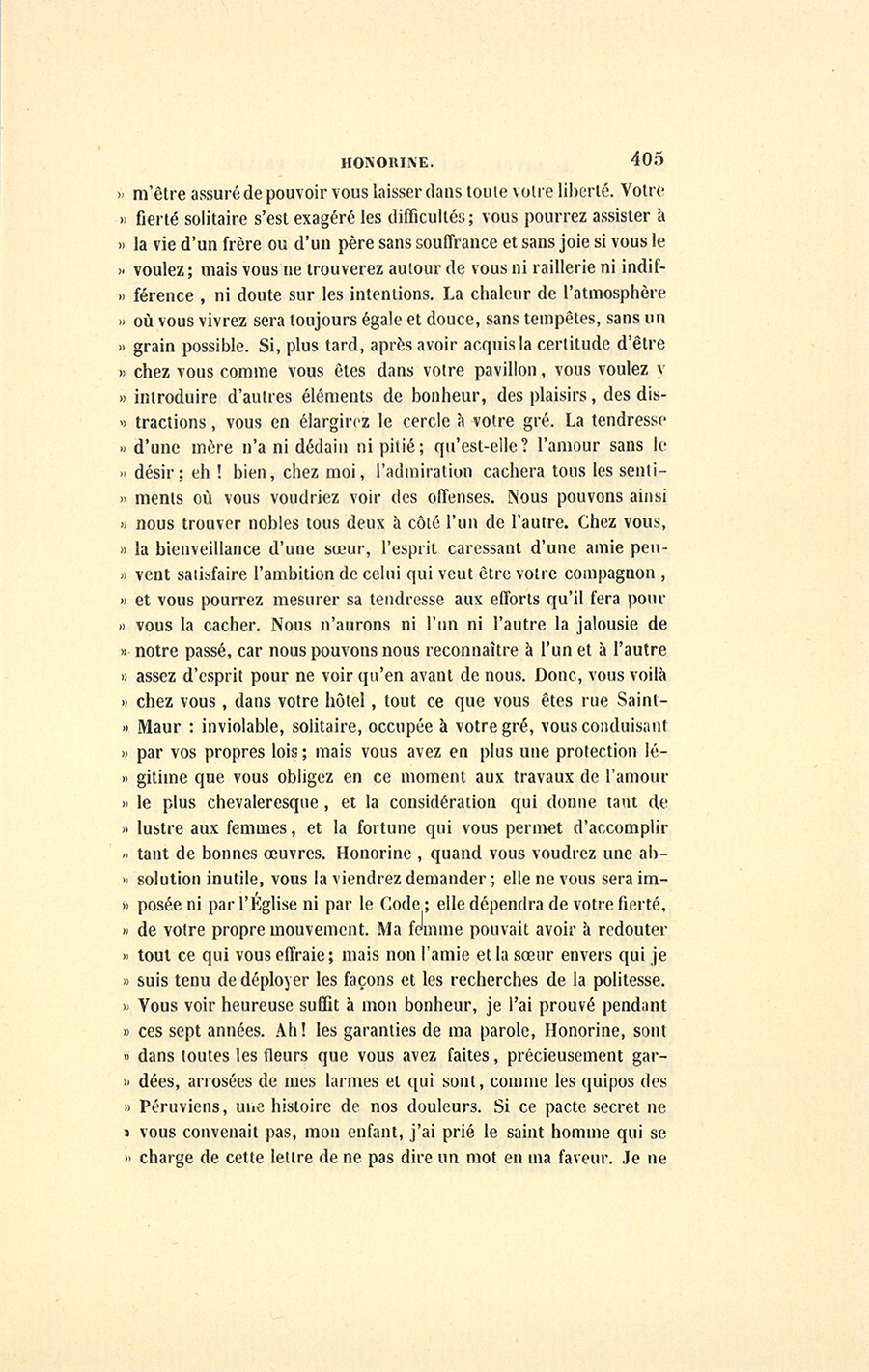 Si vous m’aviez fait la grâce de ne pas douter de moi, si vous aviez lu la lettre que je vous écrivais il y a cinq ans, vous vous seriez épargné cinq années de travail inutile et de privations qui m’ont désolé. Je vous y proposais un pacte dont les stipulations détruisent toutes vos craintes et rendent possible notre vie intérieure. J’ai de grands reproches à me faire et j’ai deviné toutes mes fautes en sept années de chagrins. J’ai mal compris le mariage. Je n’ai pas su deviner le danger quand il vous menaçait. Un ange était dans ma maison, le Seigneur m’avait dit : « Garde-le bien ! » le Seigneur a puni la témérité de ma confiance. Vous ne pouvez vous donner un seul coup sans frapper sur moi. Grâce pour moi ? ma chère Honorine. J’avais si bien compris vos susceptibilités que je ne voulais pas vous ramener dans le vieil hôtel de la rue Payenne où je puis demeurer sans vous, mais que je ne saurais revoir avec vous. J’orne avec plaisir une autre maison au faubourg Saint-Honoré dans laquelle je mène en espérance, non pas une femme due à l’ignorance de la vie, acquise par la loi, mais une sœur qui me permettra de déposer sur son front le baiser qu’un père donne à une fille bénie tous les jours. Me destituerez-vous du droit que j’ai su conquérir sur votre désespoir, celui de veiller de plus près à vos besoins, à vos plaisirs, à votre vie même ? Les femmes ont un cœur à elles, toujours plein d’excuses, celui de leur mère ; vous n’avez pas connu d’autre mère que la mienne qui vous aurait ramenée à moi ; mais comment n’avez-vous pas deviné que j’avais pour vous et le cœur de ma mère et celui de la vôtre ! Oui, chère, mon affection n’est ni petite ni chicanière, elle est de celles qui ne laissent pas à la contrariété le temps de plisser le visage d’un enfant adoré. Pour qui prenez-vous le compagnon de votre enfance, Honorine, en le croyant capable d’accepter des baisers tremblants, de se partager entre la joie et l’inquiétude ? Ne craignez pas d’avoir à subir les lamentations d’une passion mendiante, je n’ai voulu de vous qu’après {p. 405} m’être assuré de pouvoir vous laisser dans toute votre liberté. Votre fierté solitaire s’est exagéré les difficultés ; vous pourrez assister à la vie d’un frère ou d’un père sans souffrance et sans joie si vous le voulez ; mais vous ne trouverez autour de vous ni raillerie ni indifférence, ni doute sur les intentions. La chaleur de l’atmosphère où vous vivrez sera toujours égale et douce, sans tempêtes, sans un grain possible. Si, plus tard, après avoir acquis la certitude d’être chez vous comme vous êtes dans votre pavillon, vous voulez y introduire d’autres éléments de bonheur, des plaisirs, des distractions, vous en élargirez le cercle à votre gré. La tendresse d’une mère n’a ni dédain ni pitié ; qu’est-elle ? l’amour sans le désir ; eh ! bien, chez moi, l’admiration cachera tous les sentiments où vous voudriez voir des offenses. Nous pouvons ainsi nous trouver nobles tous deux à côté l’un de l’autre. Chez vous, la bienveillance d’une sœur, l’esprit caressant d’une amie peuvent satisfaire l’ambition de celui qui veut être votre compagnon, et vous pourrez mesurer sa tendresse aux efforts qu’il fera pour vous la cacher. Nous n’aurons ni l’un ni l’autre la jalousie de notre passé, car nous pouvons nous reconnaître à l’un et à l’autre assez d’esprit pour ne voir qu’en avant de nous. Donc, vous voilà chez vous, dans votre hôtel, tout ce que vous êtes rue Saint-Maur : inviolable, solitaire, occupée à votre gré, vous conduisant par vos propres lois ; mais vous avez en plus une protection légitime que vous obligez en ce moment aux travaux de l’amour le plus chevaleresque, et la considération qui donne tant de lustre aux femmes, et la fortune qui vous permet d’accomplir tant de bonnes œuvres. Honorine, quand vous voudrez une absolution inutile, vous la viendrez demander ; elle ne vous sera imposée ni par l’Église ni par le Code ; elle dépendra de votre fierté, de votre propre mouvement. Ma femme pouvait avoir à redouter tout ce qui vous effraie ; mais non l’amie et la sœur envers qui je suis tenu de déployer les façons et les recherches de la politesse. Vous voir heureuse suffit à mon bonheur, je l’ai prouvé pendant ces sept années. Ah ! les garanties de ma parole, Honorine, sont dans toutes les fleurs que vous avez faites, précieusement gardées, arrosées de mes larmes et qui sont, comme les quipos des Péruviens, une histoire de nos douleurs. Si ce pacte secret ne vous convenait pas, mon enfant, j’ai prié le saint homme qui se charge de cette lettre de ne pas dire un mot en ma faveur. Je ne {p. 406} veux devoir votre retour ni aux terreurs que vous imprimerait l’Église, ni aux ordres de la Loi. Je ne veux recevoir que de vous-même le simple et modeste bonheur que je demande. Si vous persistez à m’imposer la vie sombre et délaissée de tout sourire fraternel que je mène depuis neuf ans, si vous restez dans votre désert, seule et immobile, ma volonté fléchira devant la vôtre. Sachez-le bien : vous ne serez pas plus troublée que vous ne l’avez été jusqu’aujourd’hui. Je ferai donner congé à ce fou qui s’est mêlé de vos affaires, et qui peut-être vous a chagrinée…