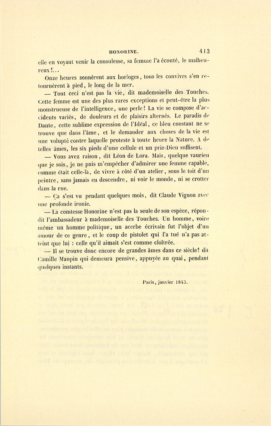 – Tout ceci n’est pas la vie, dit mademoiselle des Touches. Cette femme est une des plus rares exceptions et peut-être la plus monstrueuse de l’intelligence, une perle ! La vie se compose d’accidents variés, de douleurs et de plaisirs alternés. Le paradis de Dante, cette sublime expression de l’Idéal, ce bleu constant ne se trouve que dans l’âme, et le demander aux choses de la vie est une volupté contre laquelle proteste à toute heure la Nature. À de telles âmes, les six pieds d’une cellule et un prie-Dieu suffisent.