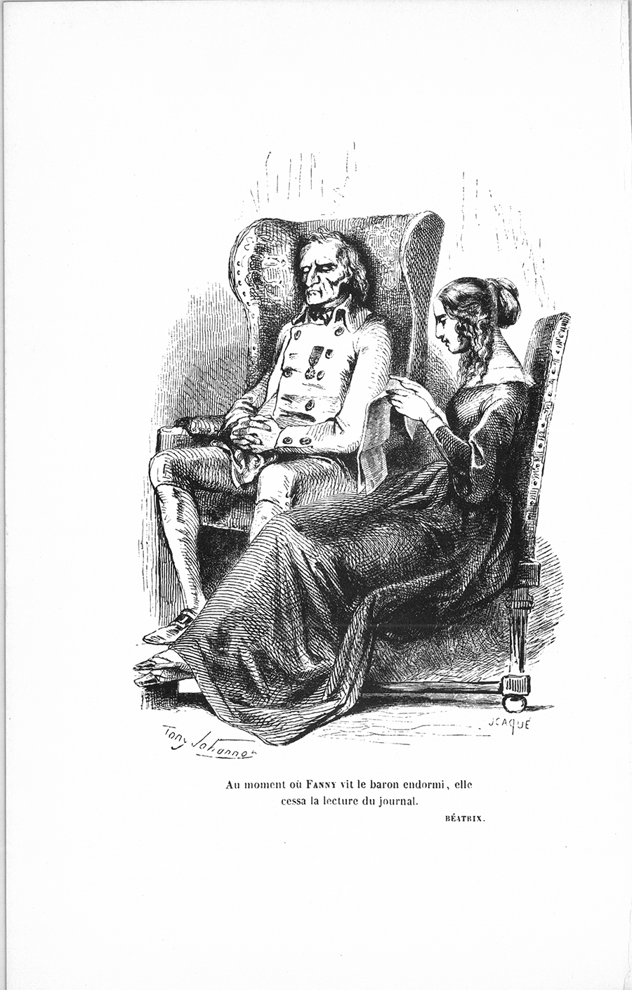 Vers six heures du soir, au moment où commence cette scène, le baron, qui, selon sa vieille habitude, avait fini de dîner à quatre heures, venait de s’endormir en entendant lire la Quotidienne. Sa tête s’était posée sur le dossier de son fauteuil au coin de la cheminée, du côté du jardin.