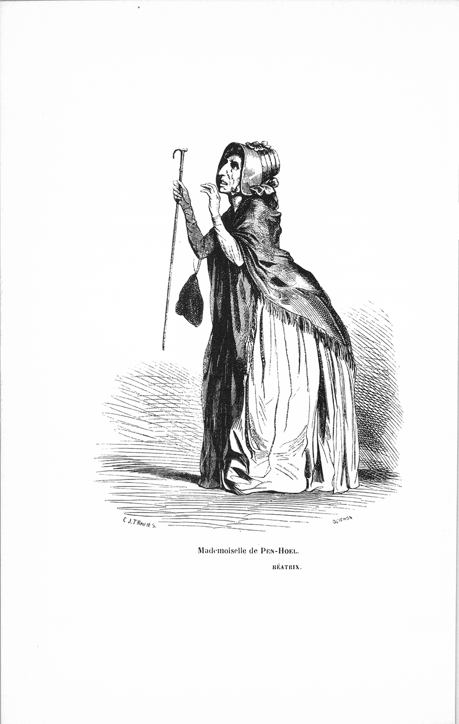 Cette demoiselle était une sèche et mince fille, jaune comme {p. 310} le parchemin d’un olim, ridée comme un lac froncé par le vent, à yeux gris, à grandes dents saillantes, à mains d’homme, assez petite, un peu déjetée et peut-être bossue ; mais personne n’avait été curieux de connaître ni ses perfections ni ses imperfections. Vêtue dans le goût de mademoiselle du Guénic, elle mouvait une énorme quantité de linges et de jupes quand elle voulait trouver l’une des deux ouvertures de sa robe par où elle atteignait ses poches. Le plus étrange cliquetis de clefs et de monnaie retentissait alors sous ces étoffes. Elle avait toujours d’un côté toute la ferraille des bonnes ménagères, et de l’autre sa tabatière d’argent, son dé, son tricot, autres ustensiles sonores. Au lieu du béguin matelassé de mademoiselle du Guénic, elle portait un chapeau vert avec lequel elle devait aller visiter ses melons ; il avait passé, comme eux, du vert au blond ; et, quant à sa forme, après vingt ans, la mode l’a ramenée à Paris sous le nom de bibi. Ce chapeau se confectionnait sous ses yeux par les mains de ses nièces, avec du florence vert acheté à Guérande, avec une carcasse qu’elle renouvelait tous les cinq ans à Nantes, car elle lui accordait la durée d’une législature. Ses nièces lui faisaient également ses robes, taillées sur des patrons immuables. Cette vieille fille avait encore la canne à petit bec de laquelle les femmes se servaient au commencement du règne de Marie-Antoinette. Elle était de la plus haute noblesse de Bretagne. Ses armes portaient les hermines des anciens ducs. En elle et sa sœur finissait l’illustre maison bretonne des Pen-Hoël. Sa sœur cadette avait épousé un Kergarouët, qui malgré la désapprobation du pays joignait le nom de Pen-Hoël au sien et se faisait appeler le vicomte de Kergarouët-Pen-Hoël. – Le ciel l’a puni, disait la vieille demoiselle, il n’a que des filles, et le nom de Kergarouët-Pen-Hoël s’éteindra. Mademoiselle de Pen-Hoël possédait environ sept mille livres de rentes en fonds de terre. Majeure depuis trente-six ans, elle administrait elle-même ses biens, allait les inspecter à cheval et déployait en toute chose le caractère ferme qui se remarque chez la plupart des bossus. Elle était d’une avarice admirée à dix lieues à la ronde, et qui n’y rencontrait aucune désapprobation. Elle avait avec elle une seule femme et ce petit domestique. Toute sa dépense, non compris les impôts, ne montait pas à plus de mille francs par an. Aussi était-elle l’objet des cajoleries des Kergarouët-Pen-Hoël, qui passaient leurs hivers à Nantes et les étés à leur terre située au bord de la {p. 311} Loire, au-dessous d’Indret. On la savait disposée à donner sa fortune et ses économies à celle de ses nièces qui lui plairait. Tous les trois mois, une des quatre demoiselles de Kergarouët, dont la plus jeune avait douze et l’aînée vingt ans, venait passer quelques jours chez elle. Amie de Zéphirine du Guénic, Jacqueline de Pen-Hoël, élevée dans l’adoration des grandeurs bretonnes des du Guénic, avait, dès la naissance de Calyste, formé le projet de transmettre ses biens au chevalier en le mariant à l’une des nièces que devait lui donner la vicomtesse de Kergarouët-Pen-Hoël. Elle pensait à racheter quelques-unes des meilleures terres des du Guénic en remboursant les fermiers engagistes. Quand l’avarice se propose un but, elle cesse d’être un vice, elle est le moyen d’une vertu, ses privations excessives deviennent de continuelles offrandes, elle a enfin la grandeur de l’intention cachée sous ses petitesses. Peut-être Zéphirine était-elle dans le secret de Jacqueline. Peut-être la baronne, dont tout l’esprit était employé dans son amour pour son fils et dans sa tendresse pour le père, avait-elle deviné quelque chose en voyant avec quelle malicieuse persévérance mademoiselle de Pen-Hoël amenait avec elle chaque jour Charlotte de Kergarouët, sa favorite, âgée de quinze ans. Le curé Grimont était certes dans la confidence, il aidait la vieille fille à bien placer son argent. Mais mademoiselle de Pen-Hoël aurait-elle eu trois cent mille francs en or, somme à laquelle étaient évaluées ses économies ; eût-elle eu dix fois plus de terres qu’elle n’en possédait, les du Guénic ne se seraient pas permis une attention qui pût faire croire à la vieille fille qu’on pensât à sa fortune. Par un sentiment de fierté bretonne admirable, Jacqueline de Pen-Hoël, heureuse de la suprématie affectée par sa vieille amie Zéphirine et par les du Guénic, se montrait toujours honorée de la visite que daignaient lui faire la fille des rois d’Irlande et Zéphirine. Elle allait jusqu’à cacher avec soin l’espèce de sacrifice auquel elle consentait tous les soirs en laissant son petit domestique brûler chez les du Guénic un oribus, nom de cette chandelle couleur de pain d’épice qui se consomme dans certaines parties de l’Ouest. Ainsi cette vieille et riche fille était la noblesse, la fierté, la grandeur en personne. Au moment où vous lisez son portrait, une indiscrétion de l’abbé Grimont a fait savoir que dans la soirée où le vieux baron, le jeune chevalier et Gasselin décampèrent munis de leurs sabres et de leurs canardières pour rejoindre {p. 312} Madame en Vendée, à la grande terreur de Fanny, à la grande joie des Bretons, mademoiselle de Pen-Hoël avait remis au baron une somme de dix mille livres en or, immense sacrifice corroboré de dix mille autres livres, produit d’une dîme récoltée par le curé, que le vieux partisan fut chargé d’offrir à la mère de Henri V, au nom des Pen-Hoël et de la paroisse de Guérande. Cependant elle traitait Calyste en femme qui se croyait des droits sur lui ; ses projets l’autorisaient à le surveiller ; non qu’elle apportât des idées étr