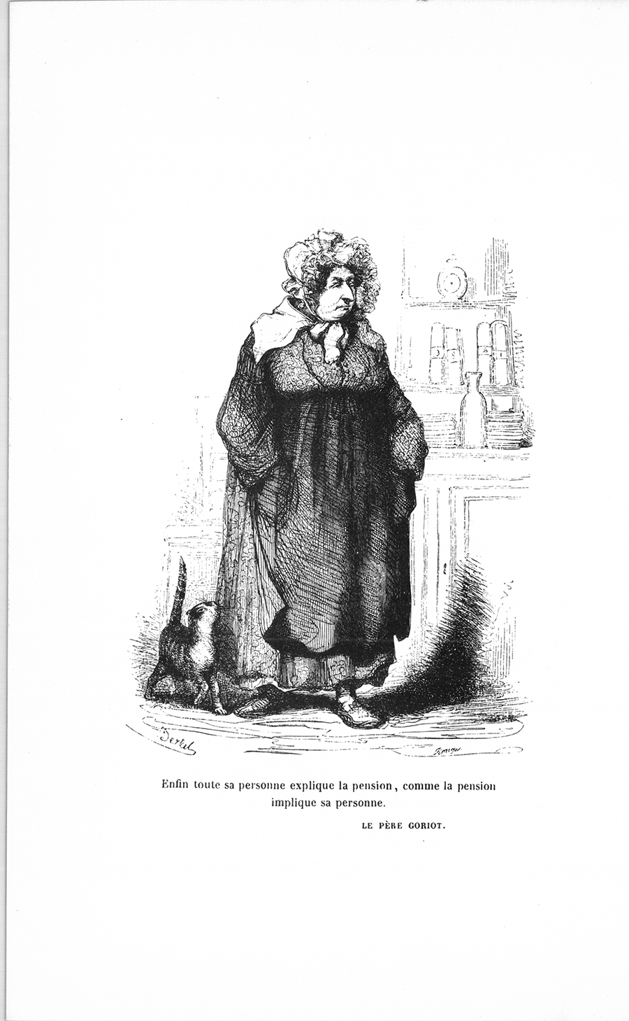 {p. 308} Cette pièce est dans tout son lustre au moment où, vers sept heures du matin, le chat de madame Vauquer précède sa maîtresse ; saute sur les buffets, y flaire le lait que contiennent plusieurs jattes couvertes d’assiettes, et fait entendre son rourou matinal. Bientôt la veuve se montre, attifée de son bonnet de tulle sous lequel pend un tour de faux cheveux mal mis, elle marche en traînassant ses pantoufles grimacées. Sa face vieillotte, grassouillette, du milieu de laquelle sort un nez à bec de perroquet ; ses petites mains potelées, sa personne dodue comme un rat d’église, son corsage trop plein et qui flotte, sont en harmonie avec cette salle où suinte le malheur, où s’est blottie la spéculation, et dont madame Vauquer respire l’air chaudement fétide sans en être écœurée. Sa figure fraîche comme une première gelée d’automne, ses yeux ridés, dont l’expression passe du sourire prescrit aux danseuses à l’amer renfrognement de l’escompteur, enfin toute sa personne explique la pension, comme la pension implique sa personne. [ill.] Le bagne ne va pas sans l’argousin, vous n’imagineriez pas l’un sans l’autre. L’embonpoint blafard de cette petite femme est le produit de cette vie, comme le typhus est la conséquence des exhalaisons d’un hôpital. Son jupon de laine tricotée, qui dépasse sa première jupe faite avec une vieille robe, et dont la ouate s’échappe par les fentes de l’étoffe lézardée, résume le salon, la salle à manger, le jardinet, annonce la cuisine et fait pressentir les pensionnaires. Quand elle est là, ce spectacle est complet. Âgée d’environ cinquante ans, madame Vauquer ressemble à toutes les femmes qui ont eu des malheurs. Elle a l’œil vitreux, l’air innocent d’une entremetteuse qui va se gendarmer pour se faire payer plus cher, mais d’ailleurs prête à tout pour adoucir son sort, à livrer Georges ou Pichegru, si Georges ou Pichegru étaient encore à livrer. Néanmoins, elle est bonne femme au fond, disent les pensionnaires, qui la croient sans fortune en l’entendant geindre et tousser comme eux. Qu’avait été monsieur Vauquer ? Elle ne s’expliquait jamais sur le défunt. Comment avait-il perdu sa fortune ? Dans les malheurs, répondait-elle. Il s’était mal conduit envers elle, ne lui avait laissé que les yeux pour pleurer, cette maison pour vivre, et le droit de ne compatir à aucune infortune, parce que, disait-elle, elle avait souffert tout ce qu’il est possible de souffrir. En entendant trottiner sa maîtresse, la grosse Sylvie, la cuisinière, s’empressait de servir le déjeuner des pensionnaires internes.