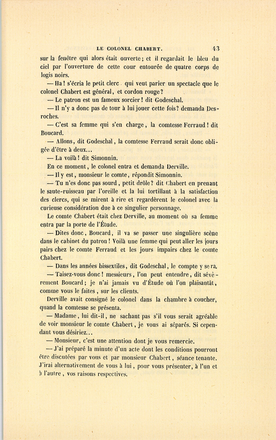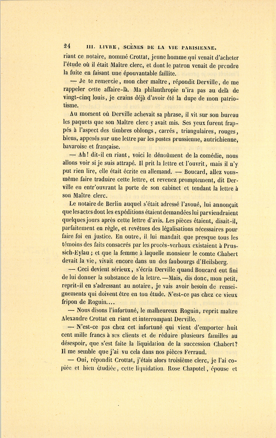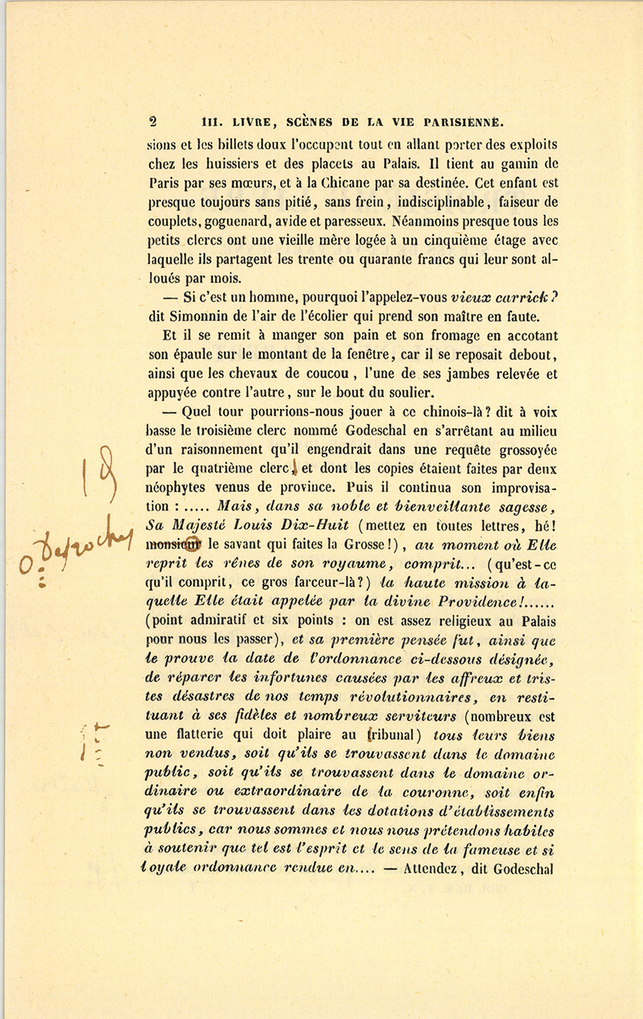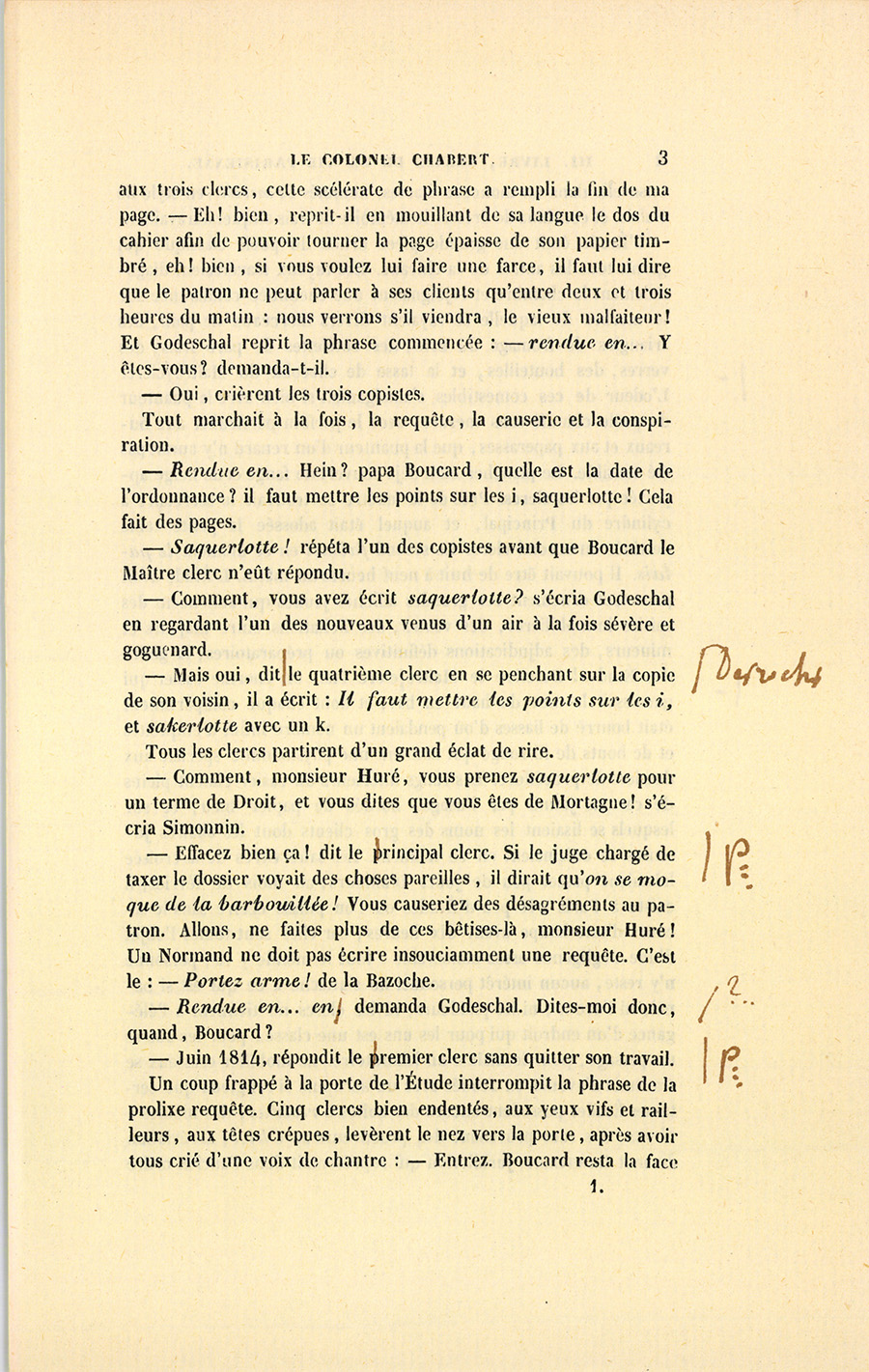 – Quel tour pourrions-nous jouer à ce chinois-là ? dit à voix basse le troisième clerc nommé Godeschal en s’arrêtant au milieu d’un raisonnement qu’il engendrait dans une requête grossoyée par le quatrième clerc et dont les copies étaient faites par deux néophytes venus de province. Puis il continua son improvisation : … Mais, dans sa noble et bienveillante sagesse, Sa Majesté Louis Dix-Huit (mettez en toutes lettres, hé ! Desroches le savant qui faites la Grosse !), au moment où Elle reprit les rênes de son royaume, comprit… (qu’est-ce qu’il comprit, ce gros farceur-là ?) la haute mission à laquelle Elle était appelée par la divine Providence !…… (point admiratif et six points : on est assez religieux au Palais pour nous les passer), et sa première pensée fut, ainsi que le prouve la date de l’ordonnance ci-dessous désignée, de réparer les infortunes causées par les affreux et tristes désastres de nos temps révolutionnaires, en restituant à ses fidèles et nombreux serviteurs (nombreux est une flatterie qui doit plaire au Tribunal) tous leurs biens non vendus, soit qu’ils se trouvassent dans le domaine public, soit qu’ils se trouvassent dans le domaine ordinaire ou extraordinaire de la couronne, soit enfin qu’ils se trouvassent dans les dotations d’établissements publics, car nous sommes et nous nous prétendons habiles à soutenir que tel est l’esprit et le sens de la fameuse et si loyale ordonnance rendue en… – Attendez, dit Godeschal {p. 3} aux trois clercs, cette scélérate de phrase a rempli la fin de ma page. – Eh ! bien, reprit-il en mouillant de sa langue le dos du cahier afin de pouvoir tourner la page épaisse de son papier timbré, eh ! bien, si vous voulez lui faire une farce, il faut lui dire que le patron ne peut parler à ses clients qu’entre deux et trois heures du matin : nous verrons s’il viendra, le vieux malfaiteur ! Et Godeschal reprit la phrase commencée : – rendue en… Y êtes-vous ? demanda-t-il.