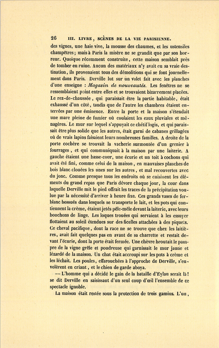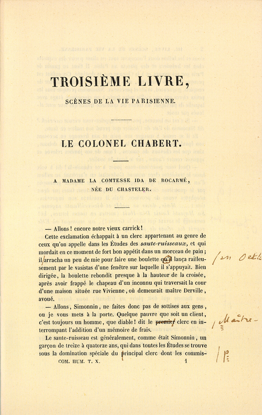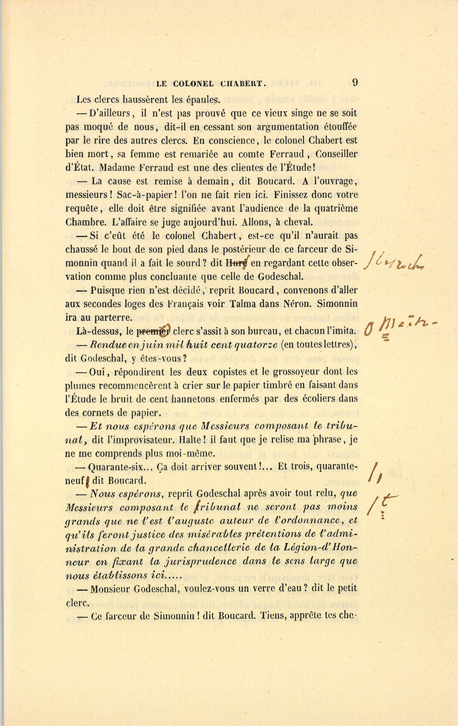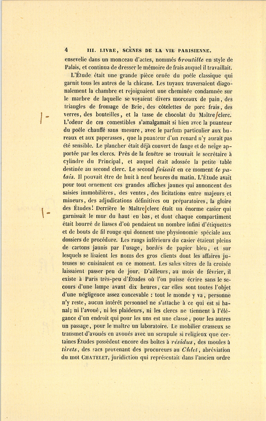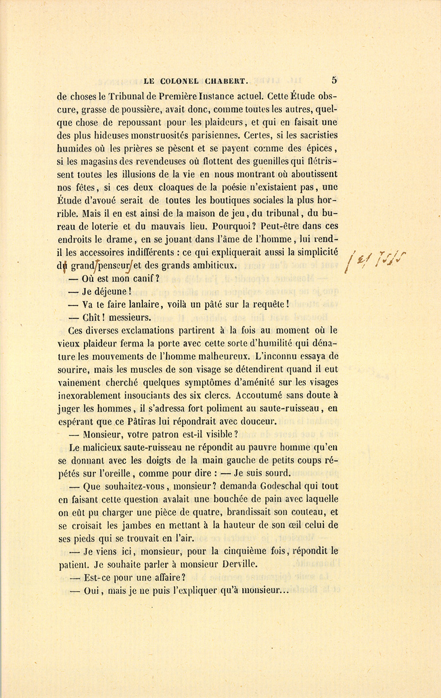 – Quel tour pourrions-nous jouer à ce chinois-là ? dit à voix basse le troisième clerc nommé Godeschal en s’arrêtant au milieu d’un raisonnement qu’il engendrait dans une requête grossoyée par le quatrième clerc et dont les copies étaient faites par deux néophytes venus de province. Puis il continua son improvisation : … Mais, dans sa noble et bienveillante sagesse, Sa Majesté Louis Dix-Huit (mettez en toutes lettres, hé ! Desroches le savant qui faites la Grosse !), au moment où Elle reprit les rênes de son royaume, comprit… (qu’est-ce qu’il comprit, ce gros farceur-là ?) la haute mission à laquelle Elle était appelée par la divine Providence !…… (point admiratif et six points : on est assez religieux au Palais pour nous les passer), et sa première pensée fut, ainsi que le prouve la date de l’ordonnance ci-dessous désignée, de réparer les infortunes causées par les affreux et tristes désastres de nos temps révolutionnaires, en restituant à ses fidèles et nombreux serviteurs (nombreux est une flatterie qui doit plaire au Tribunal) tous leurs biens non vendus, soit qu’ils se trouvassent dans le domaine public, soit qu’ils se trouvassent dans le domaine ordinaire ou extraordinaire de la couronne, soit enfin qu’ils se trouvassent dans les dotations d’établissements publics, car nous sommes et nous nous prétendons habiles à soutenir que tel est l’esprit et le sens de la fameuse et si loyale ordonnance rendue en… – Attendez, dit Godeschal {p. 3} aux trois clercs, cette scélérate de phrase a rempli la fin de ma page. – Eh ! bien, reprit-il en mouillant de sa langue le dos du cahier afin de pouvoir tourner la page épaisse de son papier timbré, eh ! bien, si vous voulez lui faire une farce, il faut lui dire que le patron ne peut parler à ses clients qu’entre deux et trois heures du matin : nous verrons s’il viendra, le vieux malfaiteur ! Et Godeschal reprit la phrase commencée : – rendue en… Y êtes-vous ? demanda-t-il.