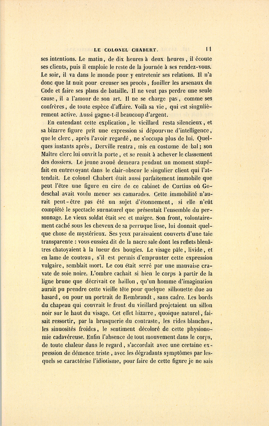 Delbecq était arrivé depuis quelques jours, et, suivant les instructions verbales de la comtesse, l’intendant avait su gagner la confiance du vieux militaire. Le lendemain matin donc, le colonel Chabert partit avec l’ancien avoué pour Saint-Leu-Taverny, où Delbecq avait fait préparer chez le notaire un acte conçu en termes si crus que le colonel sortit brusquement de l’Étude après en avoir entendu la lecture.