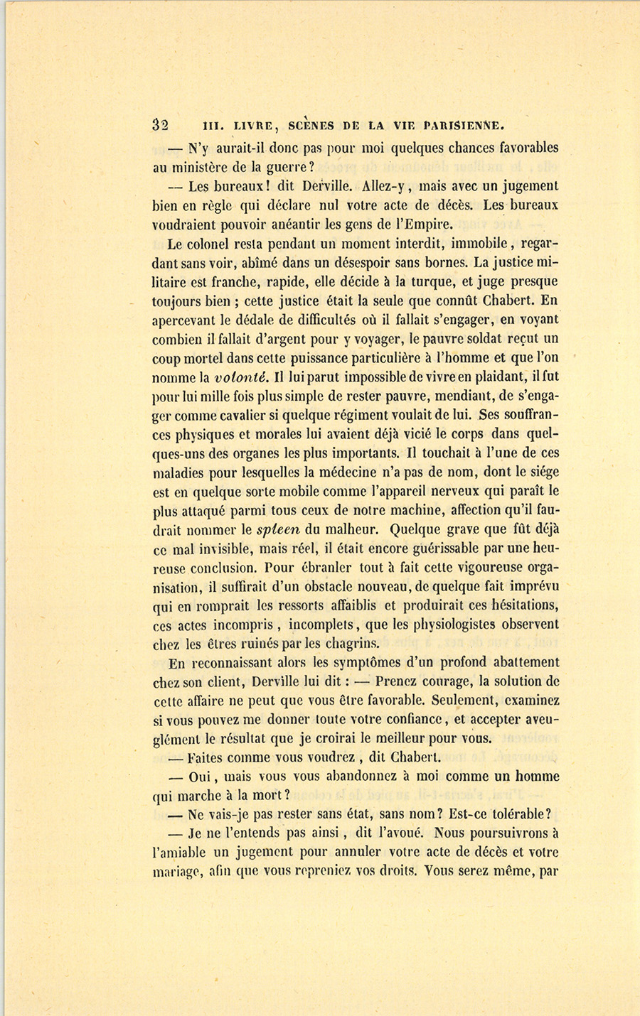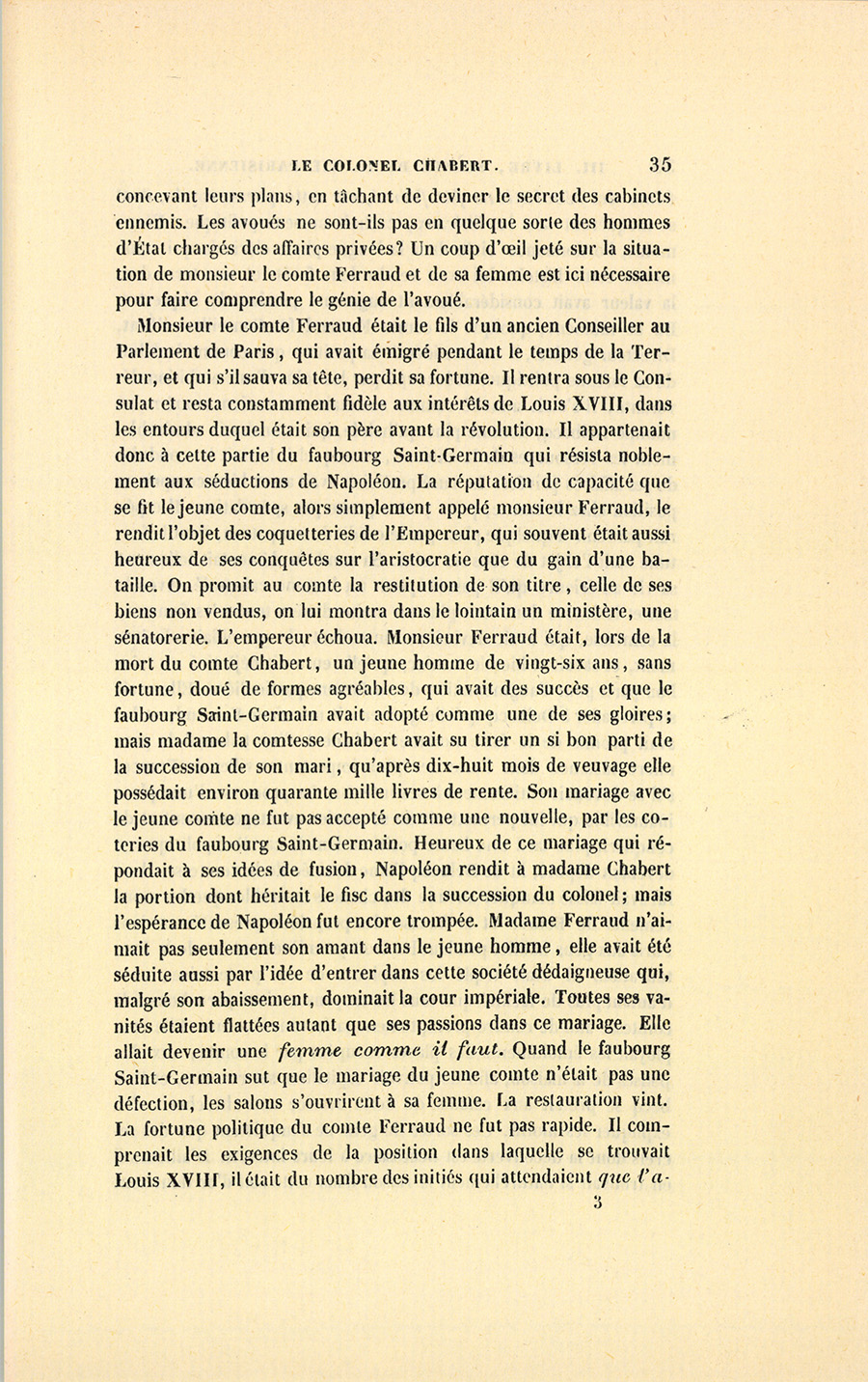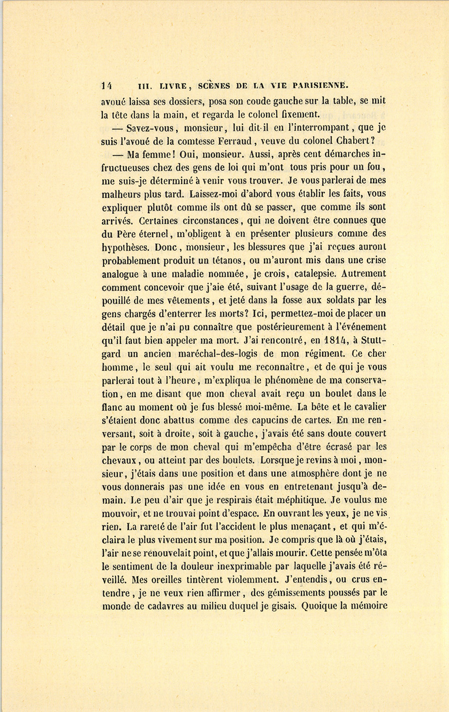 – D’ailleurs, il n’est pas prouvé que ce vieux singe ne se soit pas moqué de nous, dit-il en cessant son argumentation étouffée par le rire des autres clercs. En conscience, le colonel Chabert est bien mort, sa femme est remariée au comte Ferraud, Conseiller d’État. Madame Ferraud est une des clientes de l’Étude !