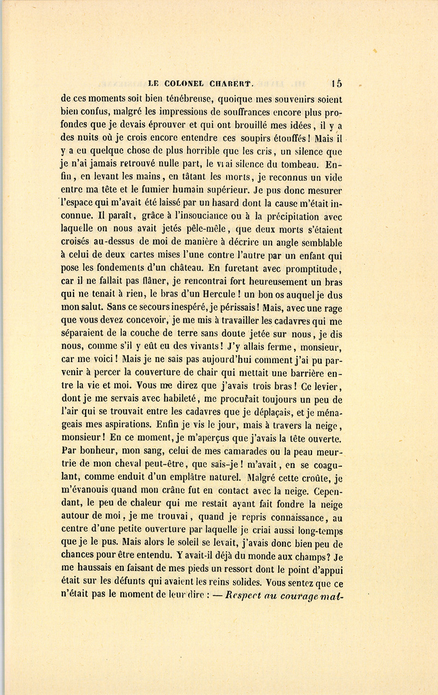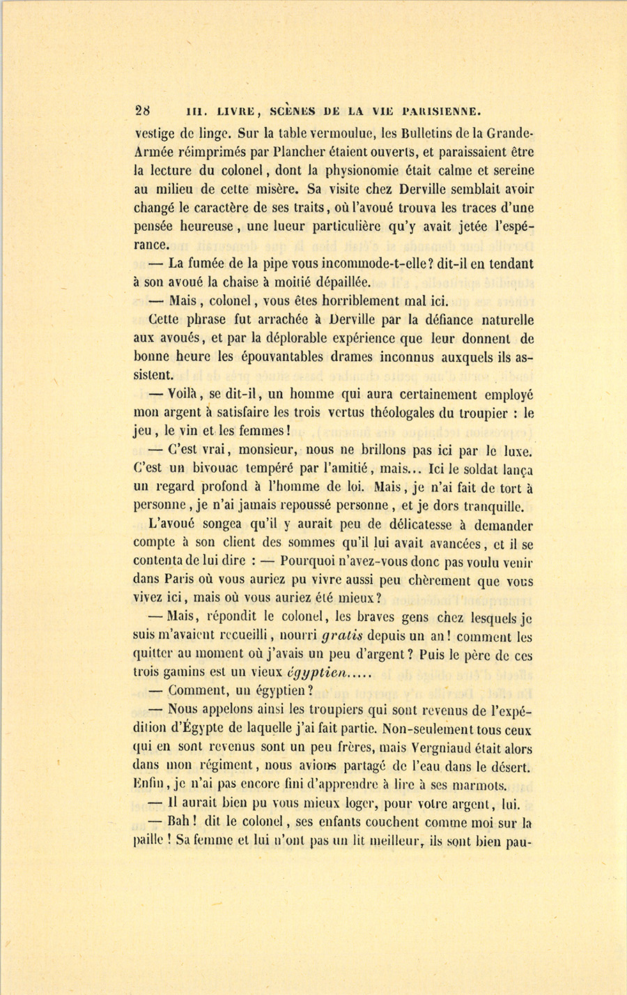 – Ne me parlez pas de cela ! répondit le vieux militaire. Vous ne pouvez pas savoir jusqu’où va mon mépris pour cette vie extérieure à laquelle tiennent la plupart des hommes. J’ai subitement été pris d’une maladie, le dégoût de l’humanité. Quand je pense que Napoléon est à Sainte-Hélène, tout ici-bas m’est indifférent. Je ne puis plus être soldat, voilà tout mon malheur. Enfin, ajouta-t-il en faisant un geste plein d’enfantillage, il vaut mieux avoir du luxe dans ses sentiments que sur ses habits. Je ne crains, moi, le mépris de personne.