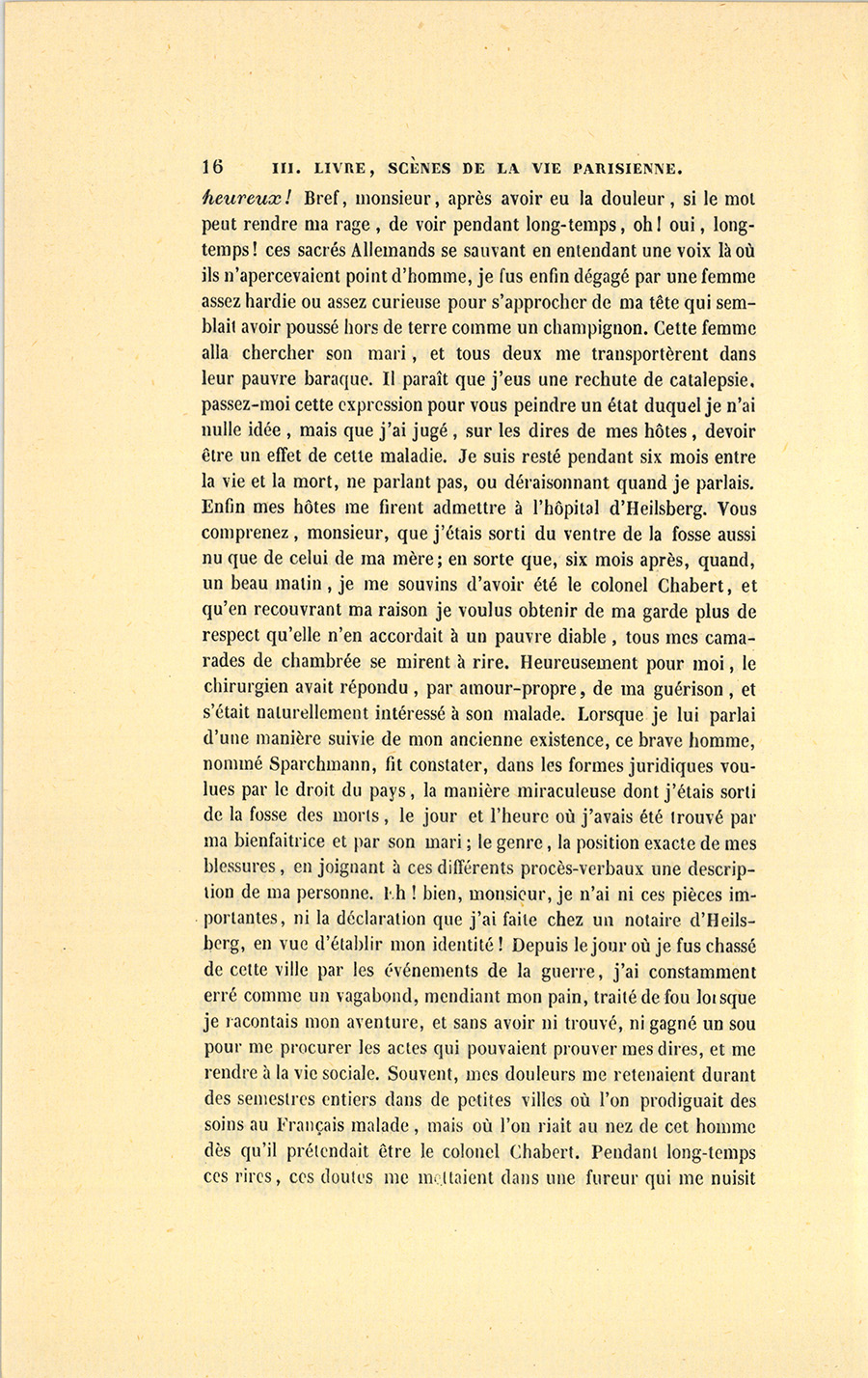 – Pas Chabert ! pas Chabert ! je me nomme Hyacinthe, répondit le vieillard. Je ne suis plus un homme, je suis le numéro 164, septième salle, ajouta-t-il en regardant Derville avec une anxiété peureuse, avec une crainte de vieillard et d’enfant. – Vous allez voir le condamné à mort ? dit-il après un moment de silence. Il n’est pas marié, lui ! Il est bien heureux.