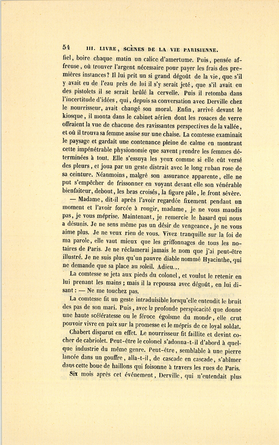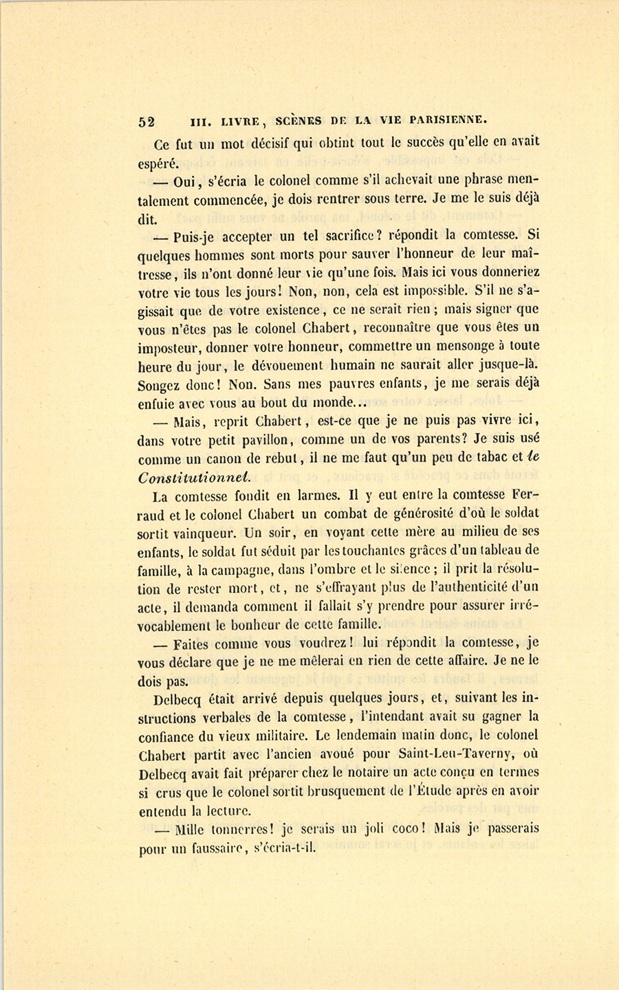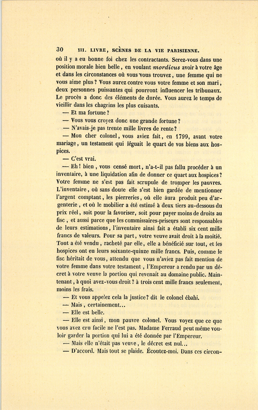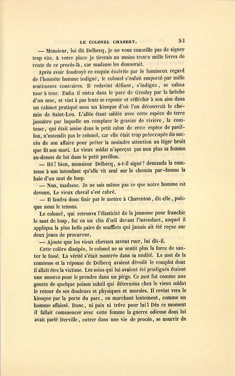{p. 53} – Monsieur, lui dit Delbecq, je ne vous conseille pas de signer trop vite. À votre place je tirerais au moins trente mille livres de rente de ce procès-là, car madame les donnerait.