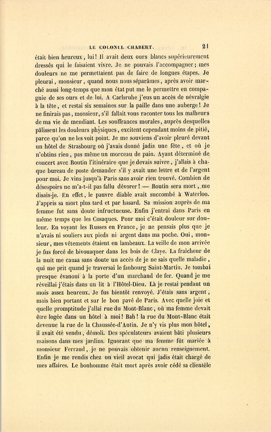 Chabert disparut en effet. Le nourrisseur fit faillite et devint cocher de cabriolet. Peut-être le colonel s’adonna-t-il d’abord à quelque industrie du même genre. Peut-être, semblable à une pierre lancée dans un gouffre, alla-t-il, de cascade en cascade, s’abîmer dans cette boue de haillons qui foisonne à travers les rues de Paris.