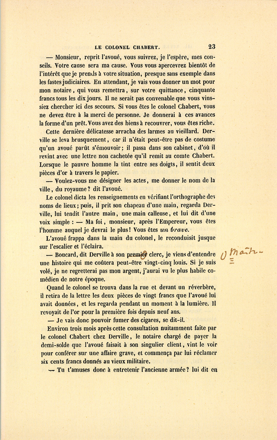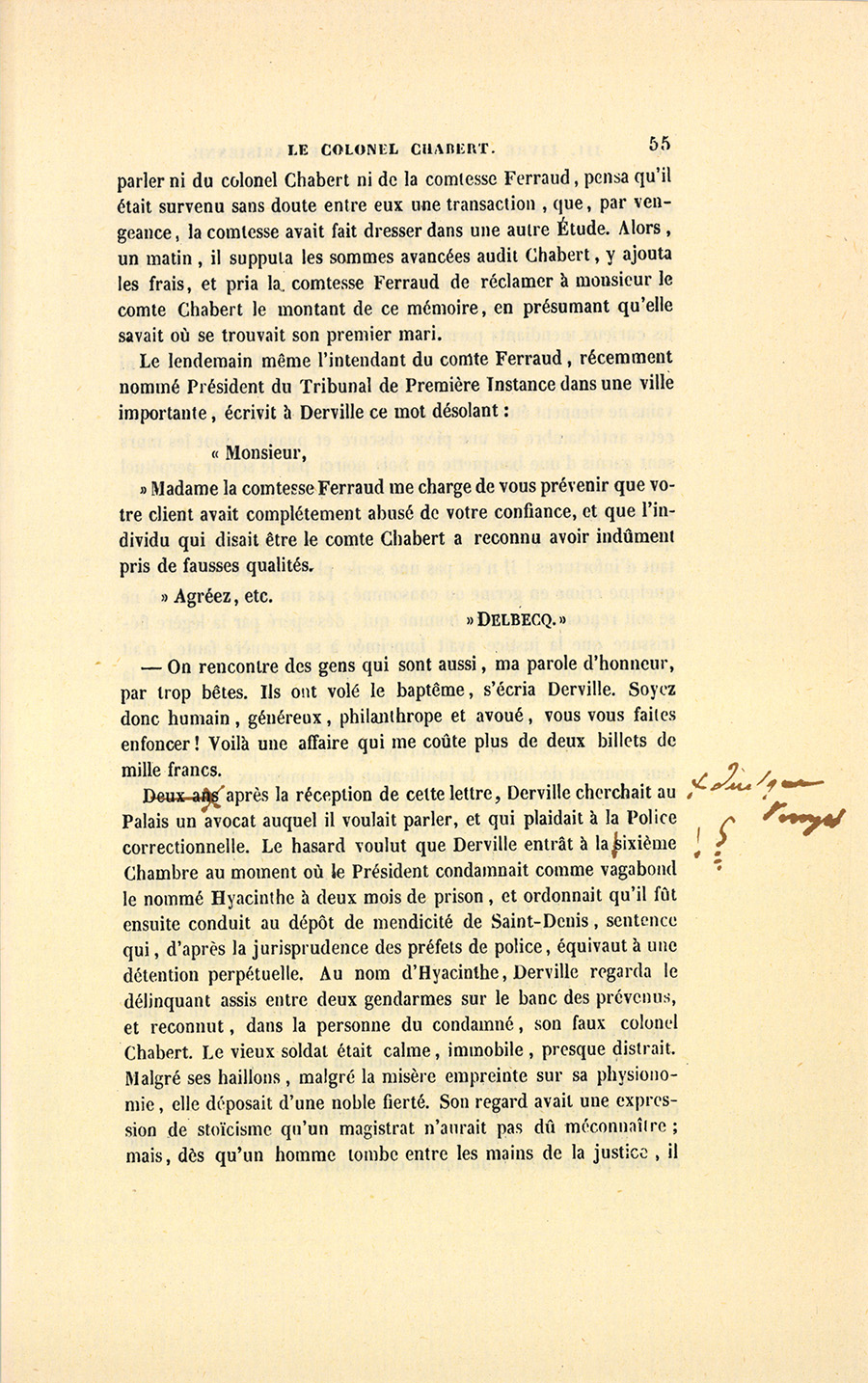 Sur un mot dit par Derville au brigadier, il lui fut permis d’emmener son client dans le Greffe, où Hyacinthe écrivit quelques lignes adressées à la comtesse Ferraud.