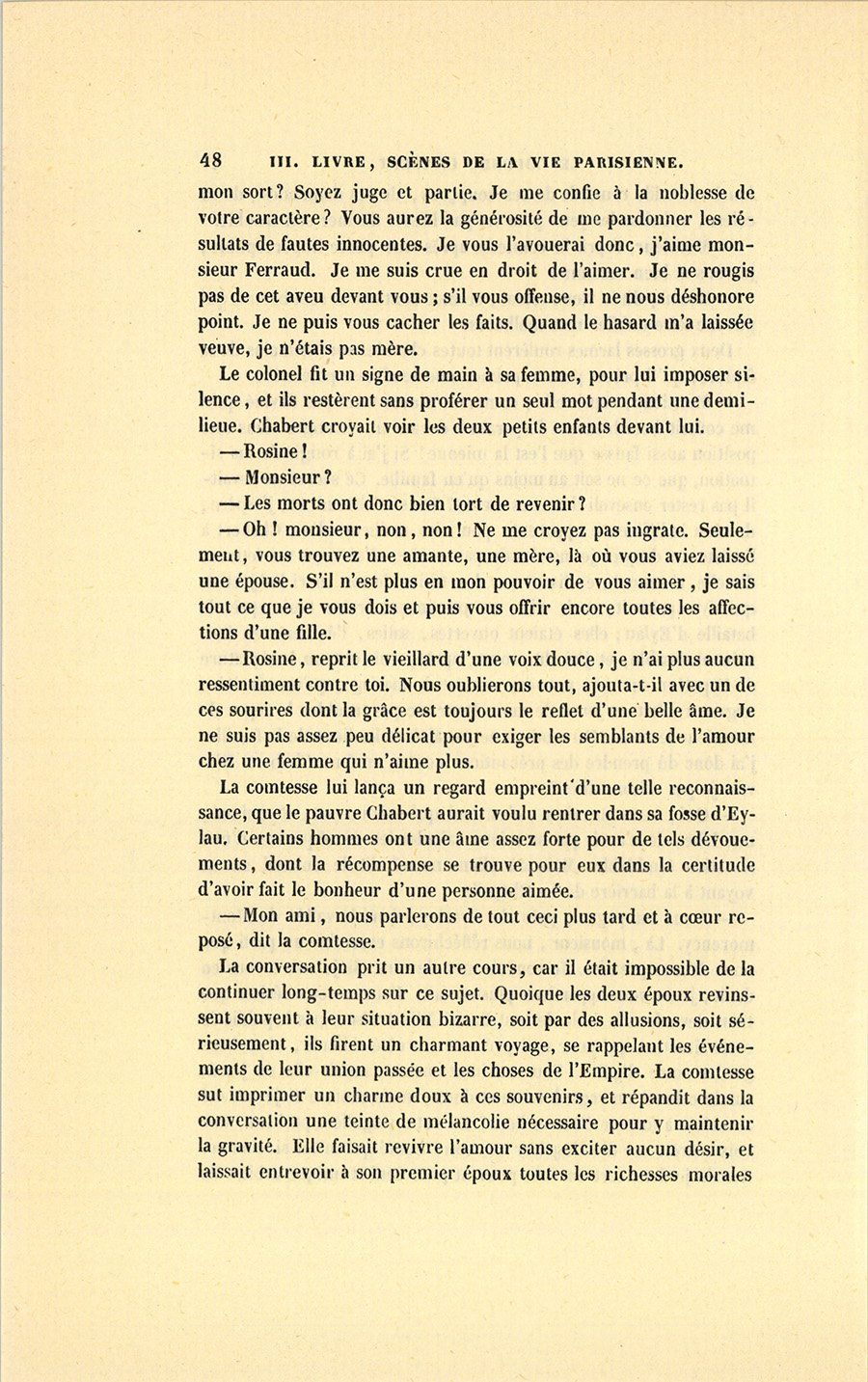 – Monsieur, reprit-elle, comment n’avez-vous pas deviné qu’il me coûtait horriblement de paraître devant un étranger dans une position aussi fausse que l’est la mienne ! Si j’ai à rougir de ma situation, que ce ne soit au moins qu’en famille. Ce secret ne devait-il pas rester enseveli dans nos cœurs ? Vous m’absoudrez, j’espère, de mon indifférence apparente pour les malheurs d’un Chabert à l’existence duquel je ne devais pas croire. J’ai reçu vos lettres, dit-elle vivement, en lisant sur les traits de son mari l’objection qui s’y exprimait, mais elles me parvinrent treize mois après la bataille d’Eylau ; elles étaient ouvertes, salies, l’écriture en était méconnaissable, et j’ai dû croire, après avoir obtenu la signature de Napoléon sur mon nouveau contrat de mariage, qu’un adroit intrigant voulait se jouer de moi. Pour ne pas troubler le repos de monsieur le comte Ferraud, et ne pas altérer les liens de la famille, j’ai donc dû prendre des précautions contre un faux Chabert. N’avais-je pas raison, dites ?