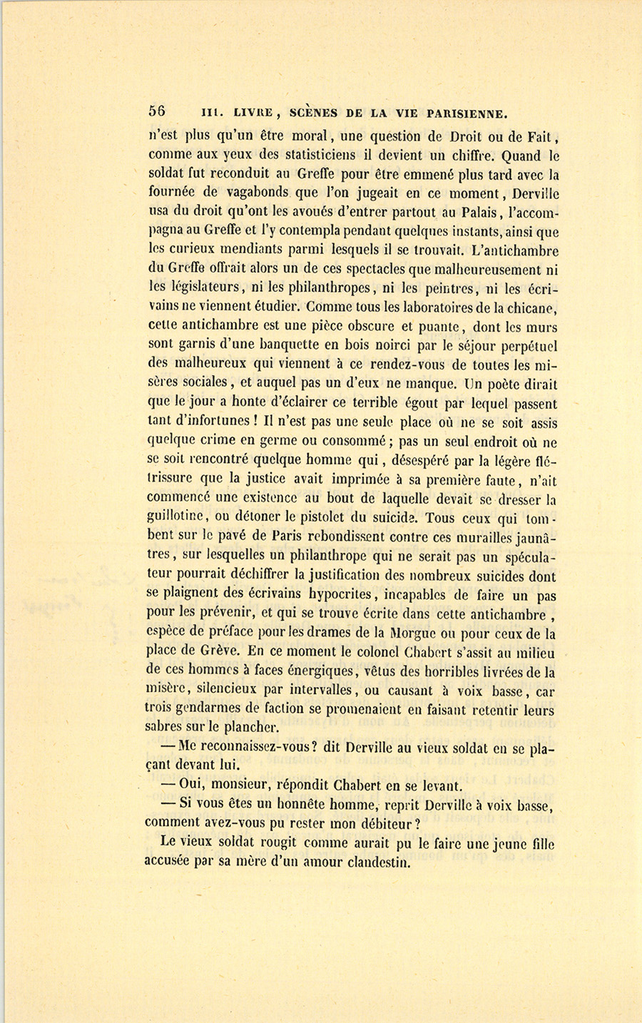 Quelque temps après la réception de cette lettre, Derville cherchait au Palais un avocat auquel il voulait parler, et qui plaidait à la Police correctionnelle. Le hasard voulut que Derville entrât à la Sixième Chambre au moment où le Président condamnait comme vagabond le nommé Hyacinthe à deux mois de prison, et ordonnait qu’il fût ensuite conduit au dépôt de mendicité de Saint-Denis, sentence qui, d’après la jurisprudence des préfets de police, équivaut à une détention perpétuelle. Au nom d’Hyacinthe, Derville regarda le délinquant assis entre deux gendarmes sur le banc des prévenus, et reconnut, dans la personne du condamné, son faux colonel Chabert. Le vieux soldat était calme, immobile, presque distrait. Malgré ses haillons, malgré la misère empreinte sur sa physionomie, elle déposait d’une noble fierté. Son regard avait une expression de stoïcisme qu’un magistrat n’aurait pas dû méconnaître ; mais, dès qu’un homme tombe entre les mains de la justice, il {p. 56} n’est plus qu’un être moral, une question de Droit ou de Fait, comme aux yeux des statisticiens il devient un chiffre. Quand le soldat fut reconduit au Greffe pour être emmené plus tard avec la fournée de vagabonds que l’on jugeait en ce moment, Derville usa du droit qu’ont les avoués d’entrer partout au Palais, l’accompagna au Greffe et l’y contempla pendant quelques instants, ainsi que les curieux mendiants parmi lesquels il se trouvait. L’antichambre du Greffe offrait alors un de ces spectacles que malheureusement ni les législateurs, ni les philanthropes, ni les peintres, ni les écrivains ne viennent étudier. Comme tous les laboratoires de la chicane, cette antichambre est une pièce obscure et puante, dont les murs sont garnis d’une banquette en bois noirci par le séjour perpétuel des malheureux qui viennent à ce rendez-vous de toutes les misères sociales, et auquel pas un d’eux ne manque. Un poète dirait que le jour a honte d’éclairer ce terrible égout par lequel passent tant d’infortunes ! Il n’est pas une seule place où ne se soit assis quelque crime en germe ou consommé ; pas un seul endroit où ne se soit rencontré quelque homme qui, désespéré par la légère flétrissure que la justice avait imprimée à sa première faute, n’ait commencé une existence au bout de laquelle devait se dresser la guillotine, ou détoner le pistolet du suicide. Tous ceux qui tombent sur le pavé de Paris rebondissent contre ces murailles jaunâtres, sur lesquelles un philanthrope qui ne serait pas un spéculateur pourrait déchiffrer la justification des nombreux suicides dont se plaignent des écrivains hypocrites, incapables de faire un pas pour les prévenir, et qui se trouve écrite dans cette antichambre, espèce de préface pour les drames de la Morgue ou pour ceux de la place de Grève. En ce moment le colonel Chabert s’assit au milieu de ces hommes à faces énergiques, vêtus des horribles livrées de la misère, silencieux par intervalles, ou causant à voix basse, car trois gendarmes de faction se promenaient en faisant retentir leurs sabres sur le plancher.