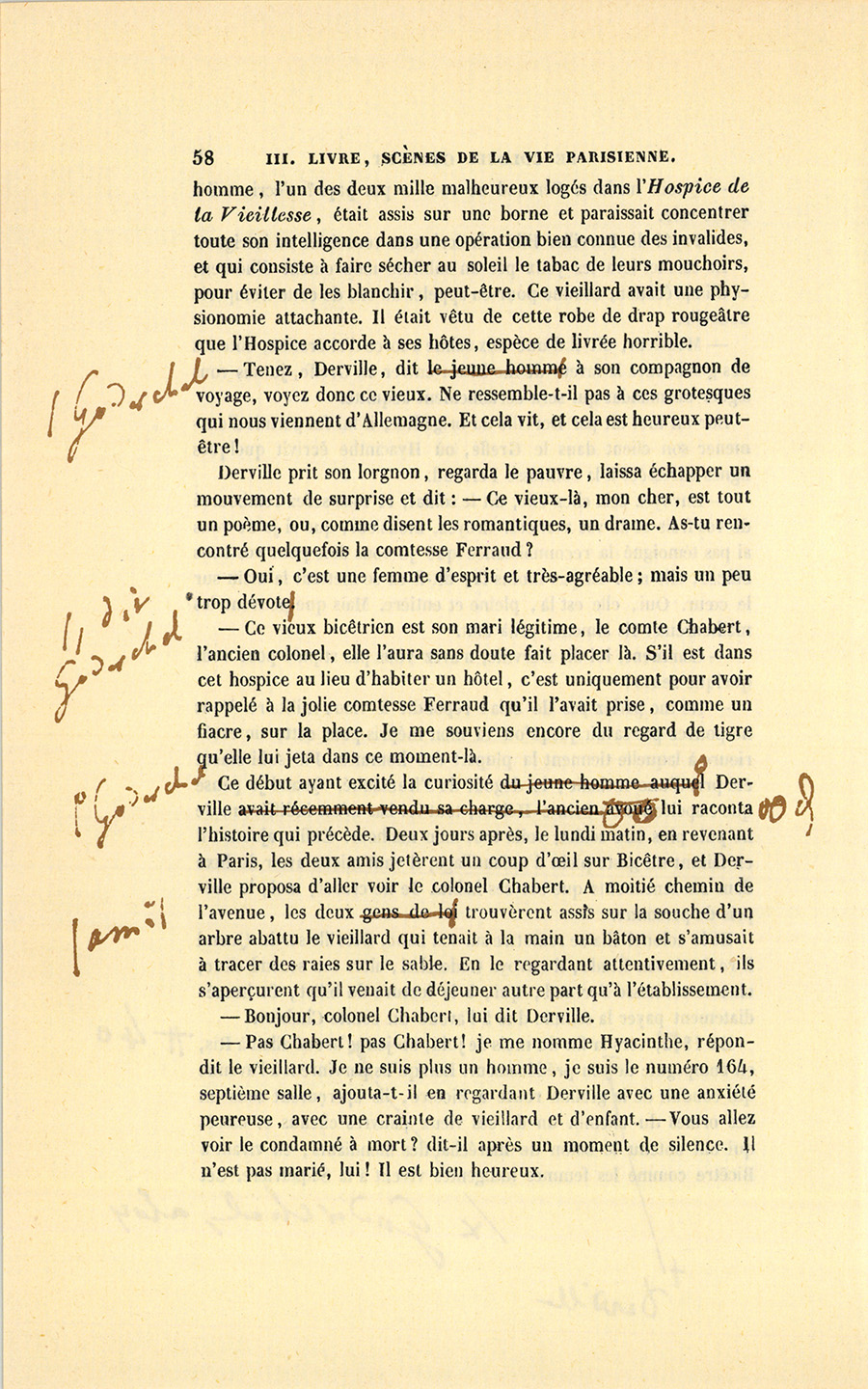En 1840, vers la fin du mois de juin, Godeschal, alors avoué5, allait à Ris, en compagnie de Derville son prédécesseur. Lorsqu’ils parvinrent à l’avenue qui conduit de la grande route à Bicêtre, ils aperçurent sous un des ormes du chemin un de ces vieux pauvres chenus et cassés qui ont obtenu le bâton de maréchal des mendiants, en vivant à Bicêtre comme les femmes indigentes vivent à la Salpêtrière. Cet {p. 58} homme, l’un des deux mille malheureux logés dans l’Hospice de la Vieillesse, était assis sur une borne et paraissait concentrer toute son intelligence dans une opération bien connue des invalides, et qui consiste à faire sécher au soleil le tabac de leurs mouchoirs, pour éviter de les blanchir, peut-être. Ce vieillard avait une physionomie attachante. Il était vêtu de cette robe de drap rougeâtre que l’Hospice accorde à ses hôtes, espèce de livrée horrible.