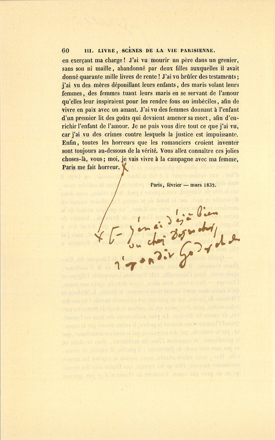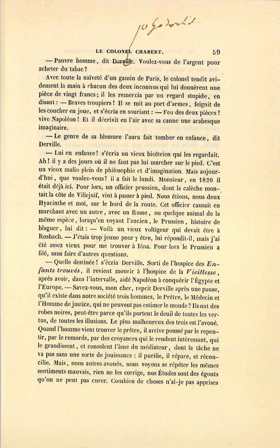– Quelle destinée ! s’écria Derville. Sorti de l’hospice des Enfants trouvés, il revient mourir à l’hospice de la Vieillesse, après avoir, dans l’intervalle, aidé Napoléon à conquérir l’Égypte et l’Europe. – Savez-vous, mon cher, reprit Derville après une pause, qu’il existe dans notre société trois hommes, le Prêtre, le Médecin et l’Homme de justice, qui ne peuvent pas estimer le monde ? Ils ont des robes noires, peut-être parce qu’ils portent le deuil de toutes les vertus, de toutes les illusions. Le plus malheureux des trois est l’avoué. Quand l’homme vient trouver le prêtre, il arrive poussé par le repentir, par le remords, par des croyances qui le rendent intéressant, qui le grandissent, et consolent l’âme du médiateur, dont la tâche ne va pas sans une sorte de jouissance : il purifie, il répare, et réconcilie. Mais, nous autres avoués, nous voyons se répéter les mêmes sentiments mauvais, rien ne les corrige, nos Études sont des égouts qu’on ne peut pas curer. Combien de choses n’ai-je pas apprises {p. 60} en exerçant ma charge ! J’ai vu mourir un père dans un grenier, sans sou ni maille, abandonné par deux filles auxquelles il avait donné quarante mille livres de rente ! J’ai vu brûler des testaments ; j’ai vu des mères dépouillant leurs enfants, des maris volant leurs femmes, des femmes tuant leurs maris en se servant de l’amour qu’elles leur inspiraient pour les rendre fous ou imbéciles, afin de vivre en paix avec un amant. J’ai vu des femmes donnant à l’enfant d’un premier lit des goûts qui devaient amener sa mort, afin d’enrichir l’enfant de l’amour. Je ne puis vous dire tout ce que j’ai vu, car j’ai vu des crimes contre lesquels la justice est impuissante. Enfin, toutes les horreurs que les romanciers croient inventer sont toujours au-dessous de la vérité. Vous allez connaître ces jolies choses-là, vous ; moi, je vais vivre à la campagne avec ma femme, Paris me fait horreur.