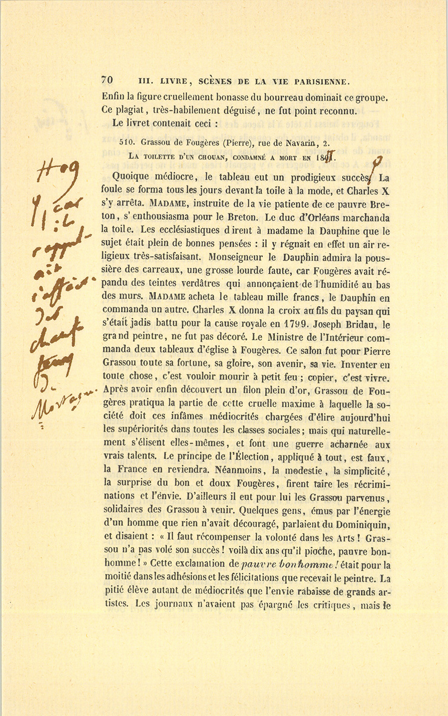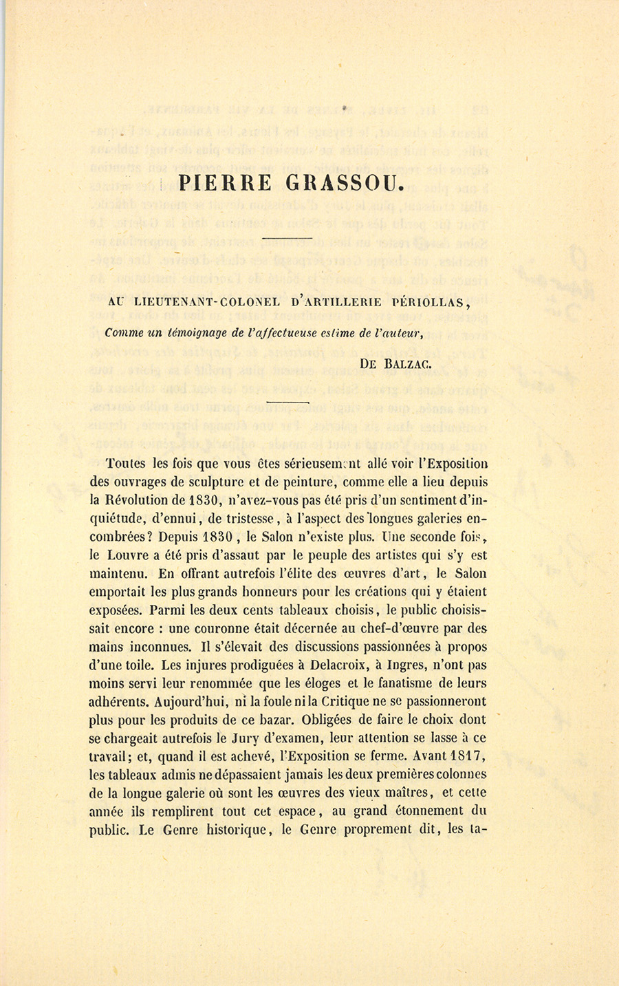 Depuis que le livret est devenu un gros livre, il s’y produit bien des noms qui restent dans leur obscurité, malgré la liste de dix ou douze tableaux qui les accompagne. Parmi ces noms, le plus inconnu peut-être est celui d’un artiste nommé Pierre Grassou, venu de Fougères, appelé plus simplement Fougères dans le monde artiste, qui tient aujourd’hui beaucoup de place au soleil, et qui suggère les amères réflexions par lesquelles commence l’esquisse de sa vie, applicable à quelques autres individus de la Tribu des Artistes.
