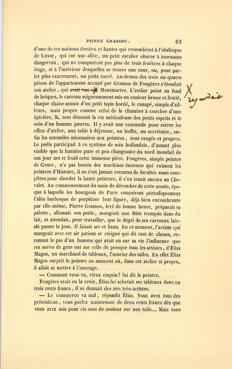 En 1832, Fougères demeurait rue de Navarin, au quatrième étage {p. 63} d’une de ces maisons étroites et hautes qui ressemblent à l’obélisque de Luxor, qui ont une allée, un petit escalier obscur à tournants dangereux, qui ne comportent pas plus de trois fenêtres à chaque étage, et à l’intérieur desquelles se trouve une cour, ou, pour parler plus exactement, un puits carré. Au-dessus des trois ou quatre pièces de l’appartement occupé par Grassou de Fougères s’étendait son atelier, qui regardait Montmartre. L’atelier peint en fond de briques, le carreau soigneusement mis en couleur brune et frotté, chaque chaise munie d’un petit tapis bordé, le canapé, simple d’ailleurs, mais propre comme celui de la chambre à coucher d’une épicière, là, tout dénotait la vie méticuleuse des petits esprits et le soin d’un homme pauvre. Il y avait une commode pour serrer les effets d’atelier, une table à déjeuner, un buffet, un secrétaire, enfin les ustensiles nécessaires aux peintres, tous rangés et propres. Le poêle participait à ce système de soin hollandais, d’autant plus visible que la lumière pure et peu changeante du nord inondait de son jour net et froid cette immense pièce. Fougères, simple peintre de Genre, n’a pas besoin des machines énormes qui ruinent les peintres d’Histoire, il ne s’est jamais reconnu de facultés assez complètes pour aborder la haute peinture, il s’en tenait encore au Chevalet. Au commencement du mois de décembre de cette année, époque à laquelle les bourgeois de Paris conçoivent périodiquement l’idée burlesque de perpétuer leur figure, déjà bien encombrante par elle-même, Pierre Grassou, levé de bonne heure, préparait sa palette, allumait son poêle, mangeait une flûte trempée dans du lait, et attendait, pour travailler, que le dégel de ses carreaux laissât passer le jour. Il faisait sec et beau. En ce moment, l’artiste qui mangeait avec cet air patient et résigné qui dit tant de choses, reconnut le pas d’un homme qui avait eu sur sa vie l’influence que ces sortes de gens ont sur celle de presque tous les artistes, d’Élias Magus, un marchand de tableaux, l’usurier des toiles. En effet Élias Magus surprit le peintre au moment où, dans cet atelier si propre, il allait se mettre à l’ouvrage.