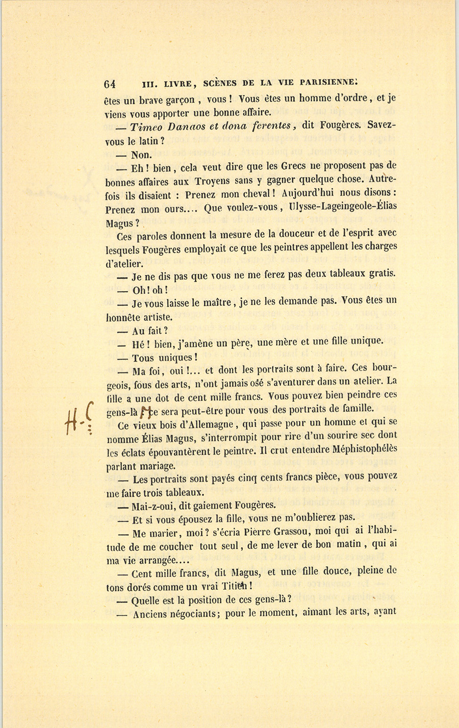 – Le commerce va mal, répondit Élias. Vous avez tous des prétentions, vous parlez maintenant de deux cents francs dès que vous avez mis pour six sous de couleur sur une toile… Mais vous {p. 64} êtes un brave garçon, vous ! Vous êtes un homme d’ordre, et je viens vous apporter une bonne affaire.