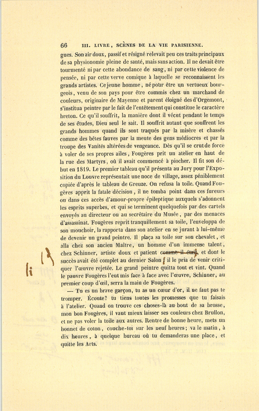 Élève, Fougères avait étudié le dessin chez Servin, qui passait dans le monde académique pour un grand dessinateur. Après, il était allé chez Schinner y surprendre les secrets de cette puissante et magnifique couleur qui distingue ce maître. Le maître, les élèves, tout y avait été discret, Pierre n’y avait rien surpris. De là, Fougères avait passé dans l’atelier de Sommervieux pour se familiariser avec cette partie de l’art nommée la Composition, mais la Composition fut sauvage et farouche pour lui. Puis il avait essayé d’arracher à Granet, à Drolling le mystère de leurs effets d’Intérieurs. Ces deux maîtres ne s’étaient rien laissé dérober. Enfin, Fougères avait terminé son éducation chez Duval-Lecamus. Durant ces études et ces différentes transformations, Fougères eut des mœurs tranquilles et rangées qui fournissaient matière aux railleries des différents ateliers où il séjournait, mais partout il désarma ses camarades par sa modestie, par une patience et une douceur d’agneau. Les Maîtres n’eurent aucune sympathie pour ce brave garçon, les Maîtres aiment les sujets brillants, les esprits excentriques, drolatiques, fougueux, ou sombres et profondément réfléchis qui dénotent un talent futur. Tout en Fougères annonçait la médiocrité. Son surnom de Fougères, celui du peintre dans la pièce de l’Églantine, fut la source de mille avanies ; mais, par la force des choses, il accepta le nom de la ville où il avait vu le jour.