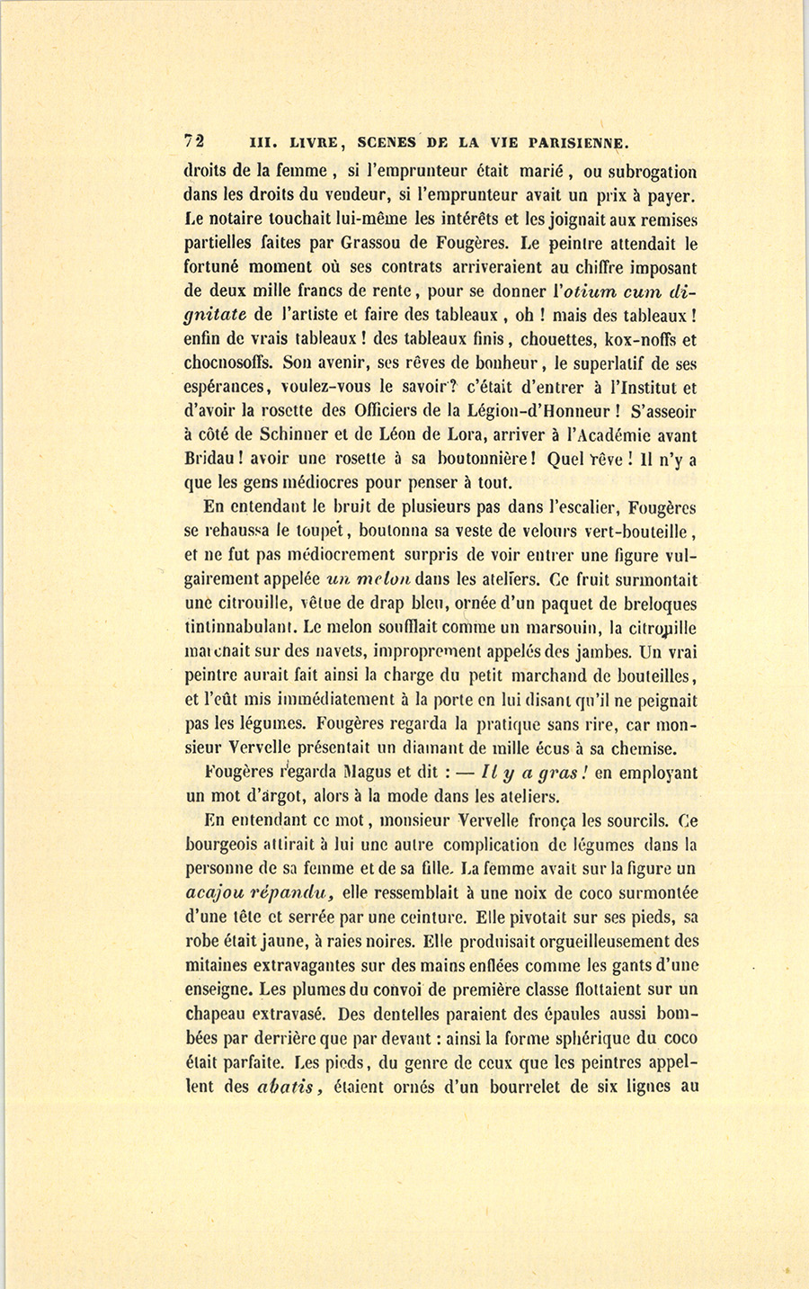 En entendant le bruit de plusieurs pas dans l’escalier, Fougères se rehaussa le toupet, boutonna sa veste de velours vert-bouteille, et ne fut pas médiocrement surpris de voir entrer une figure vulgairement appelée un melon dans les ateliers. [ill.] Ce fruit surmontait une citrouille, vêtue de drap bleu, ornée d’un paquet de breloques tintinnabulant. Le melon soufflait comme un marsouin, la citrouille marchait sur des navets, improprement appelés des jambes. Un vrai peintre aurait fait ainsi la charge du petit marchand de bouteilles, et l’eût mis immédiatement à la porte en lui disant qu’il ne peignait pas les légumes. Fougères regarda la pratique sans rire, car monsieur Vervelle présentait un diamant de mille écus à sa chemise.