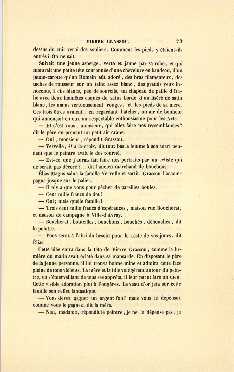 Le vieil Élias descendit pour aller chercher la famille Vervelle. Pour savoir à quel point la proposition allait agir sur le peintre, et quel effet devaient produire sur lui les sieur et dame Vervelle ornés de leur fille unique, il est nécessaire de jeter un coup d’œil sur la vie antérieure de Pierre Grassou de Fougères.