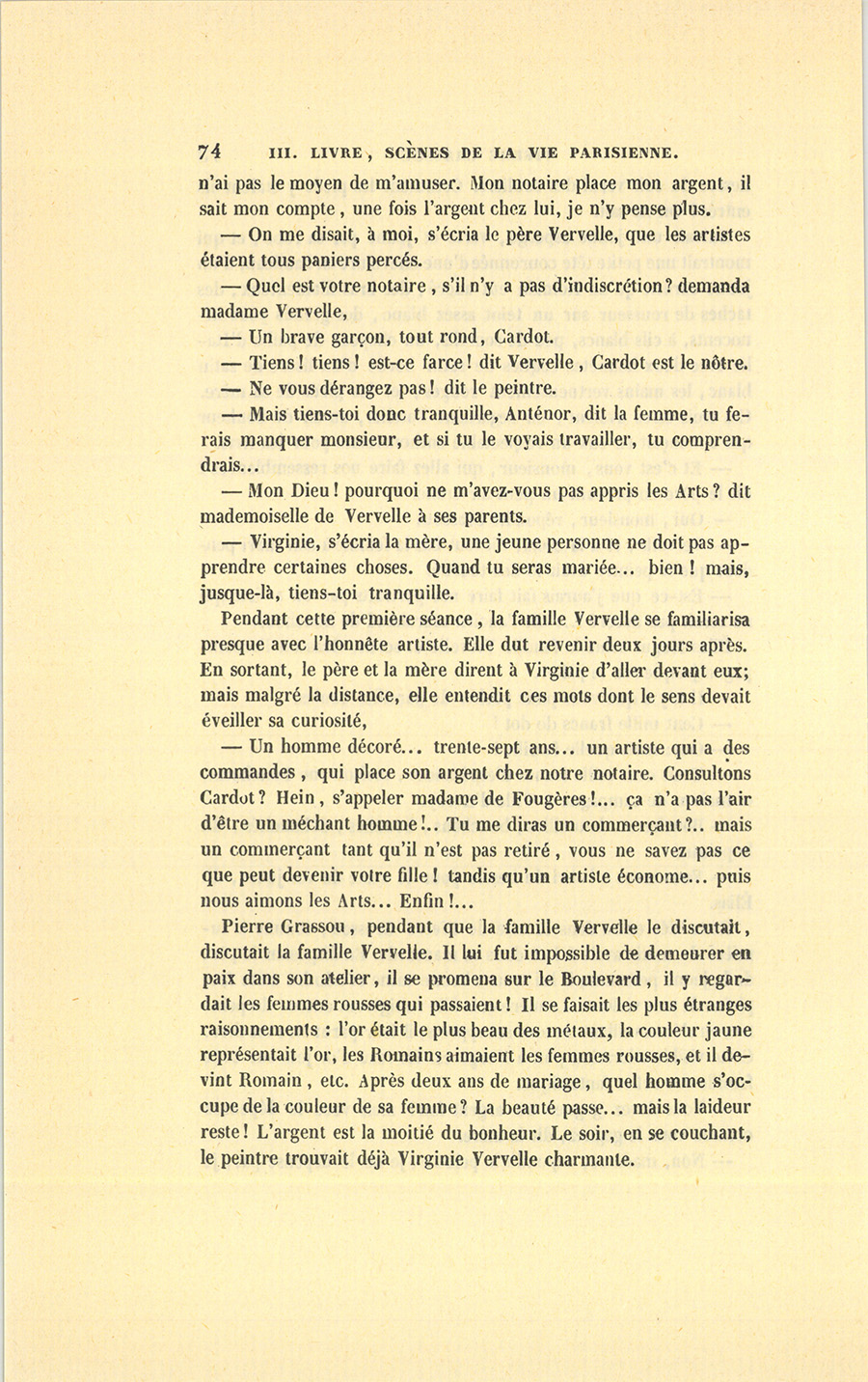 – Non, madame, répondit le peintre, je ne le dépense pas, je {p. 74} n’ai pas le moyen de m’amuser. Mon notaire place mon argent, il sait mon compte, une fois l’argent chez lui, je n’y pense plus.