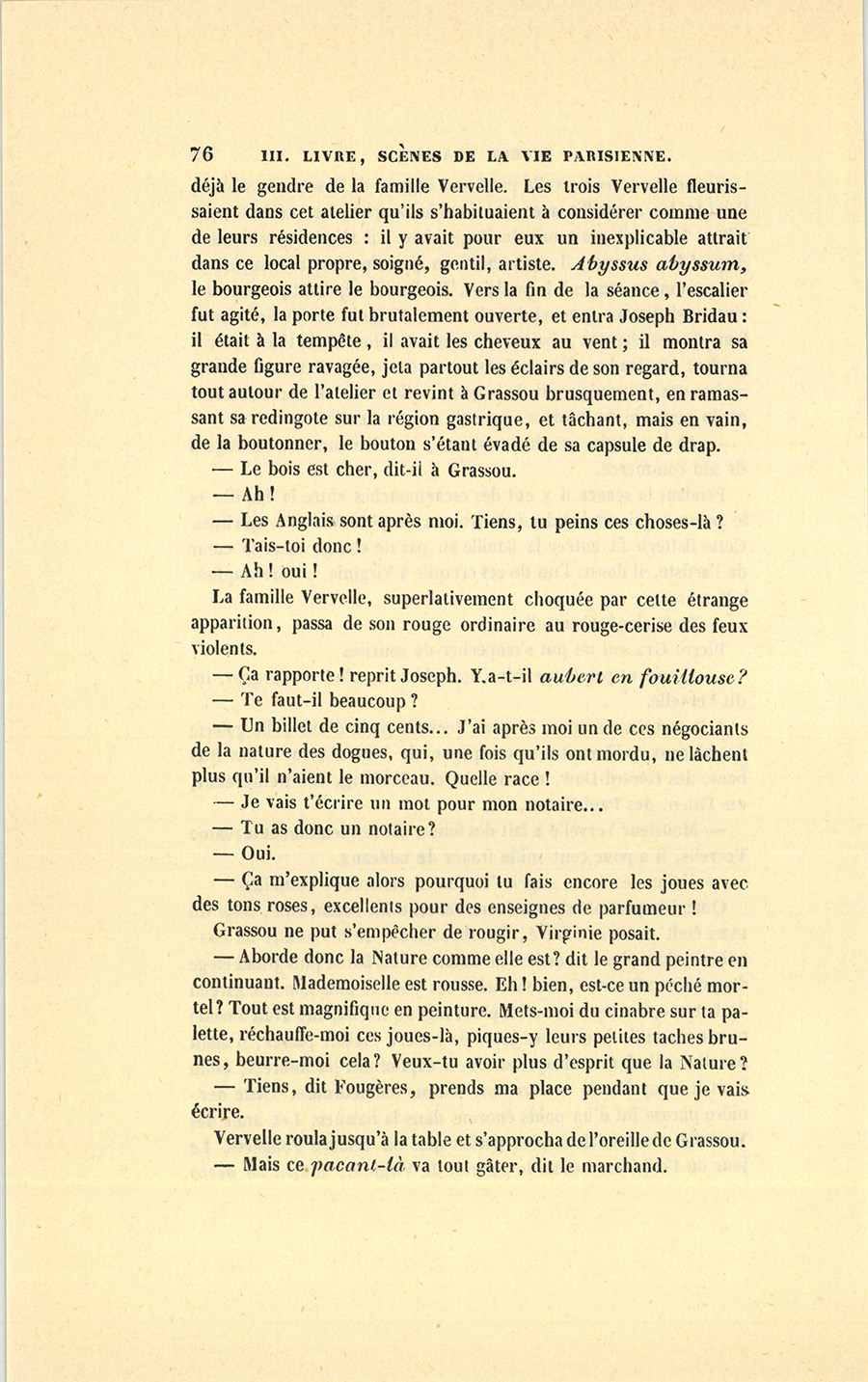 Quand le portrait de madame Vervelle fut commencé, celui du mari était presque achevé, l’enthousiasme de la famille ne connaissait alors plus de bornes. Le notaire avait fait le plus grand éloge du peintre : Pierre Grassou était à ses yeux le plus honnête garçon de la terre, un des artistes les plus rangés qui d’ailleurs avait amassé trente-six mille francs ; ses jours de misère étaient passés, il allait par dix mille francs chaque année, il capitalisait les intérêts ; enfin il était incapable de rendre une femme malheureuse. Cette dernière phrase fut d’un poids énorme dans la balance. Les amis des Vervelle n’entendaient plus parler que du célèbre Fougères. Le jour où Fougères entama le portrait de Virginie, il était in petto {p. 76} déjà le gendre de la famille Vervelle. Les trois Vervelle fleurissaient dans cet atelier qu’ils s’habituaient à considérer comme une de leurs résidences : il y avait pour eux un inexplicable attrait dans ce local propre, soigné, gentil, artiste. Abyssus abyssum, le bourgeois attire le bourgeois. Vers la fin de la séance, l’escalier fut agité, la porte fut brutalement ouverte, et entra Joseph Bridau : il était à la tempête, il avait les cheveux au vent ; il montra sa grande figure ravagée, jeta partout les éclairs de son regard, tourna tout autour de l’atelier et revint à Grassou brusquement, en ramassant sa redingote sur la région gastrique, et tâchant, mais en vain, de la boutonner, le bouton s’étant évadé de sa capsule de drap.