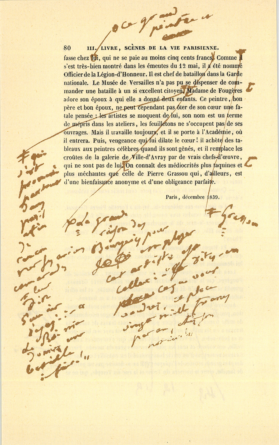 Aujourd’hui, Pierre Grassou, qui ne manque pas une seule Exposition, passe dans le monde bourgeois pour un bon peintre de portraits. Il gagne une douzaine de mille francs par an, et gâte pour cinq cents francs de toiles. Sa femme a eu six mille francs de rentes en dot, il vit avec son beau-père3 et sa belle-mère. Les Vervelle et les Grassou, qui s’entendent à merveille, ont voiture et sont les plus heureuses gens du monde. Pierre Grassou ne sort pas d’un cercle bourgeois où il est considéré comme un des plus grands artistes de l’époque. Il ne se dessine pas un portrait de famille, entre la barrière du Trône et la rue du Temple, qui ne se {p. 80} fasse chez ce grand peintre et qui ne se paie au moins cinq cents francs. La grande raison des bourgeois pour employer cet artiste est celle-ci : – « Dites-en ce que vous voudrez, il place vingt mille francs par an, chez son notaire ! » Comme Grassou s’est très-bien montré dans les émeutes du 12 mai, il a été nommé Officier de la Légion-d’Honneur. Il est chef de bataillon dans la Garde nationale. Le Musée de Versailles n’a pas pu se dispenser de commander une bataille à un si excellent citoyen qui s’est promené partout dans Paris afin de rencontrer ses anciens camarades et leur dire d’un air dégagé : – « Le roi m’a donné une bataille à faire ! »