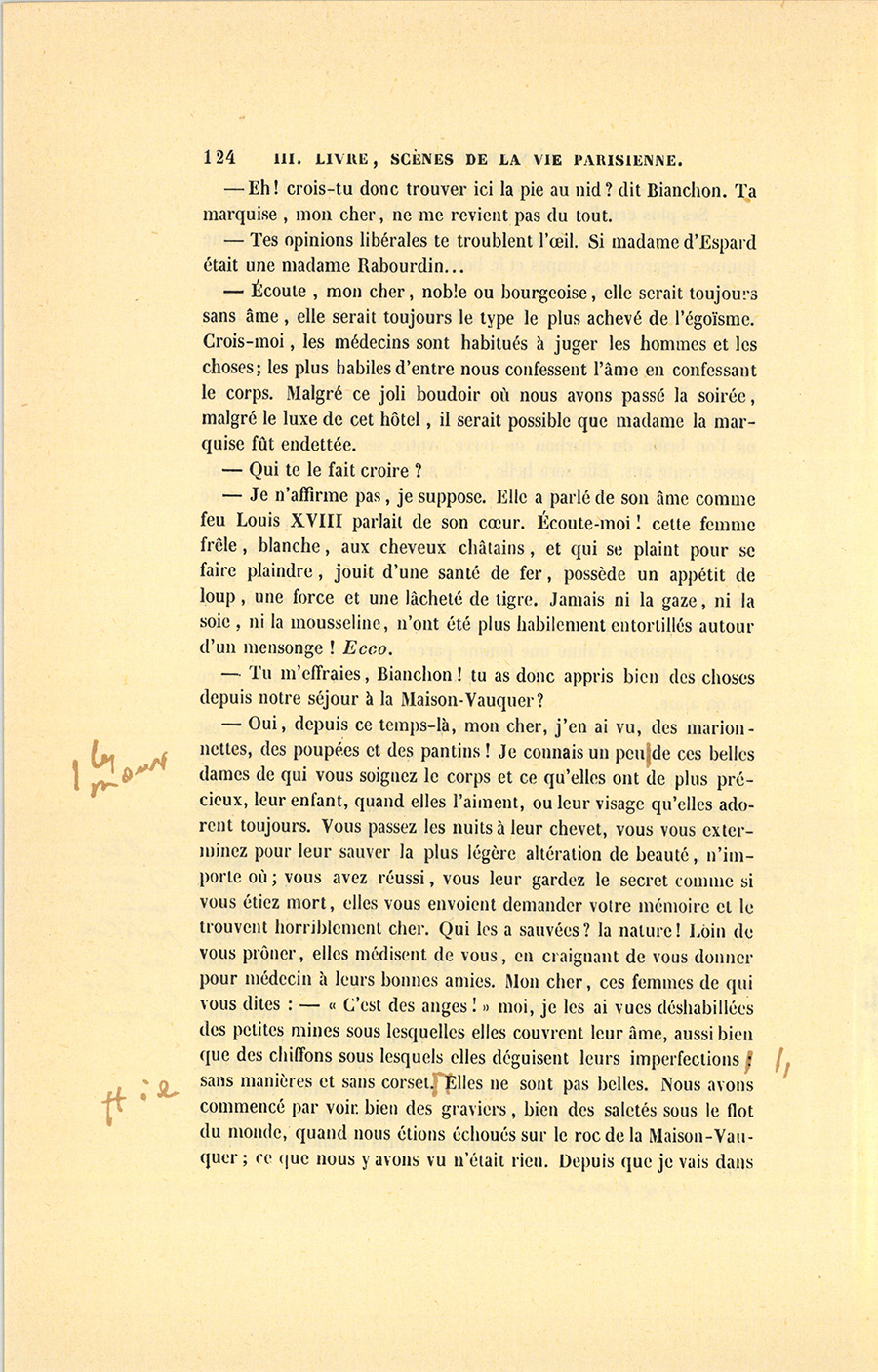 {p. 124} – Eh ! crois-tu donc trouver ici la pie au nid ? dit Bianchon. Ta marquise, mon cher, ne me revient pas du tout.