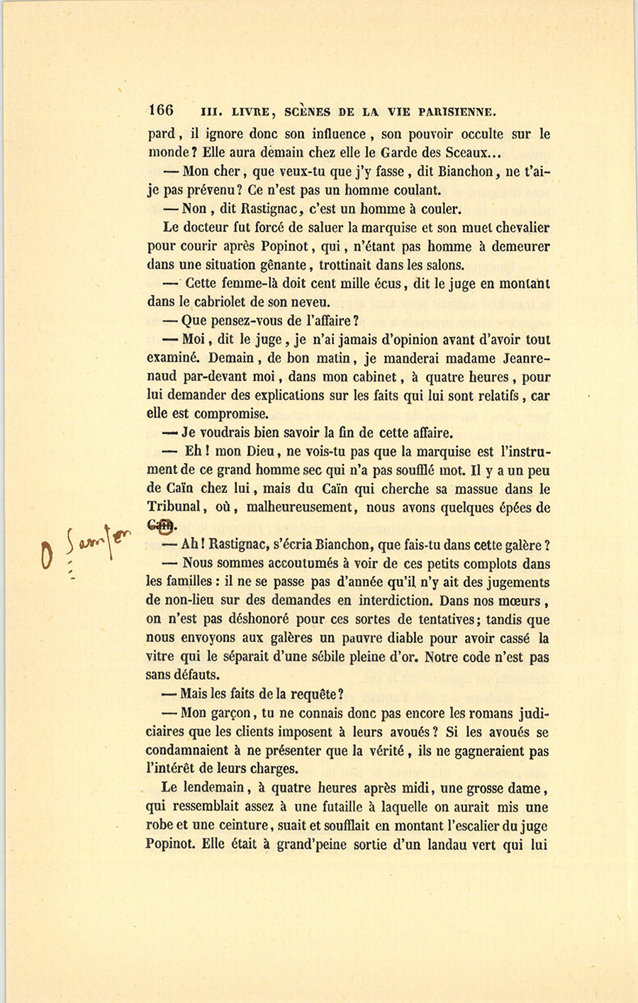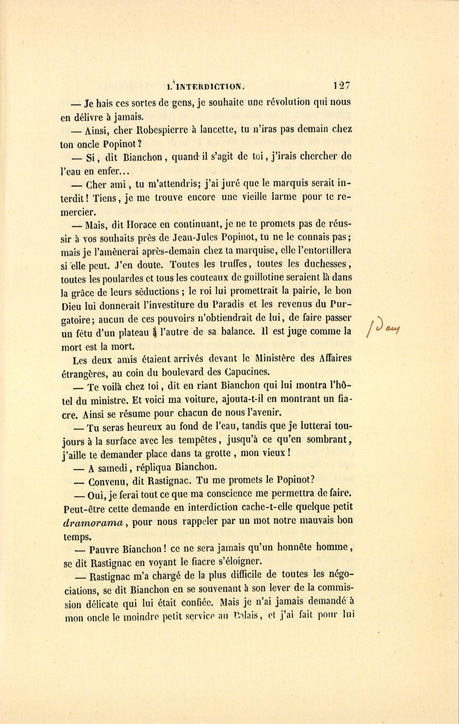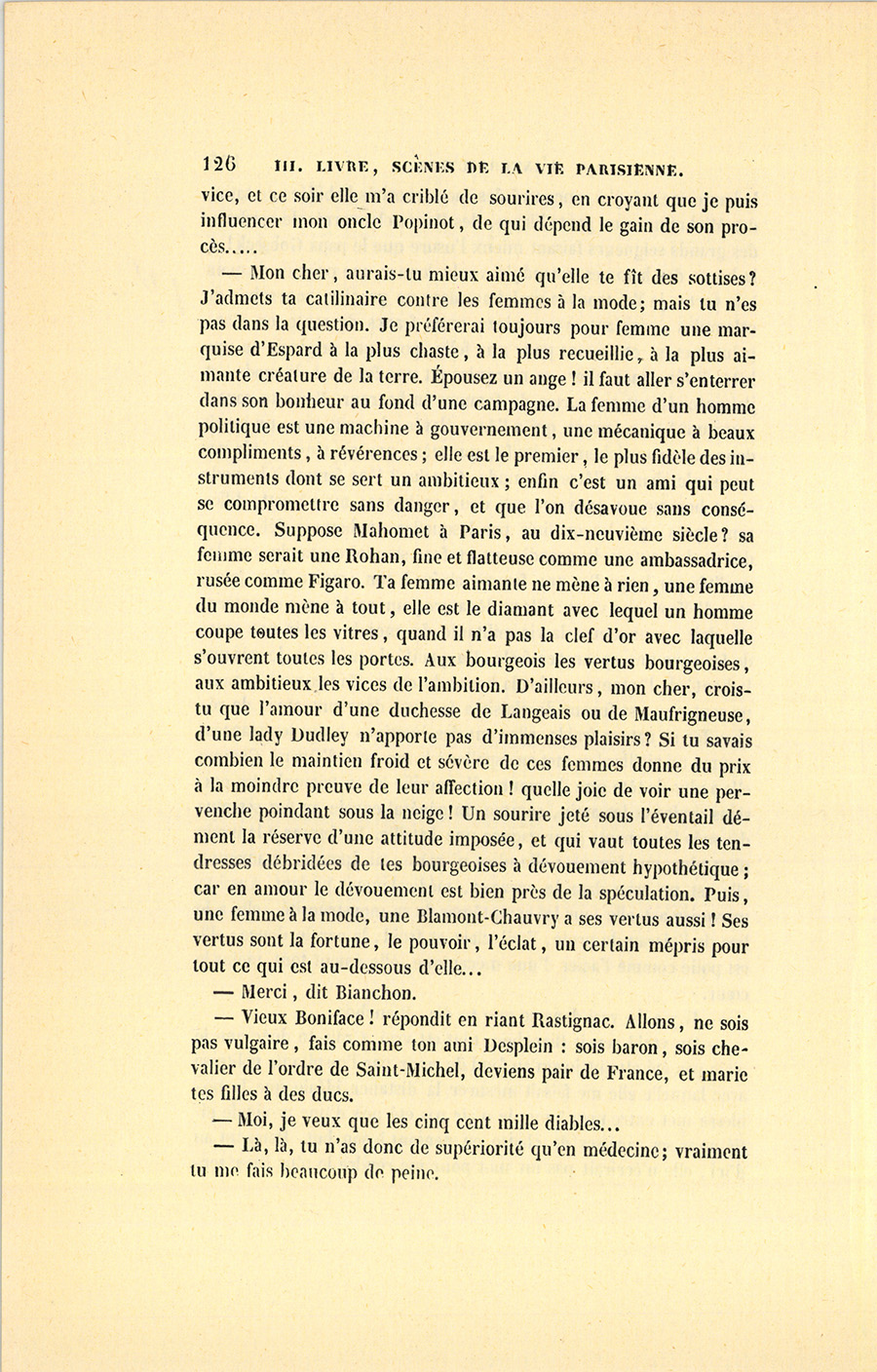 – Rastignac m’a chargé de la plus difficile de toutes les négociations, se dit Bianchon en se souvenant à son lever de la commission délicate qui lui était confiée. Mais je n’ai jamais demandé à mon oncle le moindre petit service au Palais, et j’ai fait pour lui {p. 128} plus de mille visites gratis. D’ailleurs, entre nous, nous ne nous gênons point. Il me dira oui ou non, et tout sera fini.