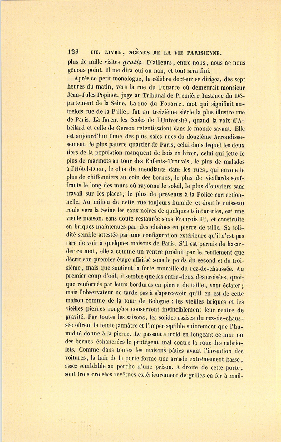 Après ce petit monologue, le célèbre docteur se dirigea, dès sept heures du matin, vers la rue du Fouarre où demeurait monsieur Jean-Jules Popinot, juge au Tribunal de Première Instance du Département de la Seine. La rue du Fouarre, mot qui signifiait autrefois rue de la Paille, fut au treizième siècle la plus illustre rue de Paris. Là furent les écoles de l’Université, quand la voix d’Abeilard et celle de Gerson retentissaient dans le monde savant. Elle est aujourd’hui l’une des plus sales rues du douzième Arrondissement, le plus pauvre quartier de Paris, celui dans lequel les deux tiers de la population manquent de bois en hiver, celui qui jette le plus de marmots au tour des Enfants-Trouvés, le plus de malades à l’Hôtel-Dieu, le plus de mendiants dans les rues, qui envoie le plus de chiffonniers au coin des bornes, le plus de vieillards souffrants le long des murs où rayonne le soleil, le plus d’ouvriers sans travail sur les places, le plus de prévenus à la Police correctionnelle. Au milieu de cette rue toujours humide et dont le ruisseau roule vers la Seine les eaux noires de quelques teintureries, est une vieille maison, sans doute restaurée sous François Ier, et construite en briques maintenues par des chaînes en pierre de taille. Sa solidité semble attestée par une configuration extérieure qu’il n’est pas rare de voir à quelques maisons de Paris. S’il est permis de hasarder ce mot, elle a comme un ventre produit par le renflement que décrit son premier étage affaissé sous le poids du second et du troisième, mais que soutient la forte muraille du rez-de-chaussée. Au premier coup d’œil, il semble que les entre-deux des croisées, quoique renforcés par leurs bordures en pierre de taille, vont éclater ; mais l’observateur ne tarde pas à s’apercevoir qu’il en est de cette maison comme de la tour de Bologne : les vieilles briques et les vieilles pierres rongées conservent invinciblement leur centre de gravité. Par toutes les saisons, les solides assises du rez-de-chaussée offrent la teinte jaunâtre et l’imperceptible suintement que l’humidité donne à la pierre. Le passant a froid en longeant ce mur où des bornes échancrées le protègent mal contre la roue des cabriolets. Comme dans toutes les maisons bâties avant l’invention des voitures, la baie de la porte forme une arcade extrêmement basse, assez semblable au porche d’une prison. À droite de cette porte, sont trois croisées revêtues extérieurement de grilles en fer à {p. 129} mailles si serrées qu’il est impossible aux curieux de voir la destination intérieure des pièces humides et sombres, tant d’ailleurs les vitres sont sales et poudreuses ; à gauche, sont deux autres croisées semblables dont une parfois ouverte permet d’apercevoir le portier, sa femme et ses enfants grouillant, travaillant, cuisinant, mangeant et criant au milieu d’une salle planchéiée, boisée où tout tombe en lambeaux et où l’on descend par deux marches, profondeur qui semble indiquer le progressif exhaussement du pavé parisien. Si, par un jour de pluie, quelque passant s’abrite sous la longue voûte à solives saillantes et blanchies à la chaux qui mène de la porte à l’escalier, il lui est difficile de ne pas contempler le tableau que présente l’intérieur de cette maison. À gauche, se trouve un jardinet carré qui ne permet pas de faire plus de quatre enjambées en tout sens, jardin à terre noire où il existe des treillages sans pampres, où, à défaut de végétation, il vient à l’ombre de deux arbres, des papiers, de vieux linges, des tessons, des gravats tombés du toit ; terre infertile où le temps a jeté sur les murs, sur le tronc des arbres et sur leurs branches une poudreuse empreinte semblable à de la suie froide. Les deux corps de logis en équerre dont se compose la maison, tirent leur jour de ce jardinet entouré par deux maisons voisines bâties en colombage, décrépites, menaçant ruine, où se voit à chaque étage quelque grotesque attestation de l’état exercé par le locataire. Ici de longs bâtons supportent d’immenses écheveaux de laine teinte qui sèchent ; là sur des cordes se balancent des chemises blanchies ; plus haut des volumes endossés montrent sur un ais leurs tranches fraîchement marbrées ; les femmes chantent, les maris sifflent, les enfants crient ; le menuisier scie ses planches, un tourneur en cuivre fait grincer son métal ; toutes les industries s’accordent pour produire un bruit que le nombre des instruments rend furibond. Le système général de la décoration intérieure de ce passage, qui n’est ni une cour, ni un jardin, ni une voûte, et qui tient de toutes ces choses, consiste en piliers de bois posés sur des dés en pierre, et qui figurent des ogives. Deux arcades donnent sur le jardinet ; deux autres qui font face à la porte cochère, laissent voir un escalier de bois dont la rampe fut jadis une merveille de serrurerie tant le fer y affecte des formes bizarres, et dont les marches usées tremblent sous le pied. Les portes de chaque appartement ont des chambranles bruns de crasse, de graisse, de poussière, et sont garnies de doubles portes revêtues de velours d’Utrecht semées de clous {p. 130} dédorés disposés en losanges. Ces restes de splendeur annoncent que, sous Louis XIV, cette maison était habitée par quelque conseiller au Parlement, par de riches ecclésiastiques ou par quelque trésorier des Parties Casuelles. Mais ces vestiges de l’ancien luxe attirent un sourire sur les lèvres par un naïf contraste entre le présent et le passé. Monsieur Jean-Jules Popinot demeurait au premier étage de cette maison où l’obscurité naturelle aux premiers étages des maisons parisiennes était redoublée par l’étroitesse de la rue. Ce vieux logis était connu de tout le douzième Arrondissement, auquel la Providence avait donné ce magistrat comme elle donne une plan